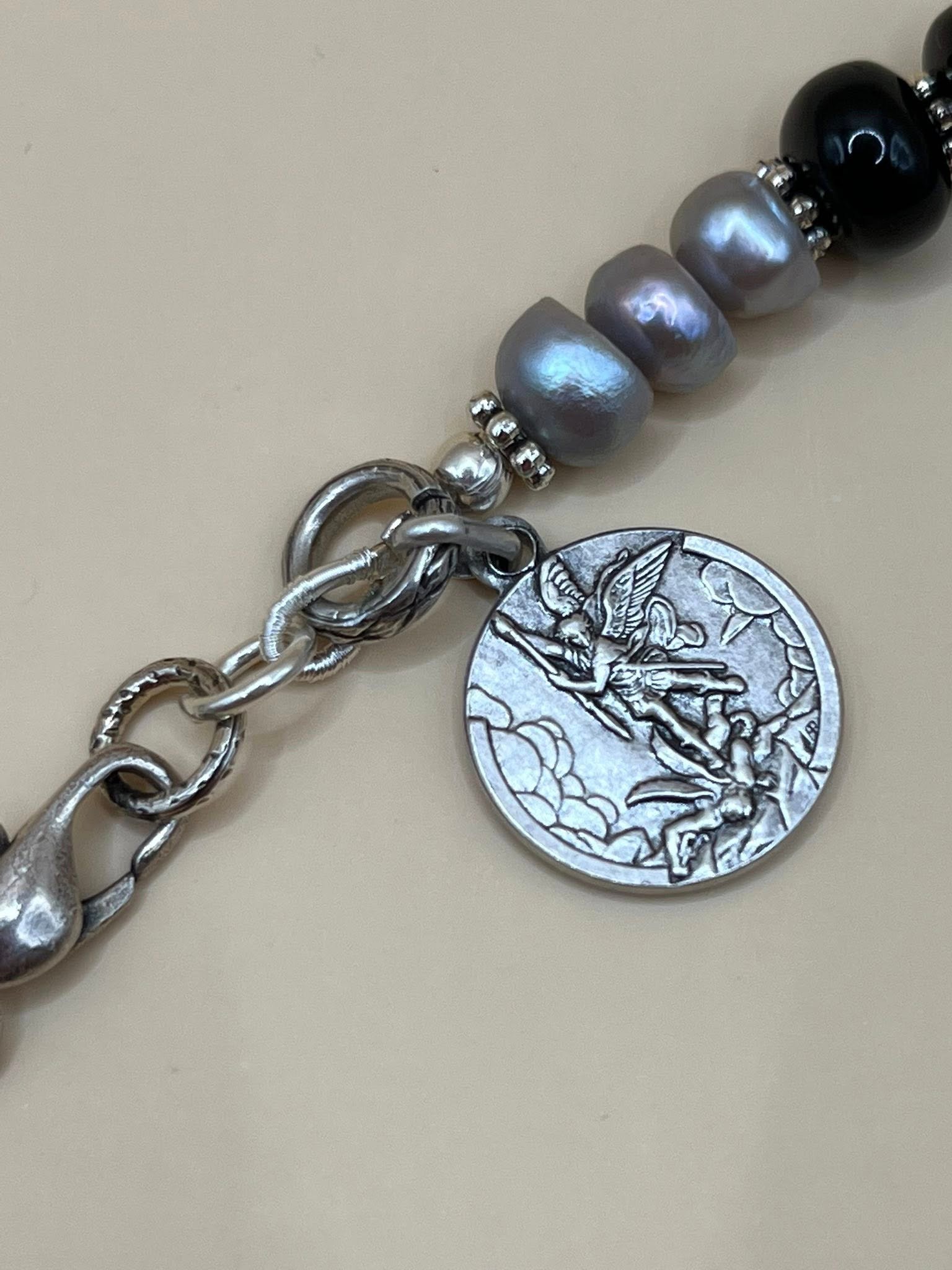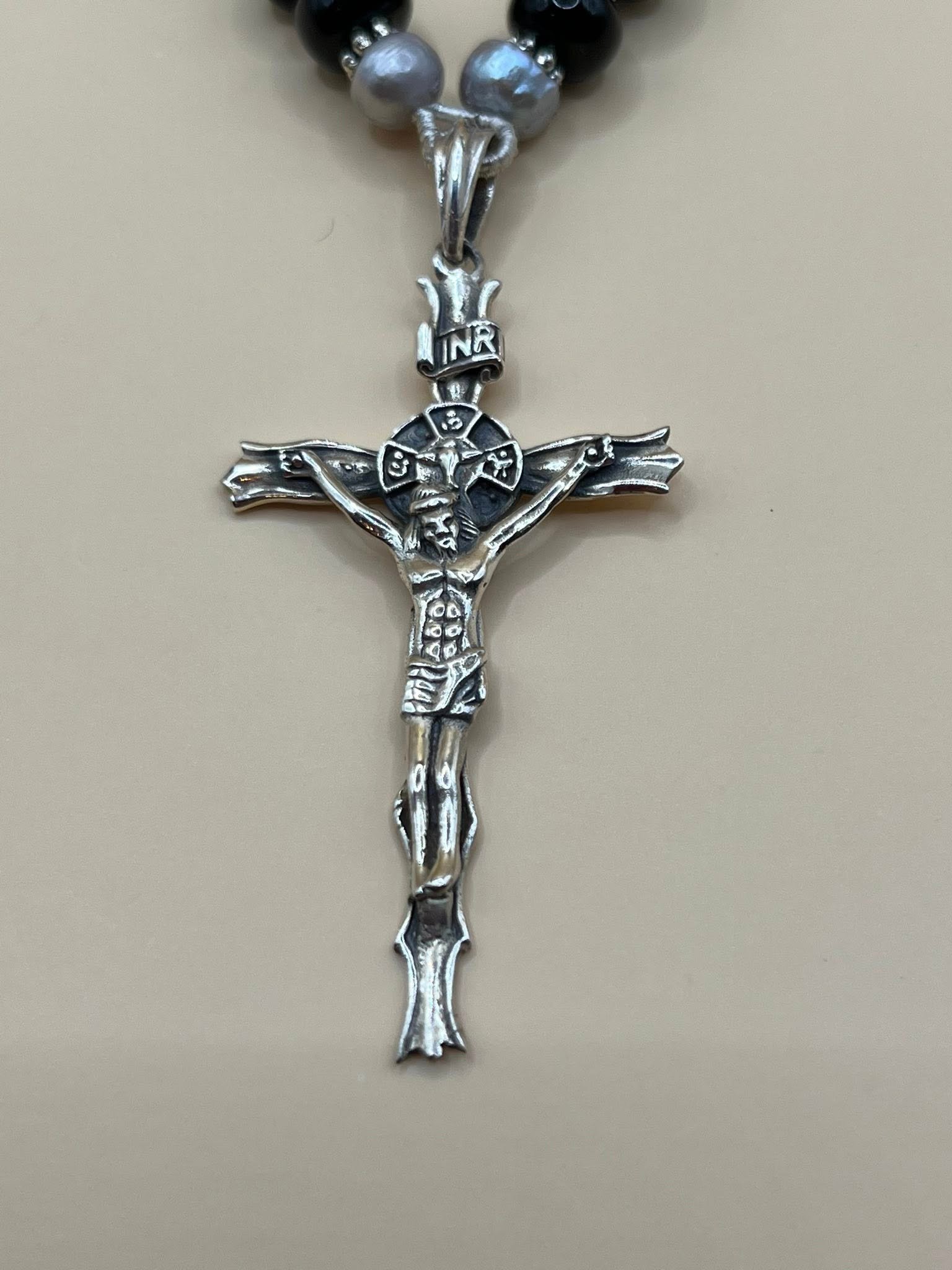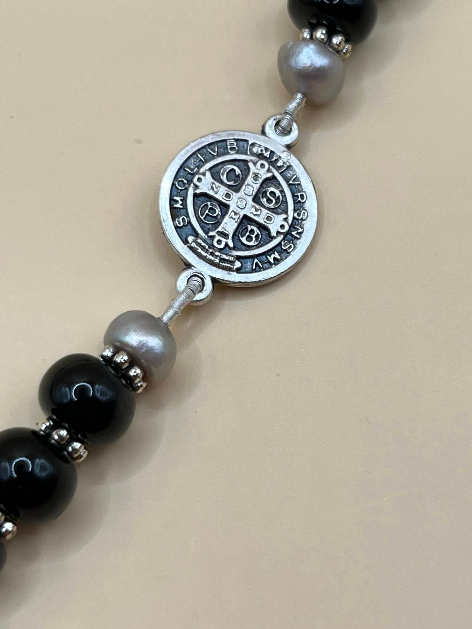 Collier Unique Onyx et perles de culture Croix du Christ en argent 925/eme Médailles de Saint Benoît et de l’Archange Mikael plaquées argent Longueur : 65cm
