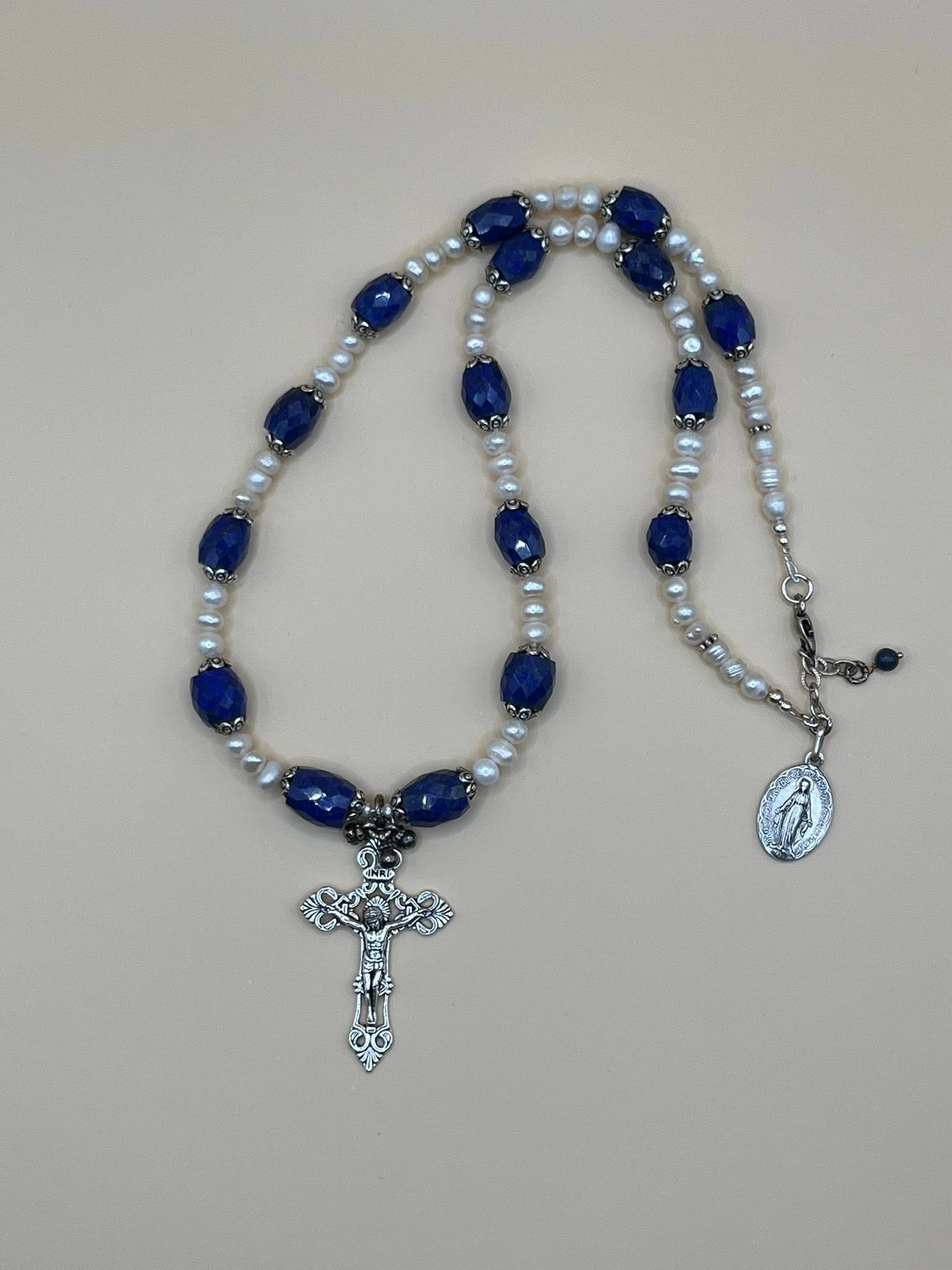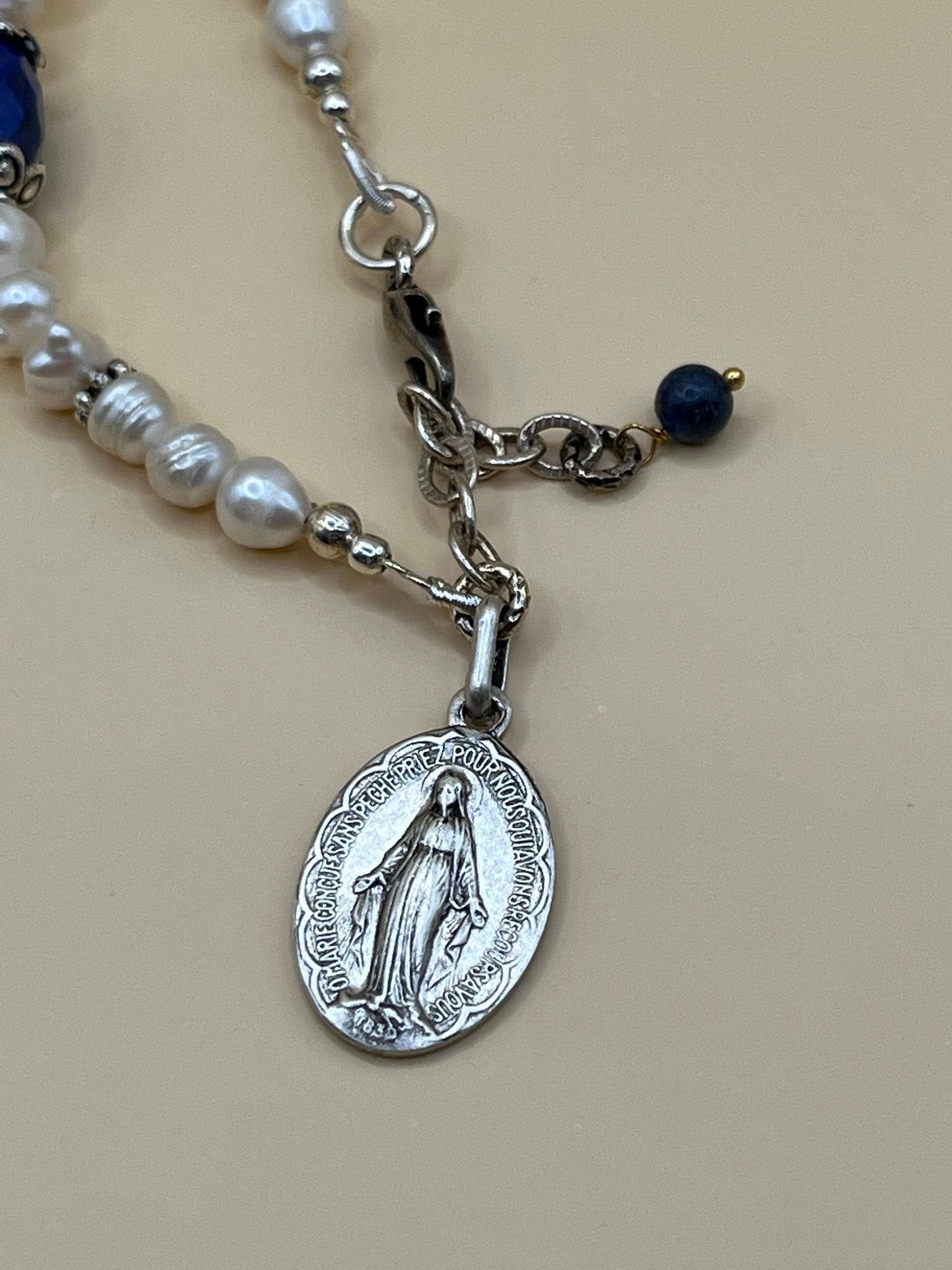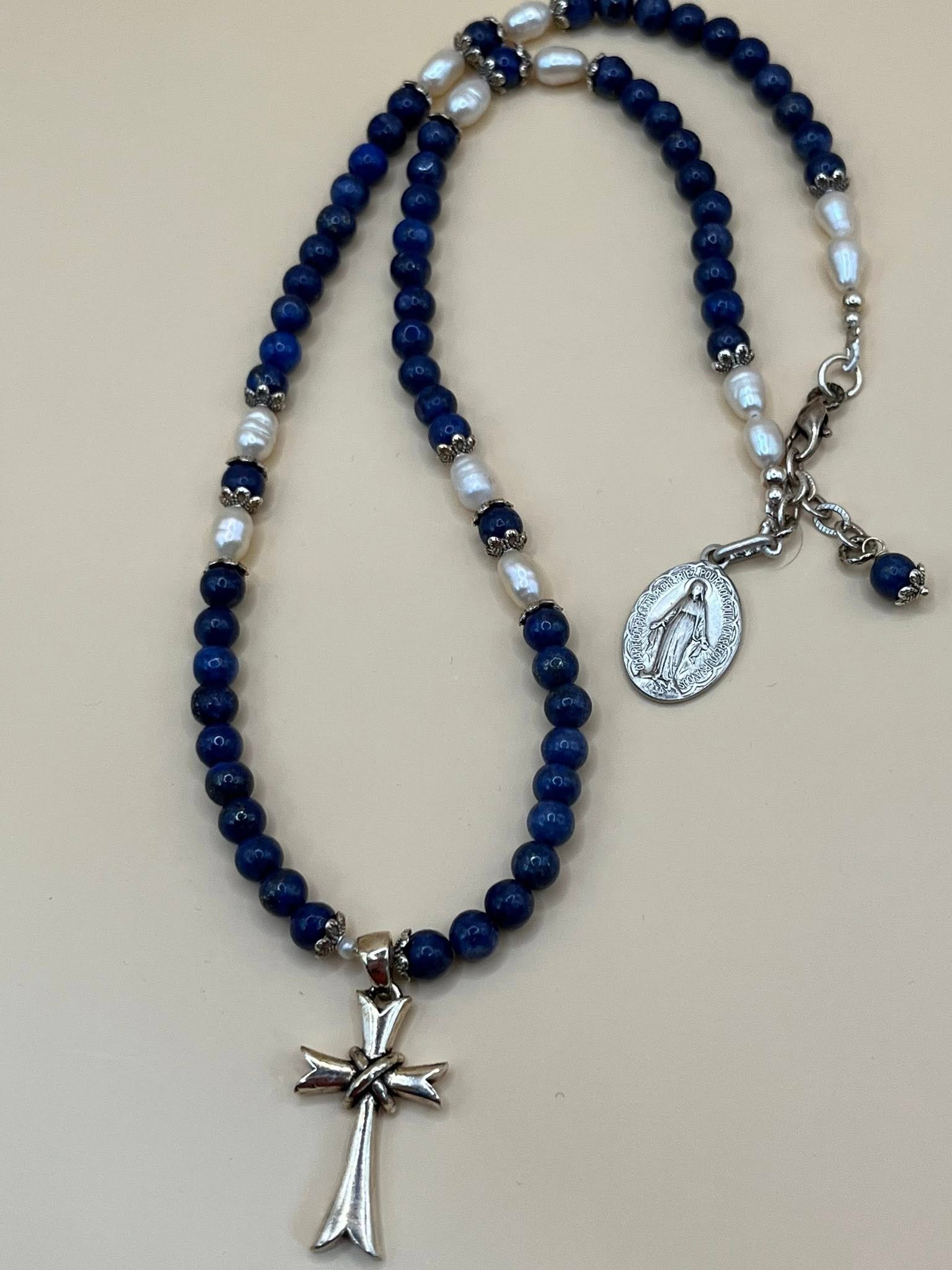 Collier unique En lapis-lazuli et perles de culture Croix du Christ et médaille de la Vierge Longueur : 50cm
