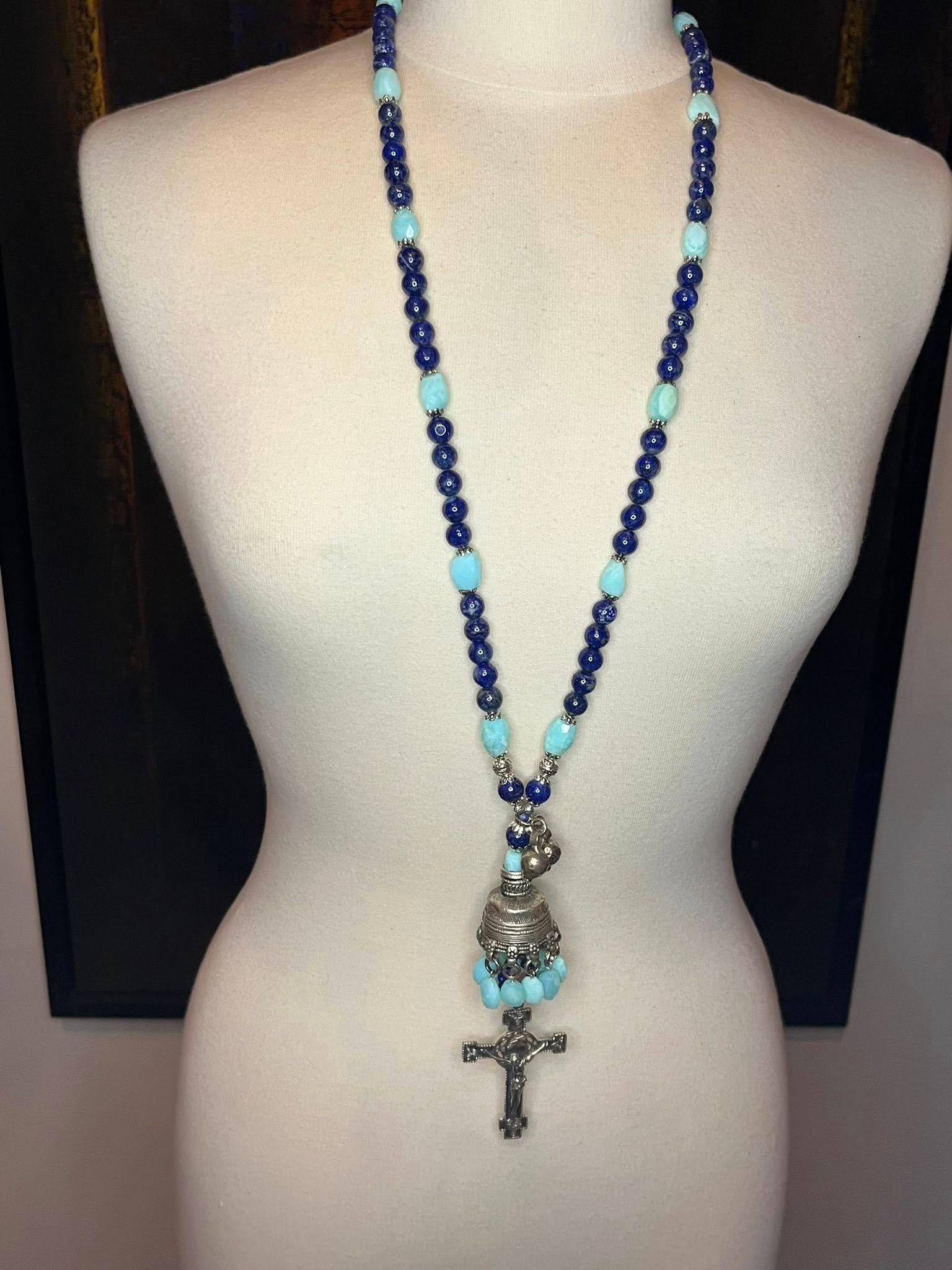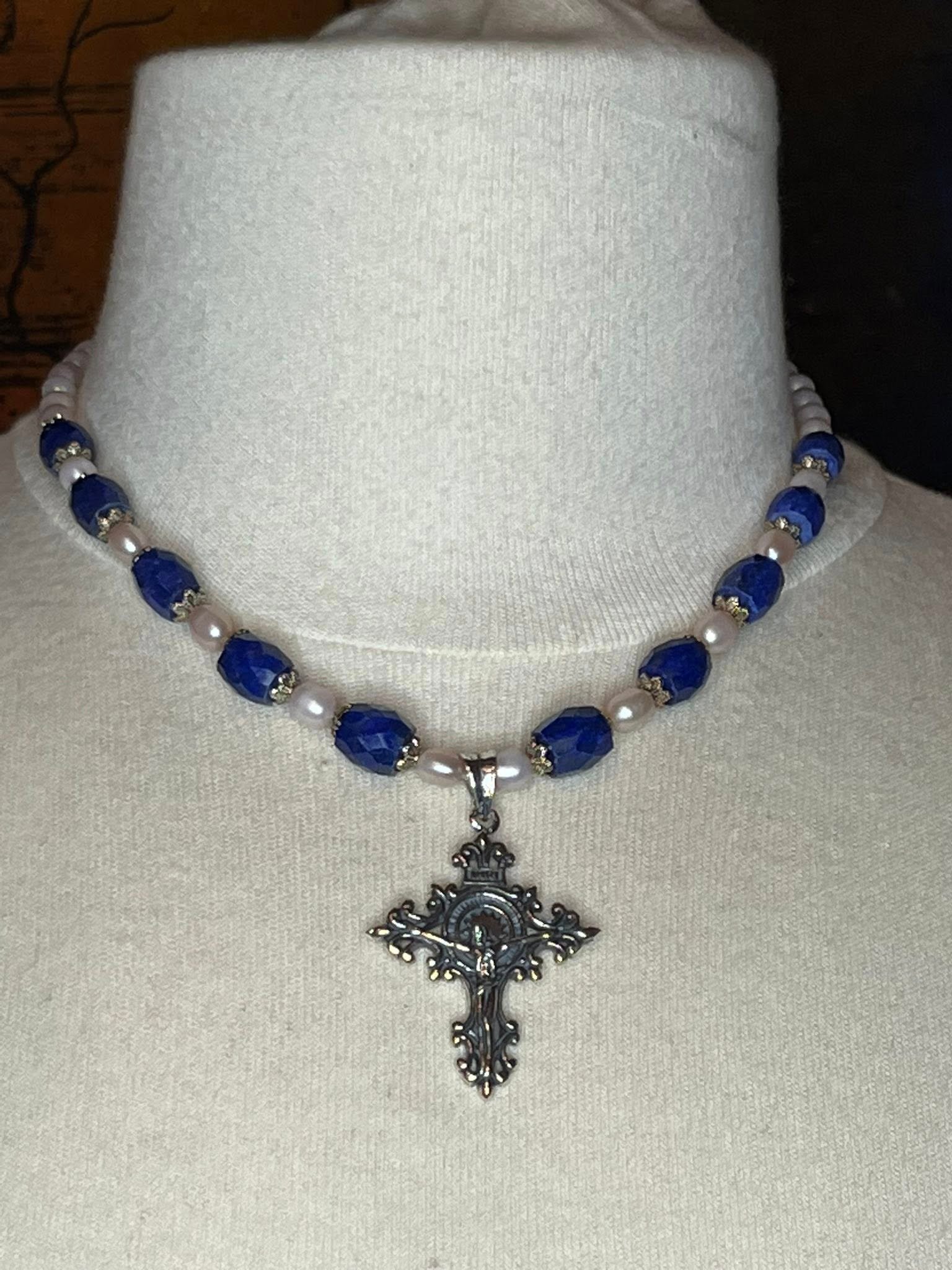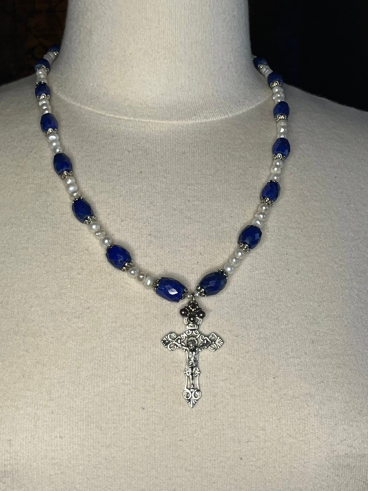 Collier unique En lapis-lazuli et perles de culture Croix du Christ et médaille de la Vierge Longueur : 50cm