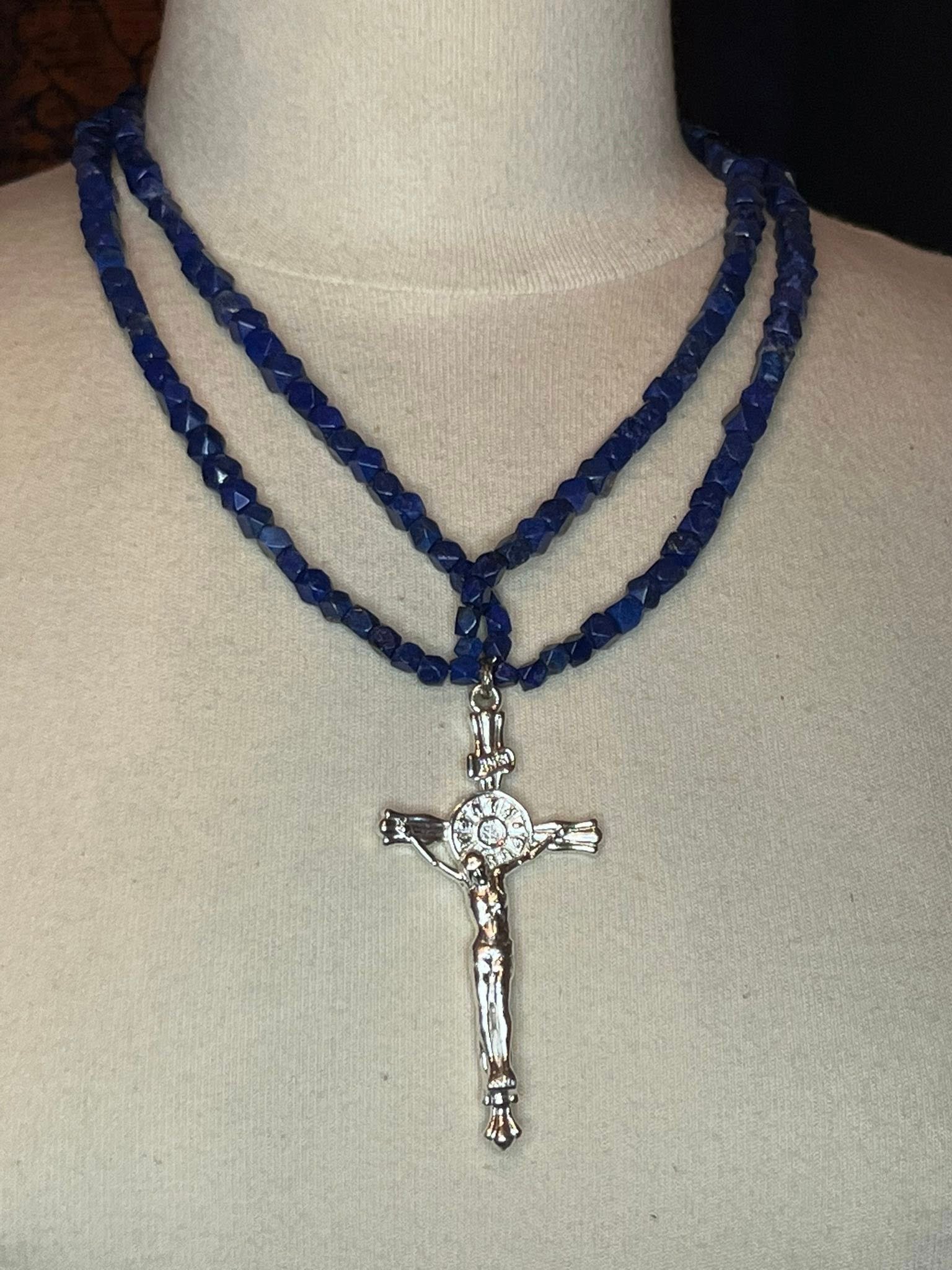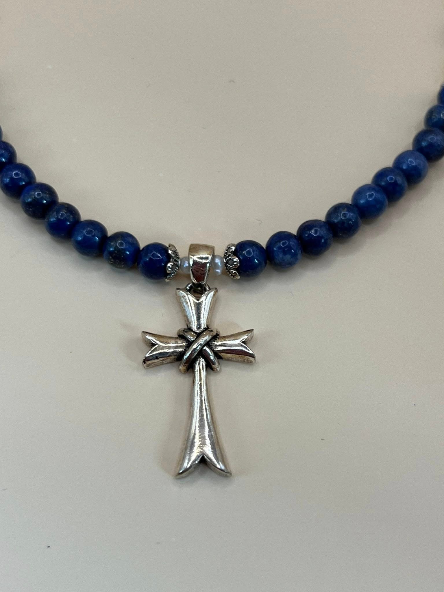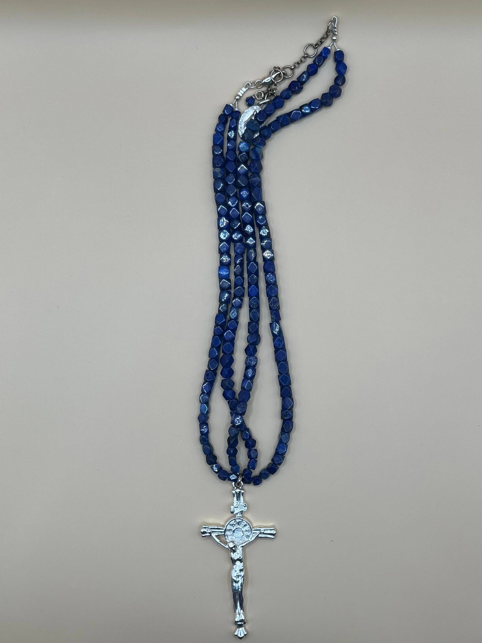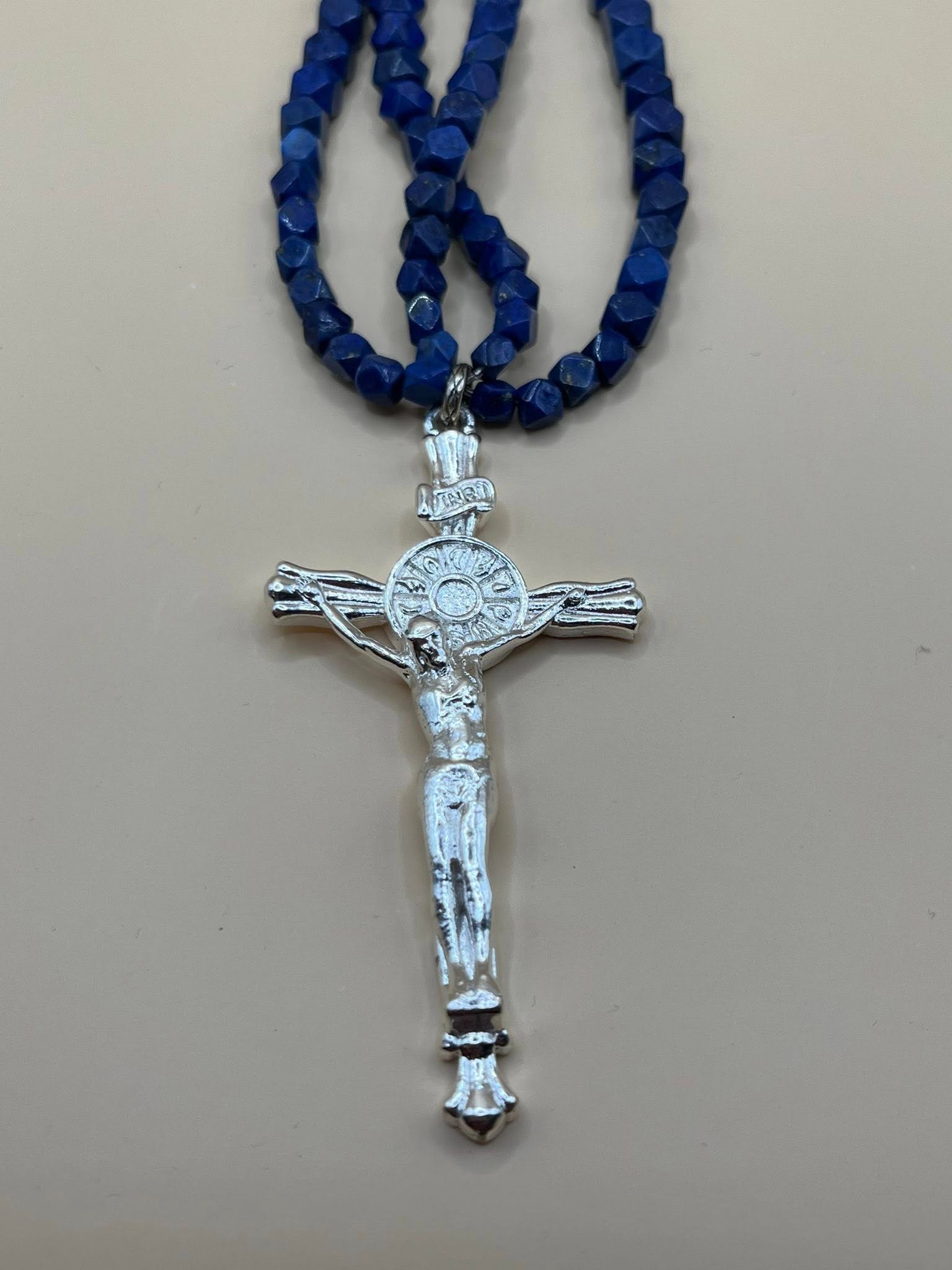 Collier unique En lapis-lazuli Croix du Christ argentée Longueur : 50cm