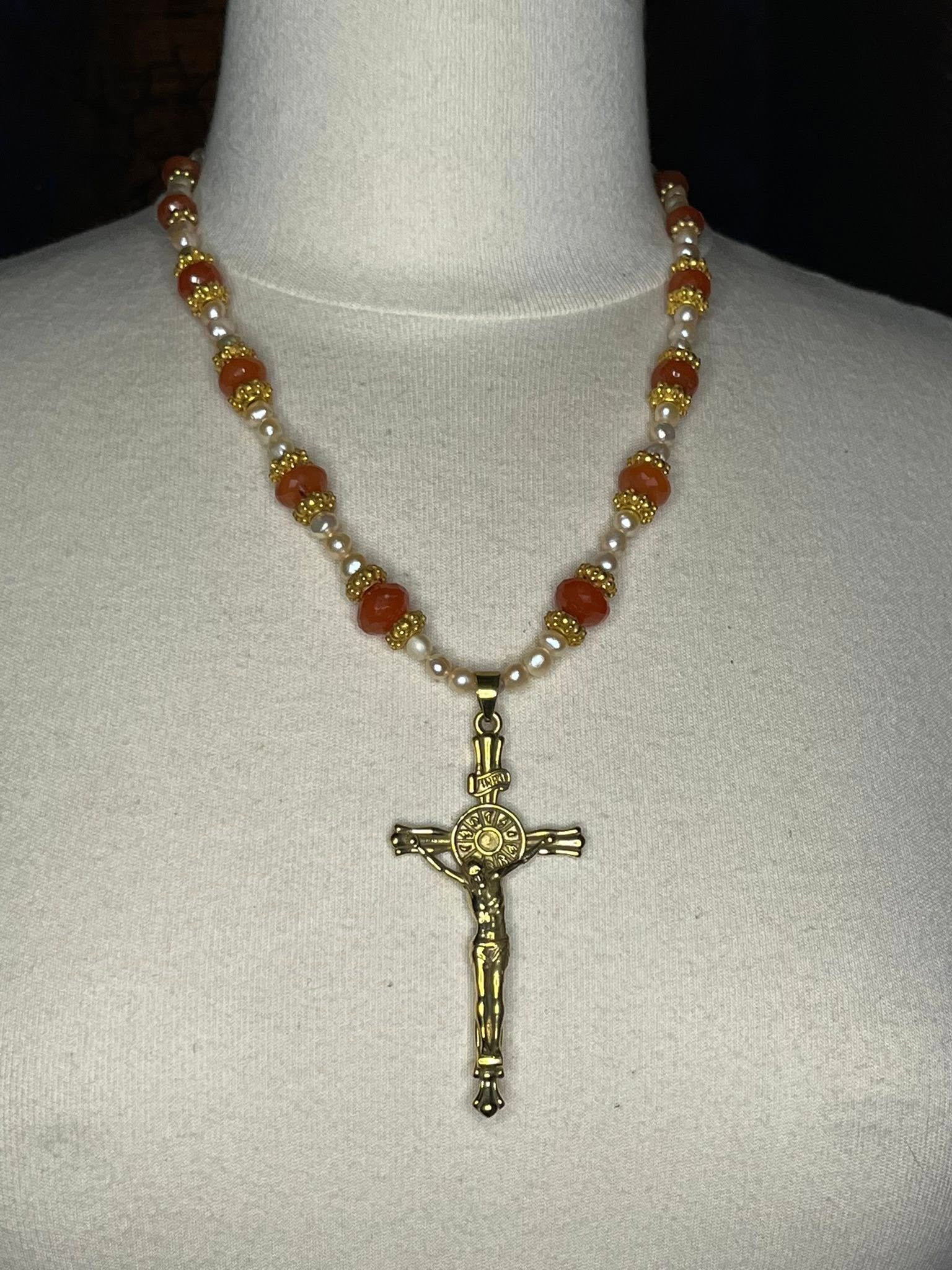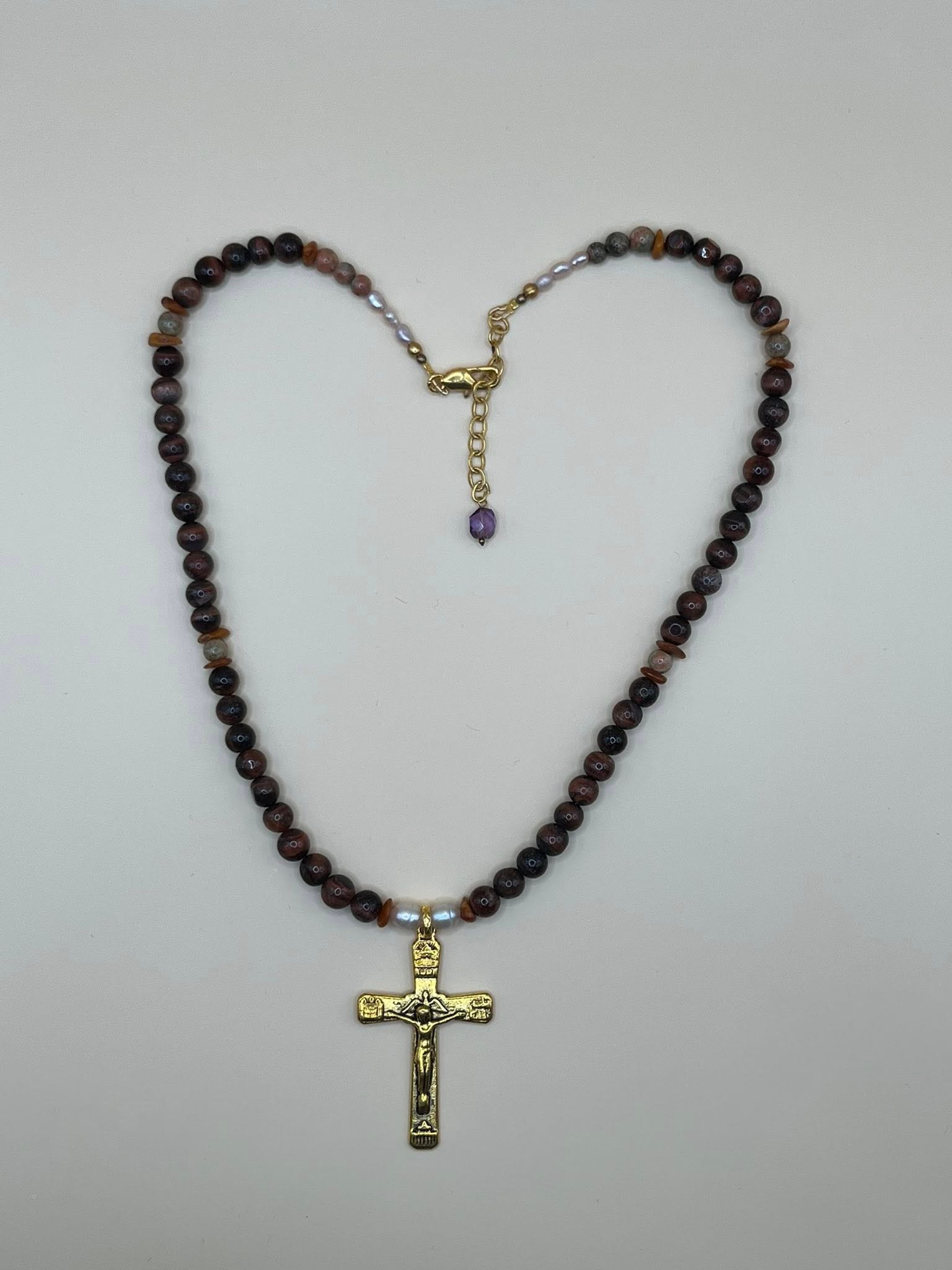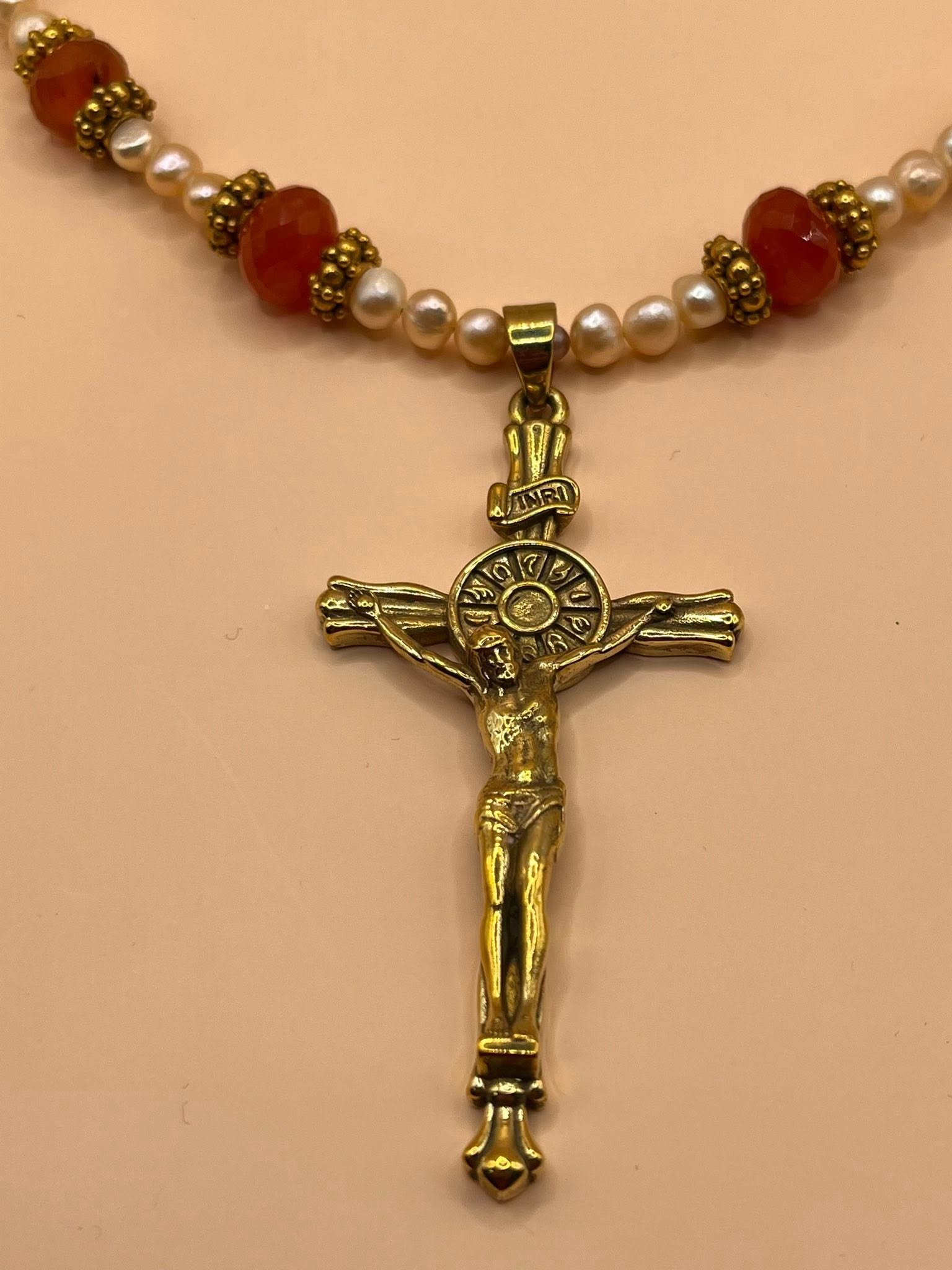 Collier unique Pierres : cornaline et perles de culture Améthyste en fermoir Croix du Christ en laiton brossé Fermoir doré à l’or fin Longueur : 52cm