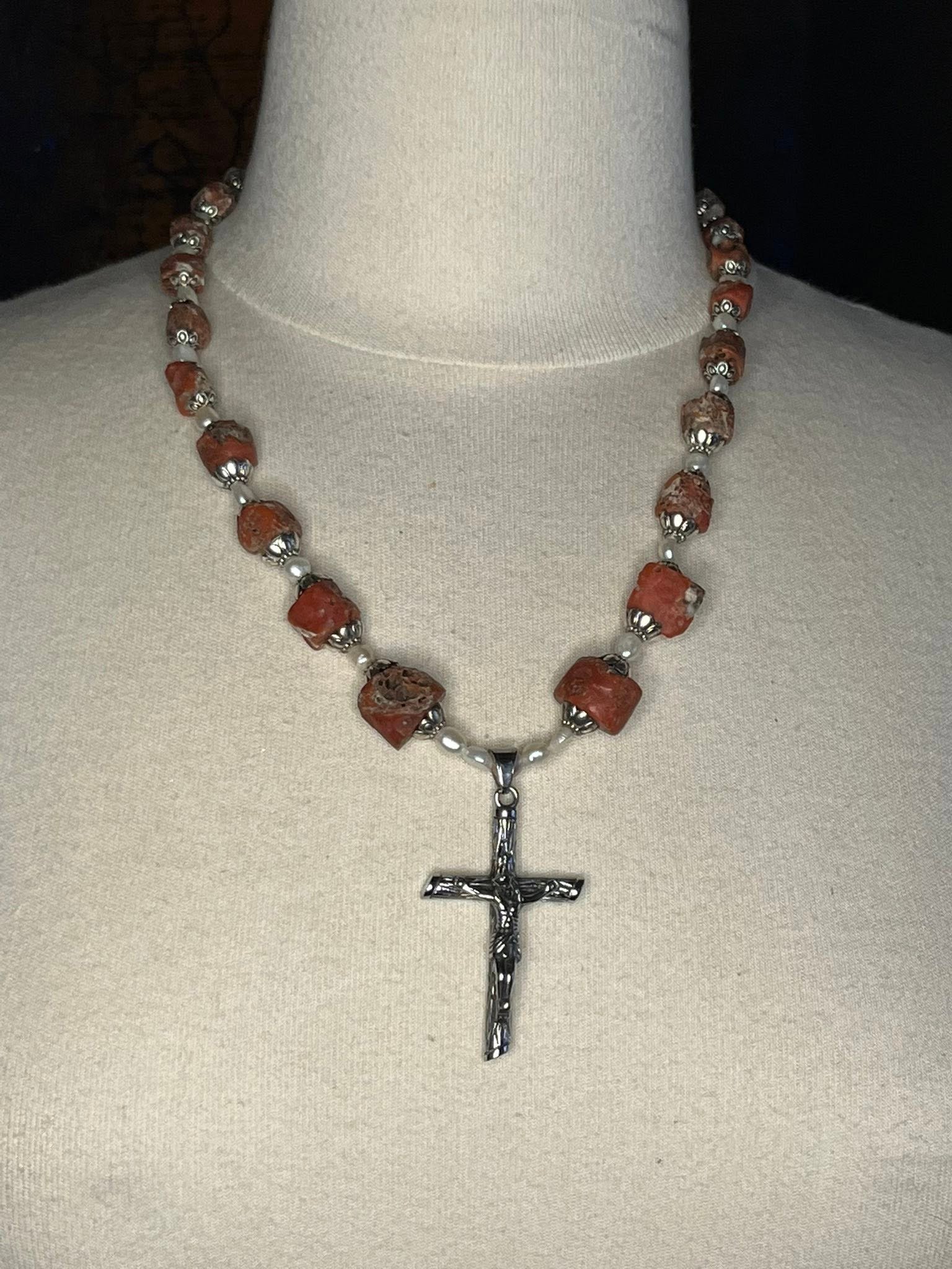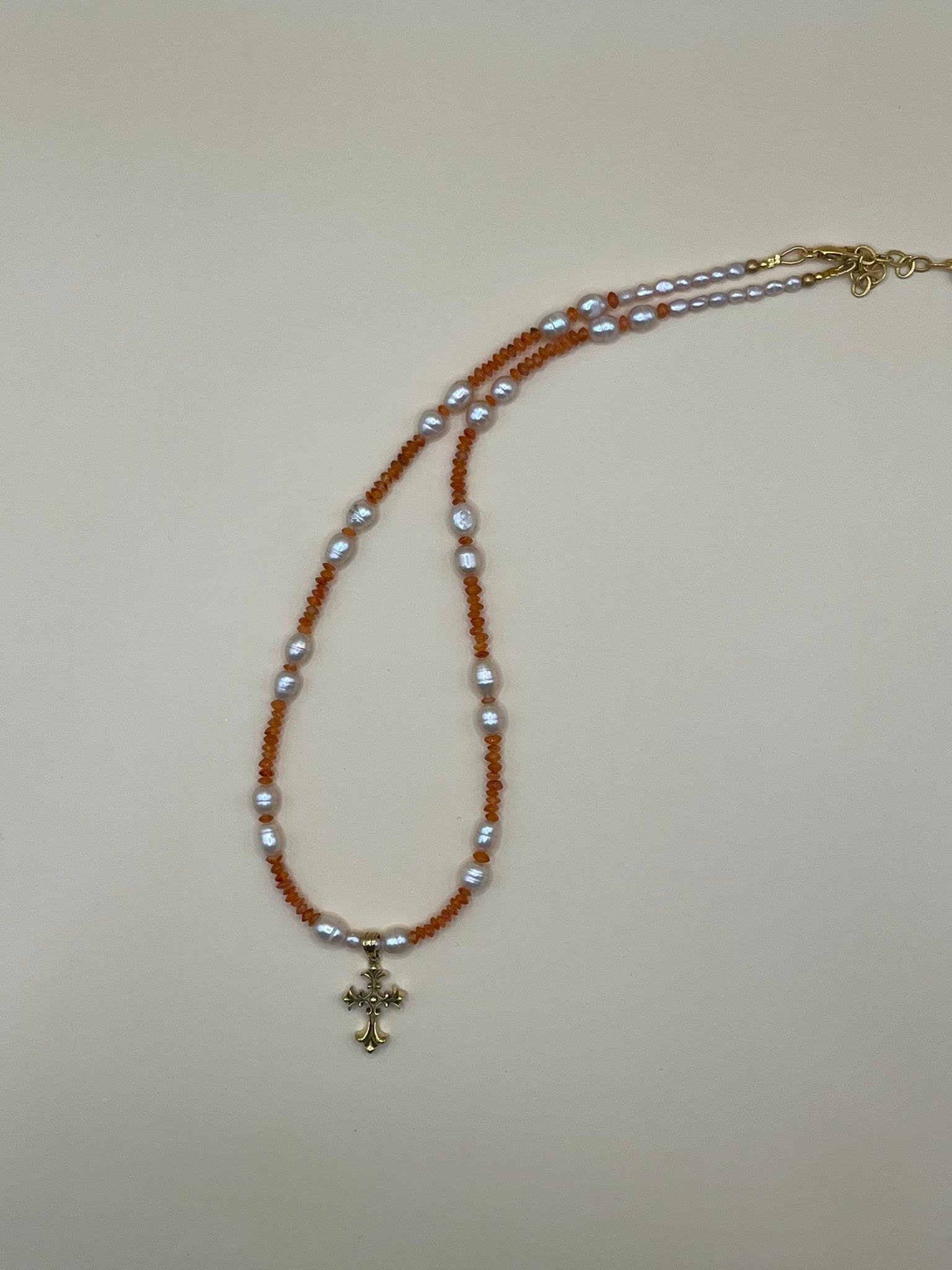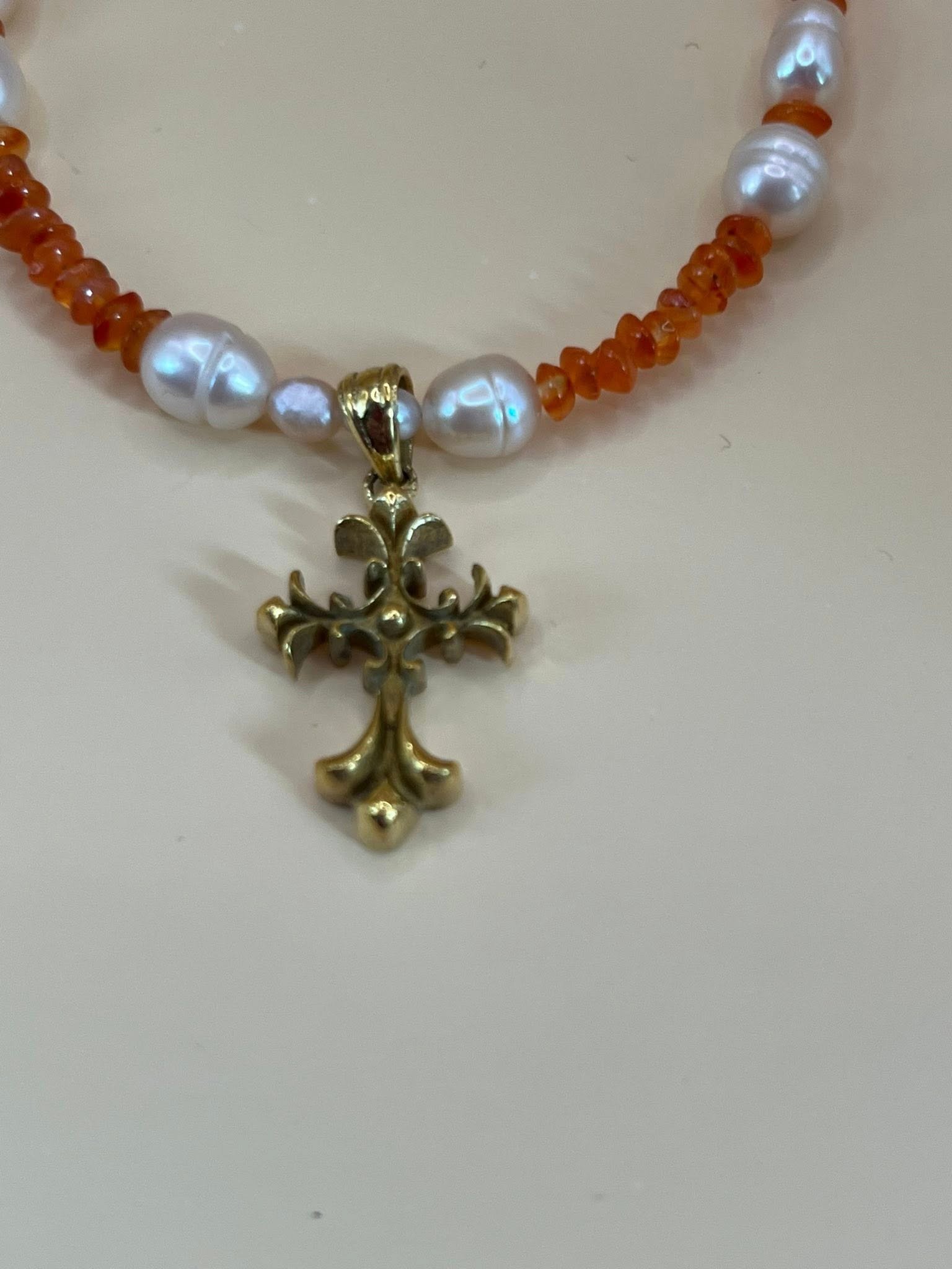 Collier unique Pierres : cornaline et perles de culture Améthyste en fermoir Croix du Christ en laiton brossé Fermoir doré à l’or fin Longueur : 52cm
