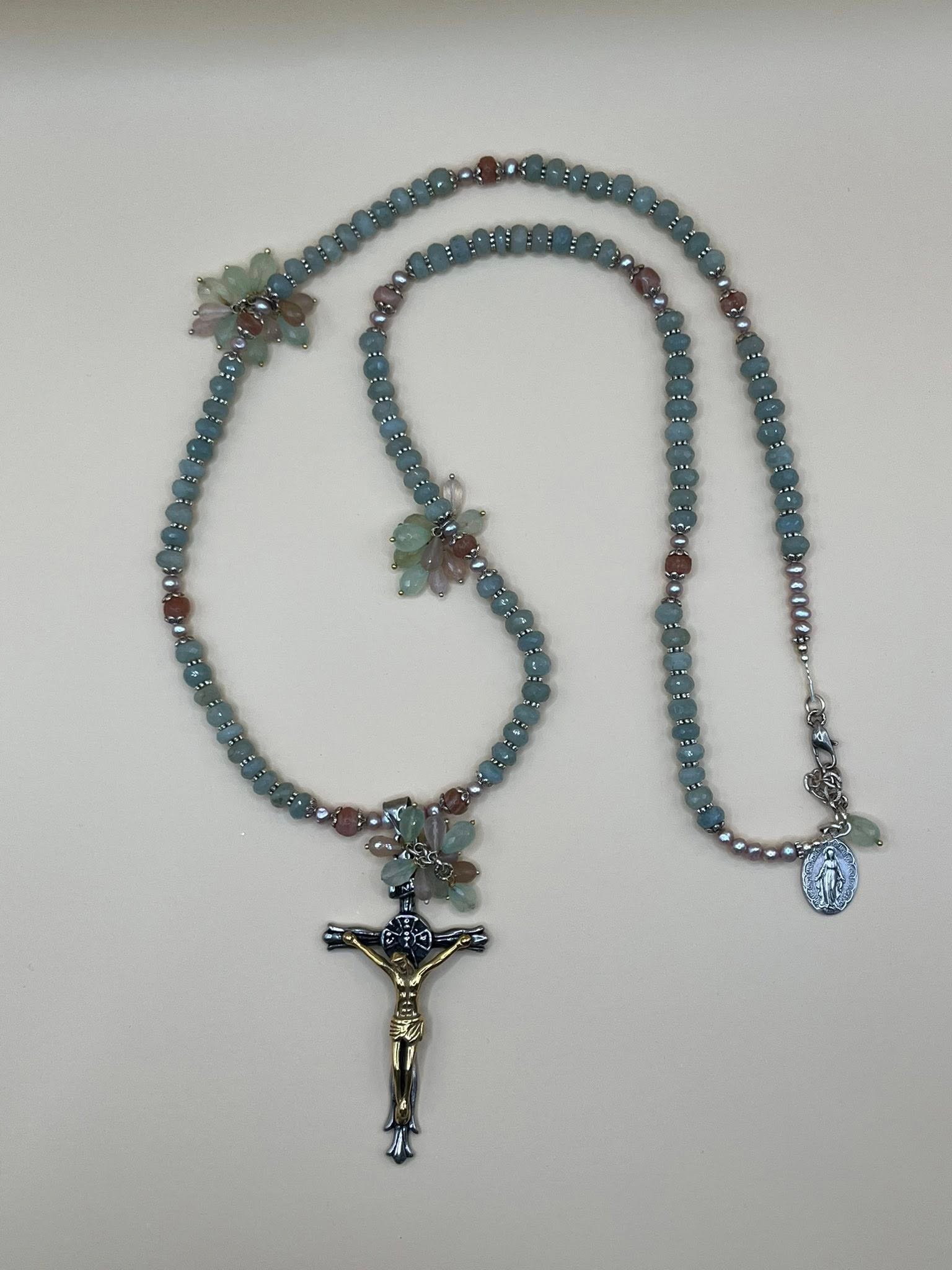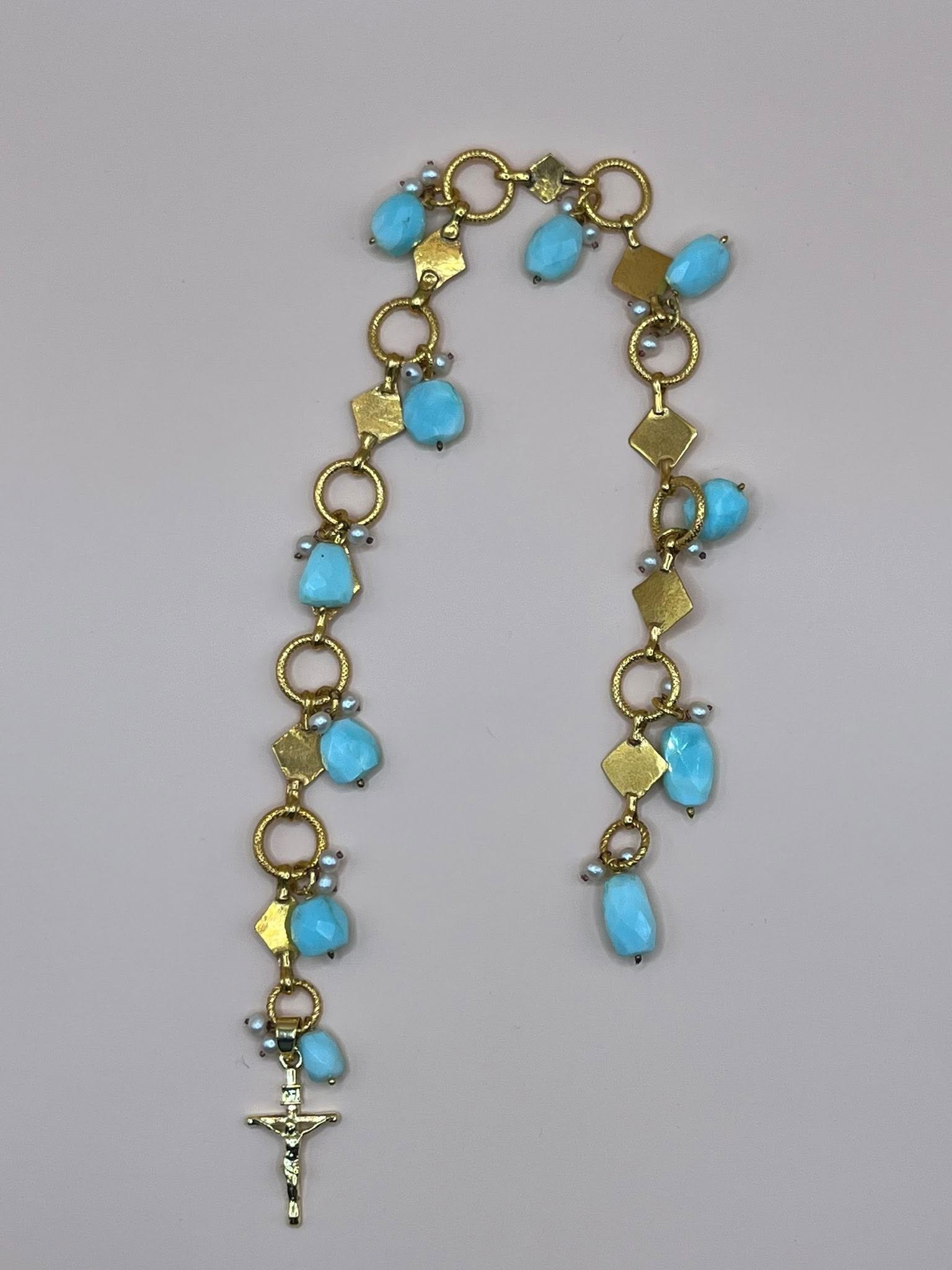 Dizainier Aigue marine, perle de culture Ce Dizainier est créé sur des pendentifs indiens antiques dorés à l’or fin 24 carats Christ doré