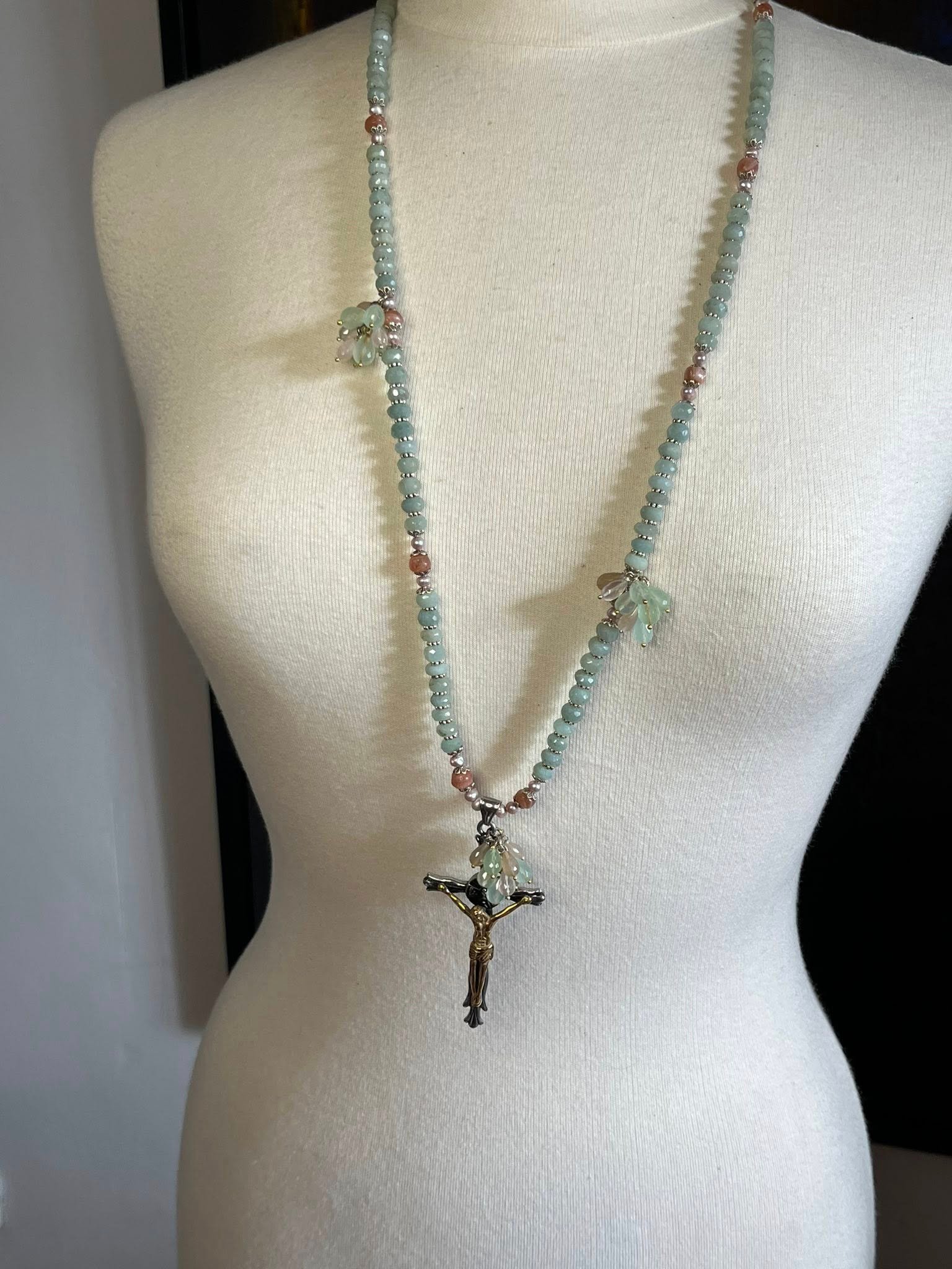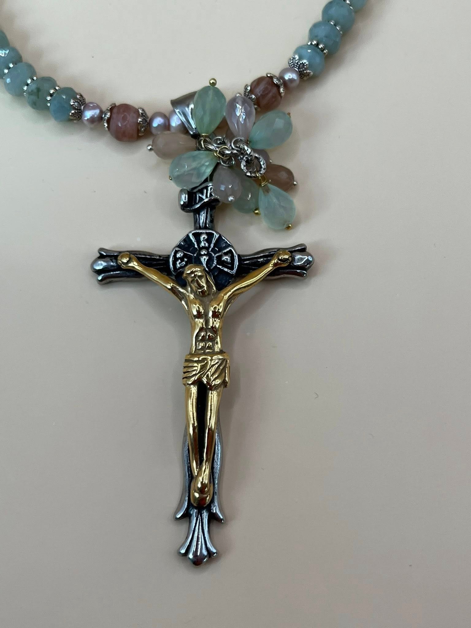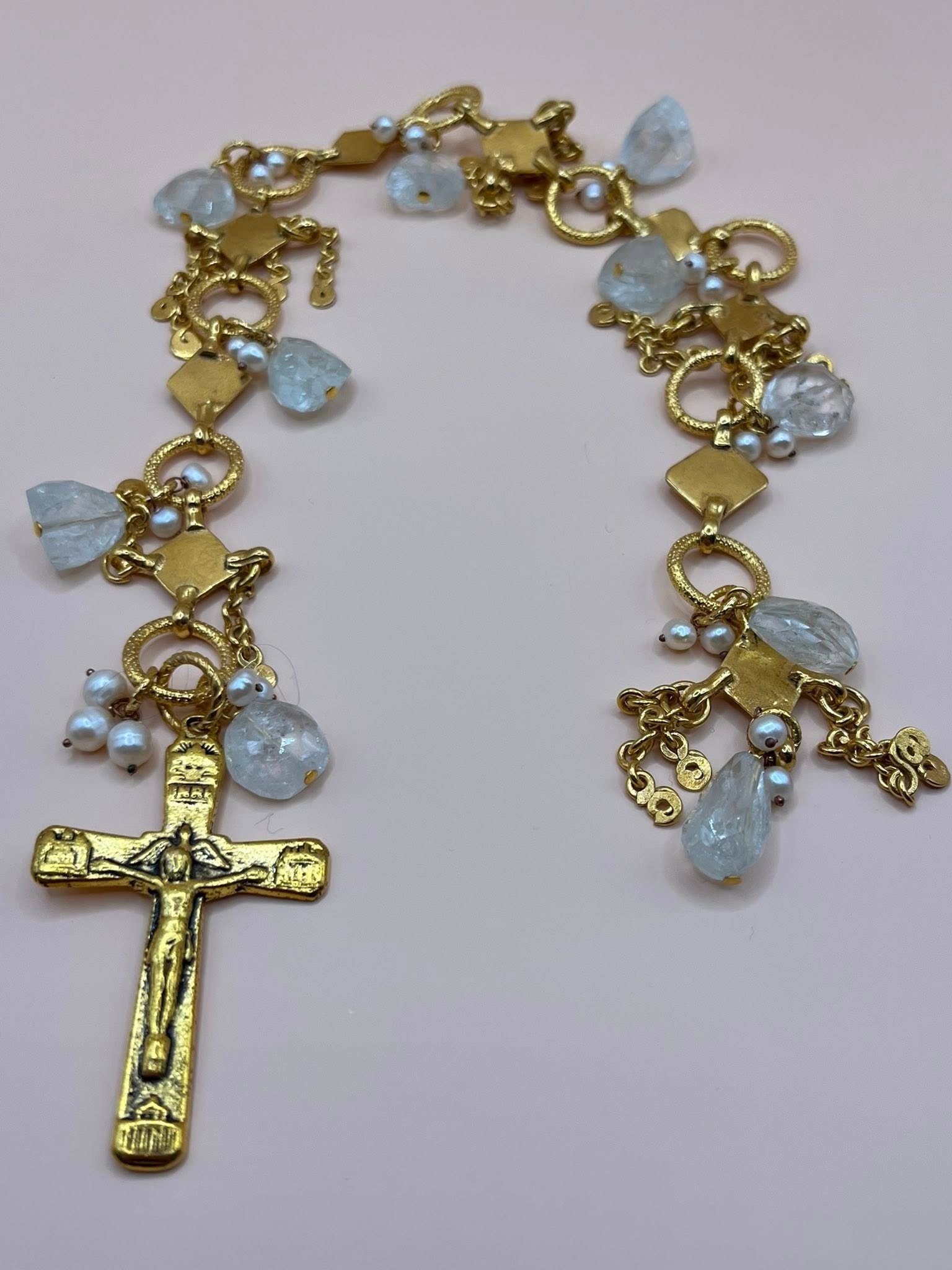 Sautoir exceptionnel Pierres : aigue-marine, pierre de sable, briolettes de quartz rose, calcédoine bleutée et perles de culture Croix du Christ en inox et dorure Longueur : 90cm