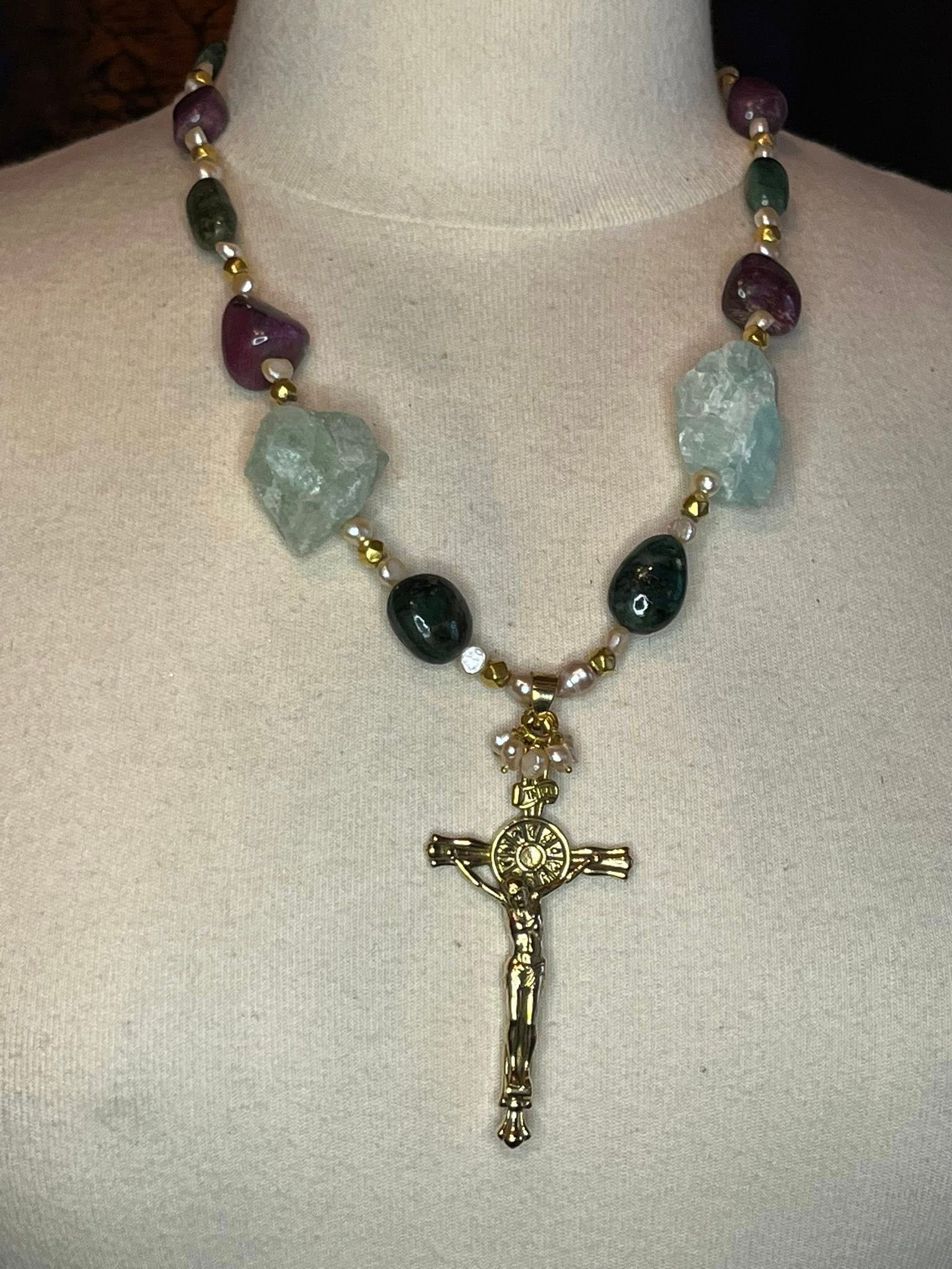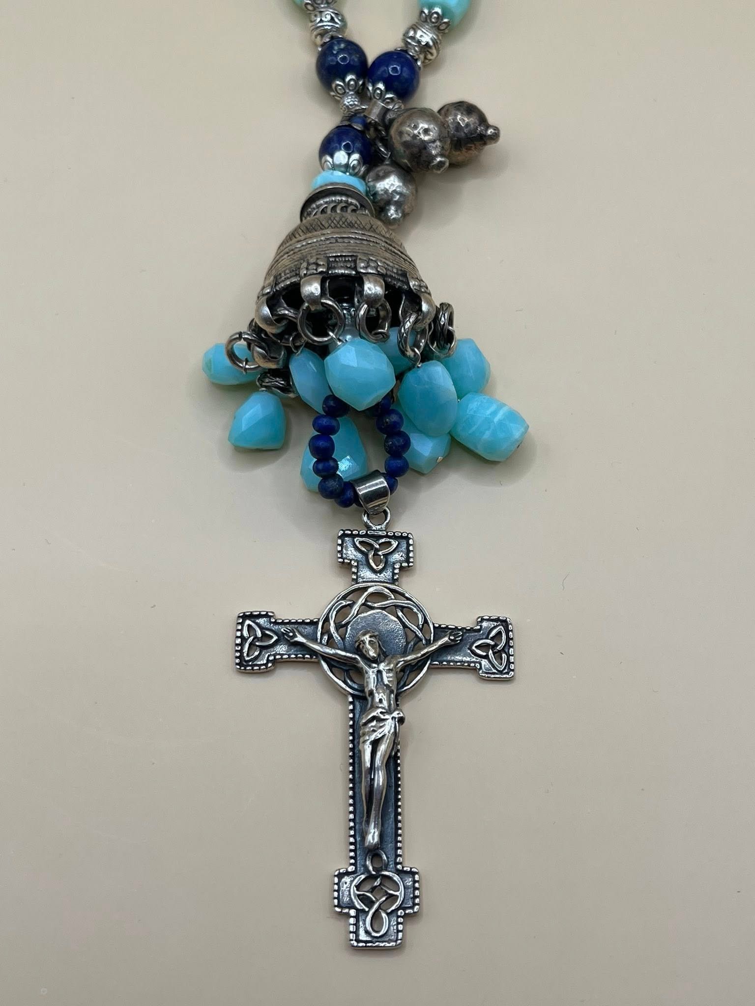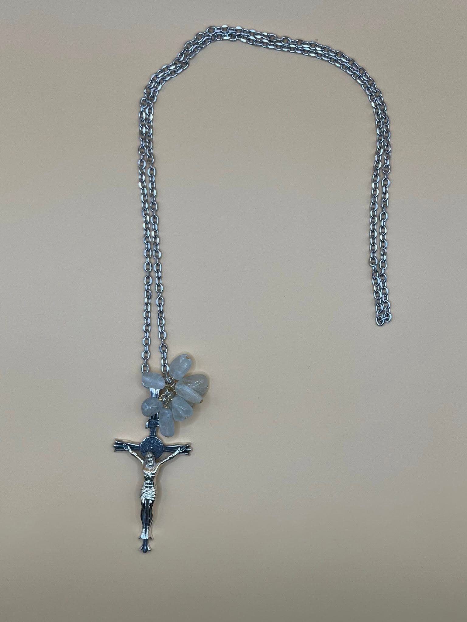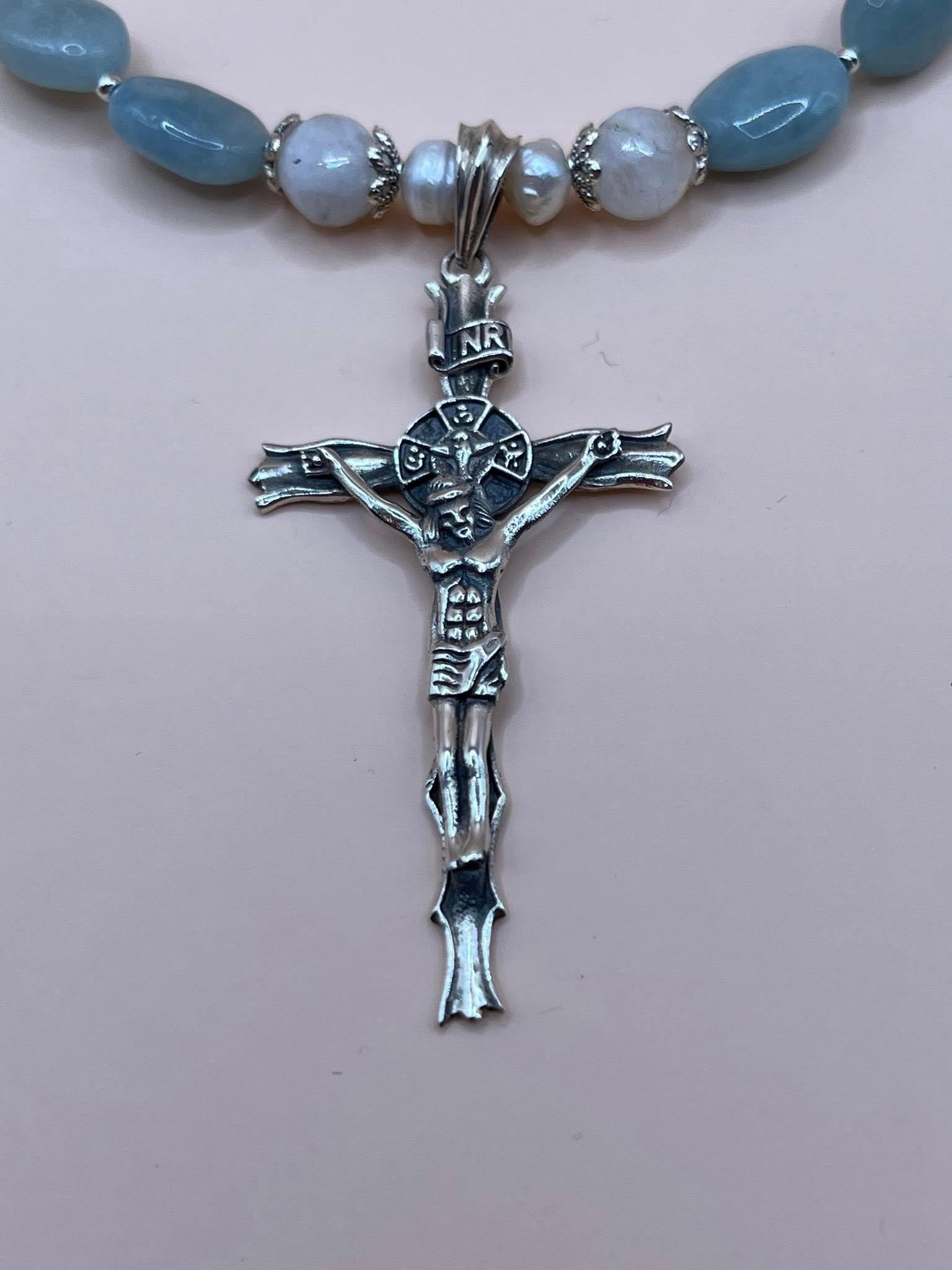 Sautoir exceptionnel Pierres : aigue-marine, pierre de sable, briolettes de quartz rose, calcédoine bleutée et perles de culture Croix du Christ en inox et dorure Longueur : 90cm