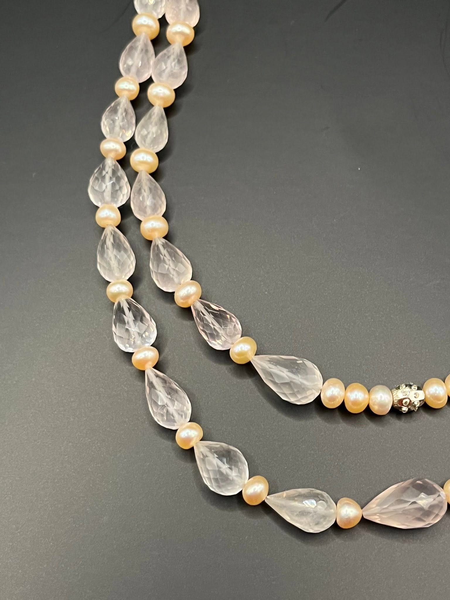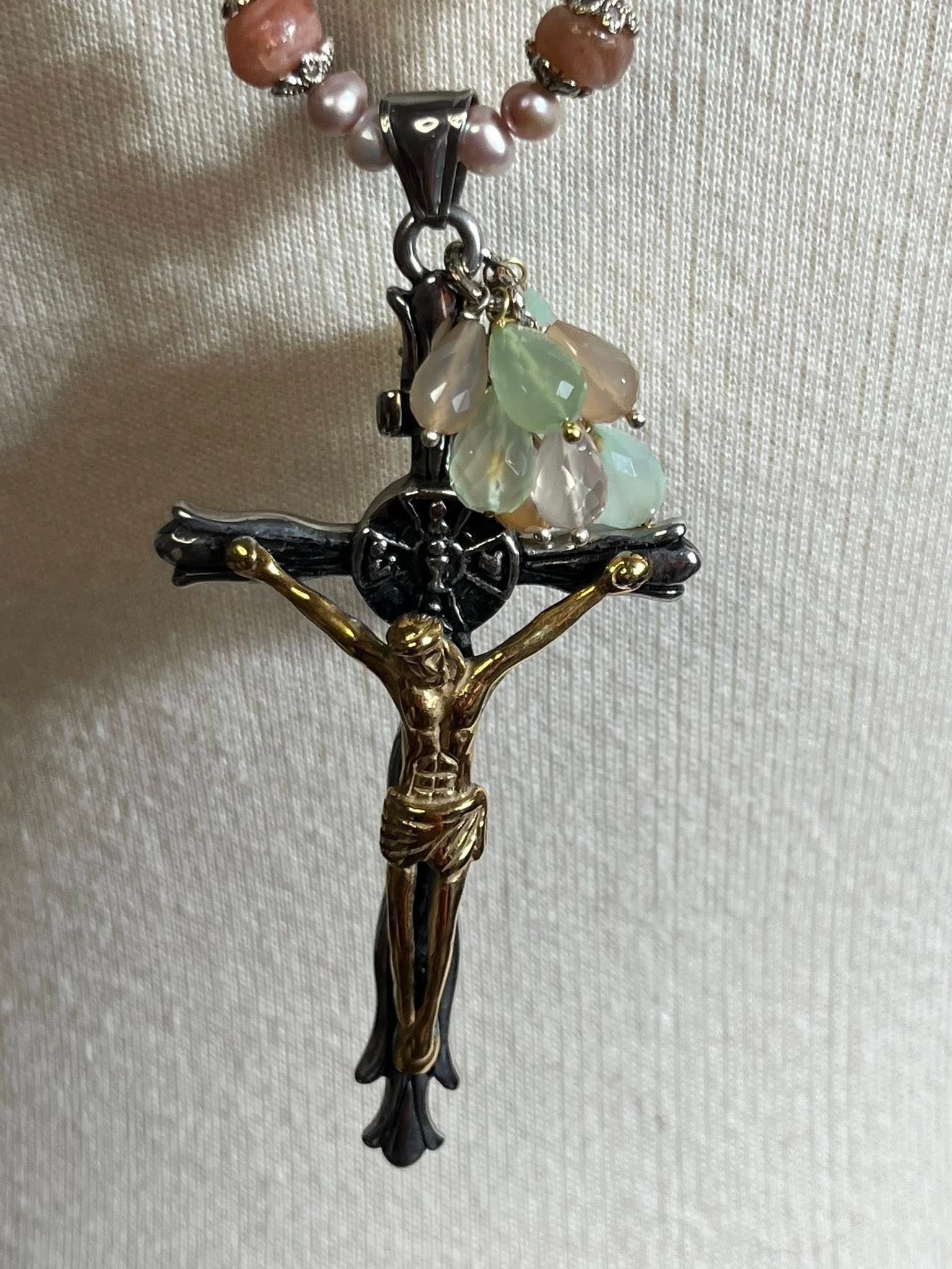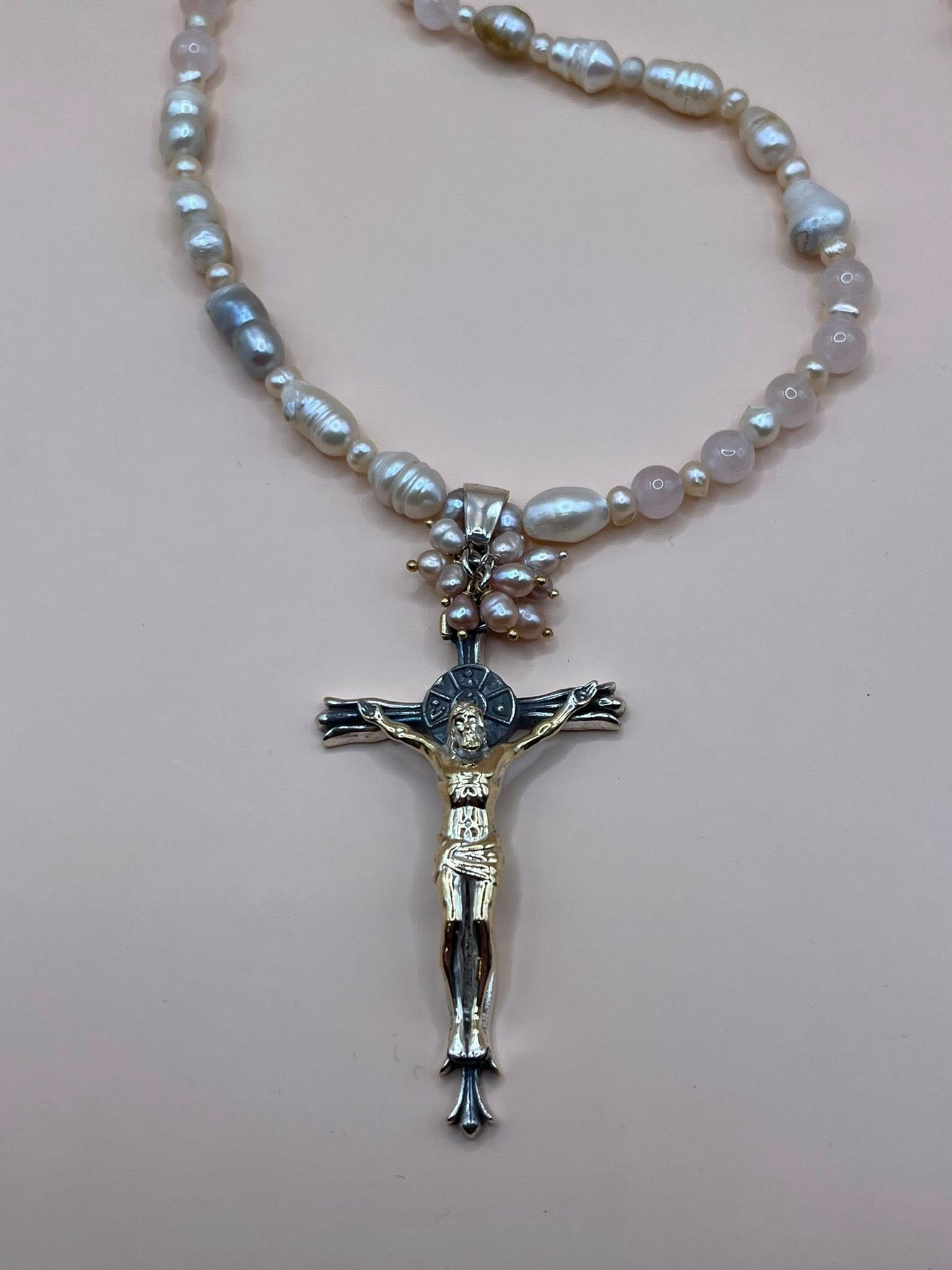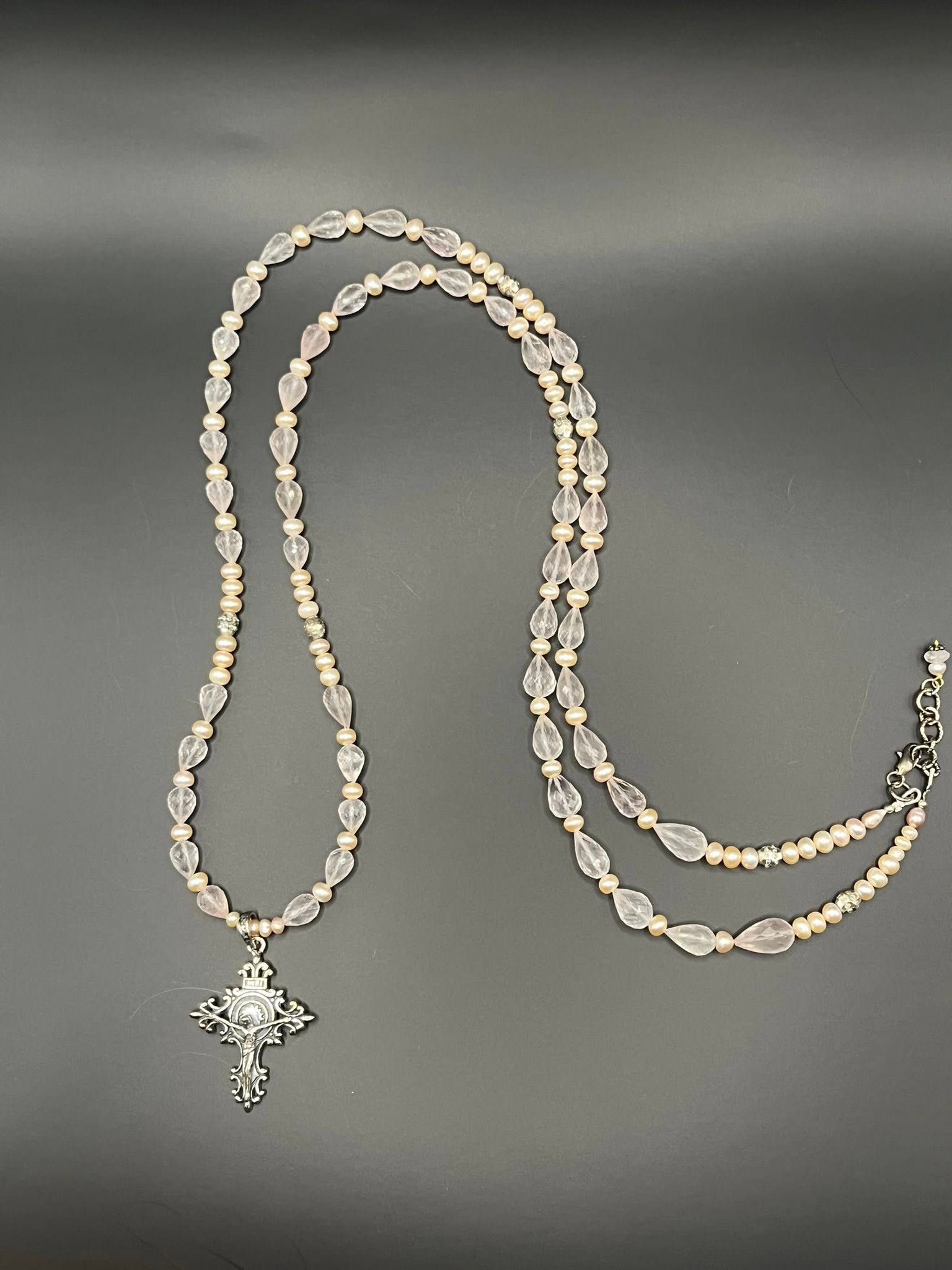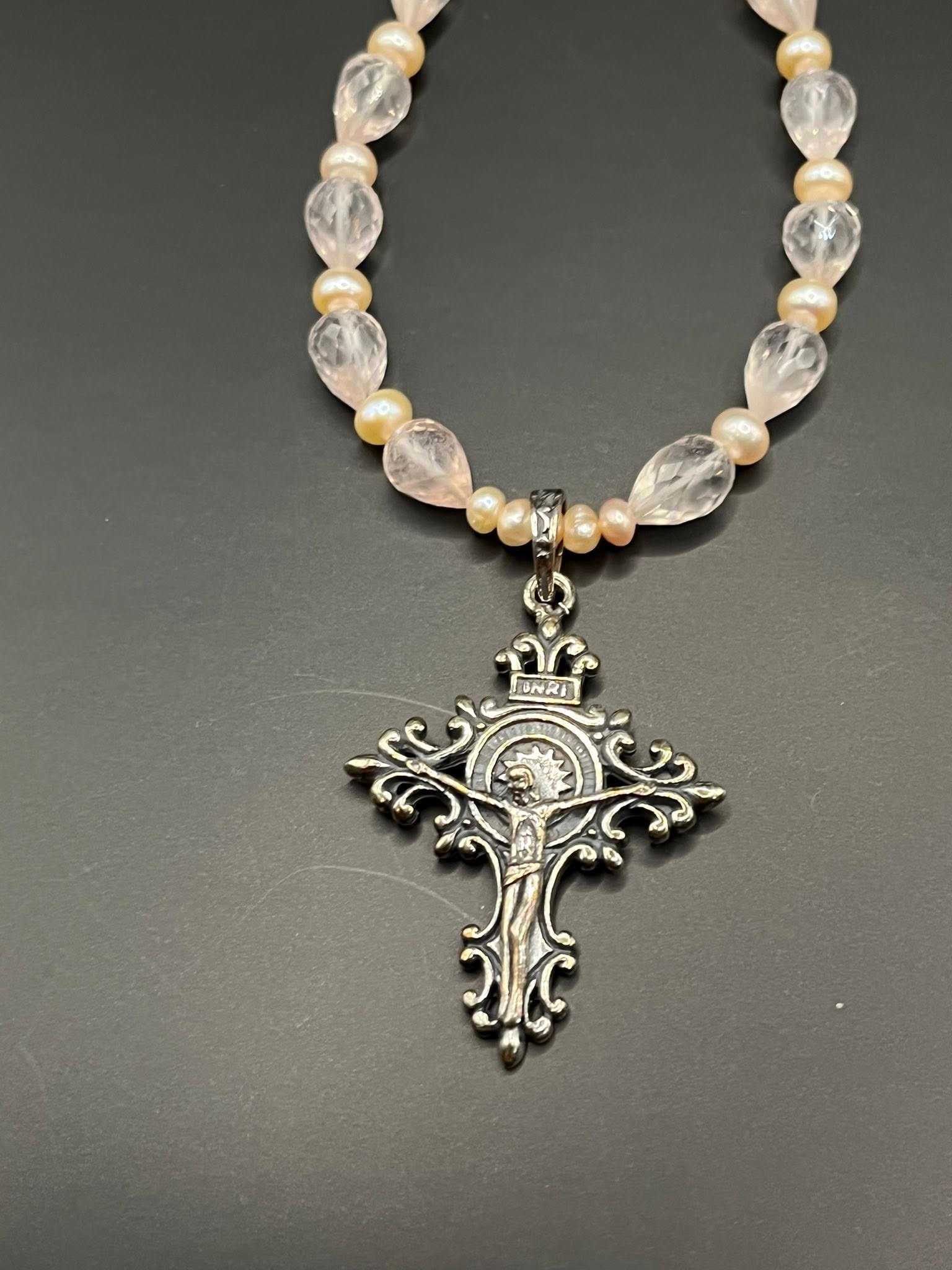 Long sautoir Briolettes de quartz rose, perle de culture Perles facettées en argent 925eme Quartz rose en fermoir et Croix du Christ en argent 925eme Longueur : 98cm