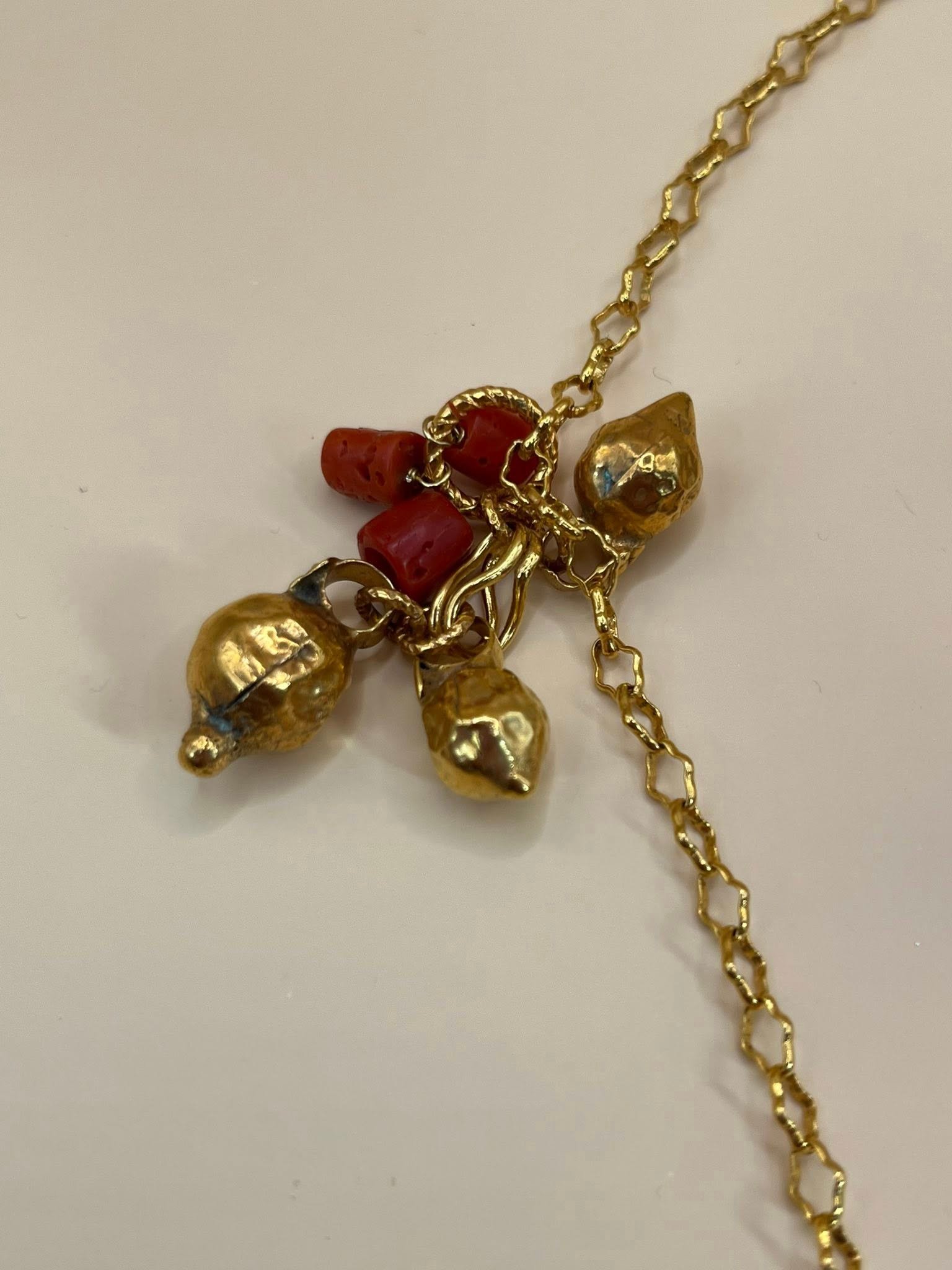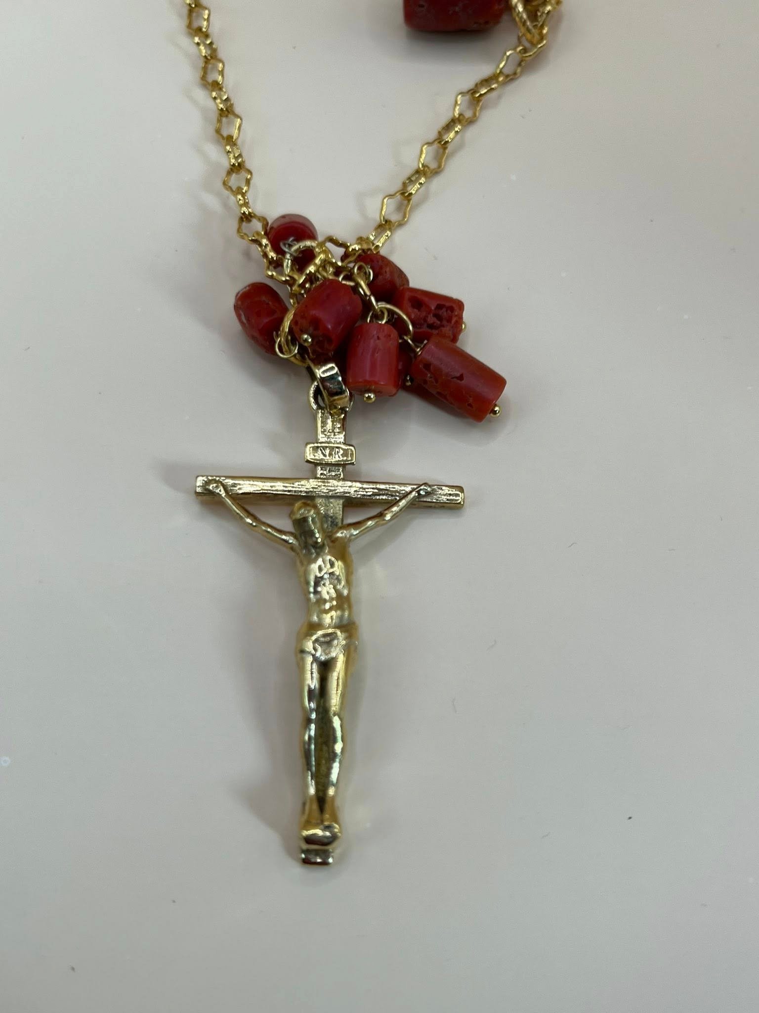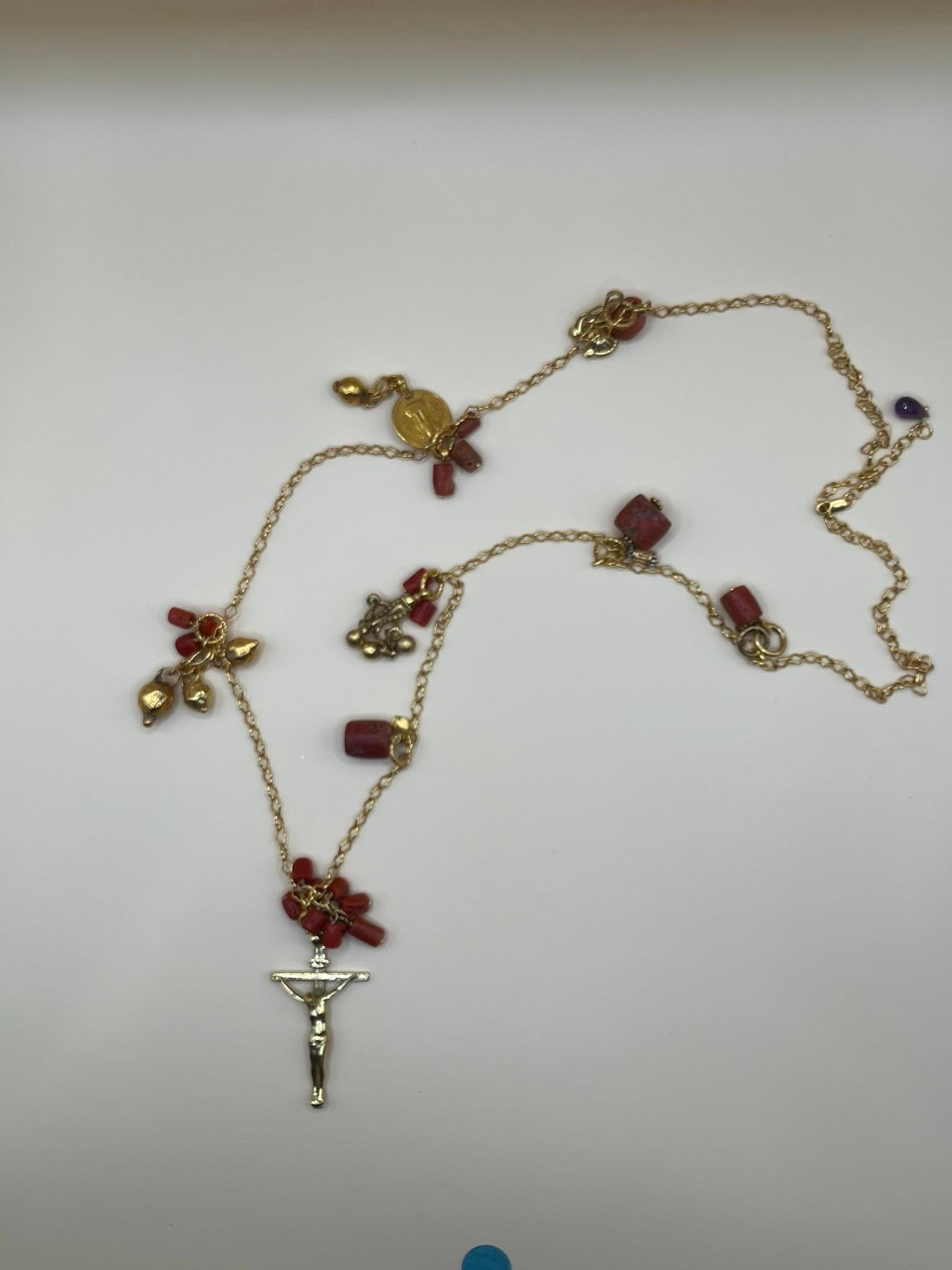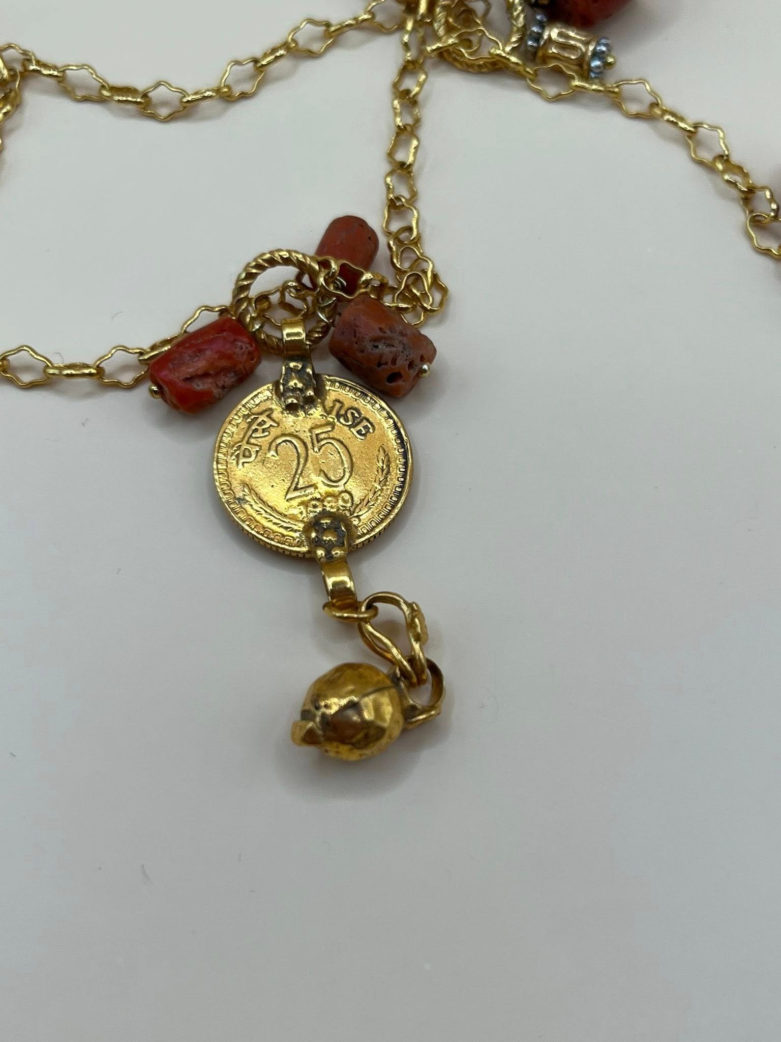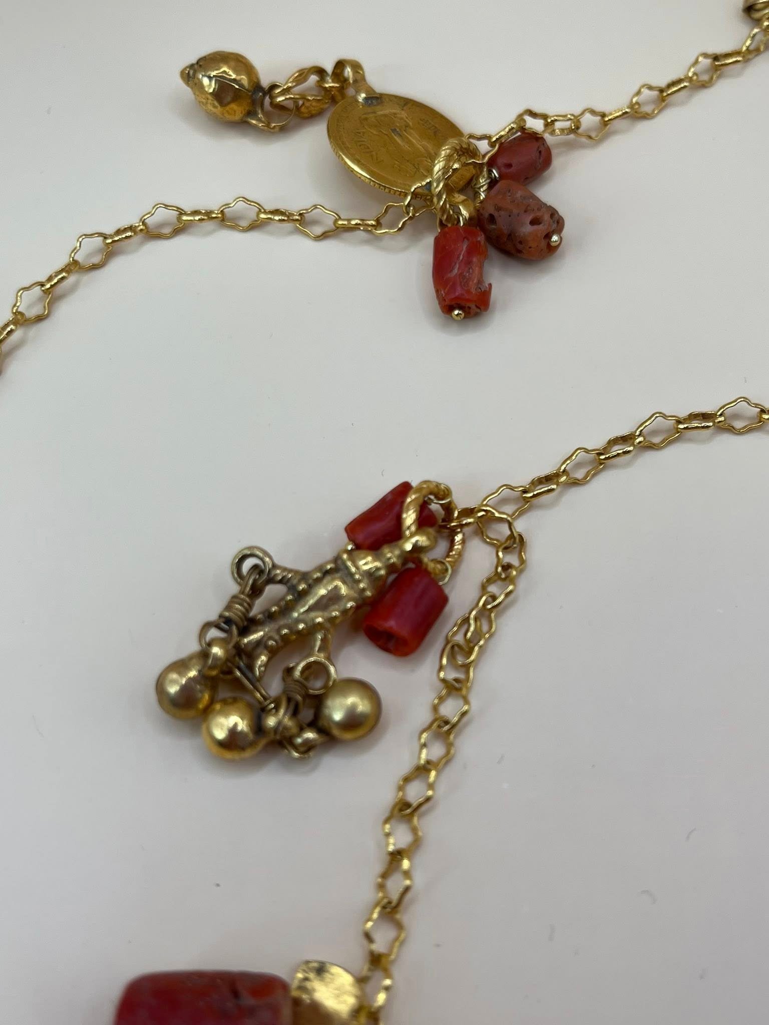 Sautoir unique Sur une chaîne dorée à l’or fin, pampilles et pendentifs antiques indiens Pierres : corail tibétain, améthyste en fermoir Christ doré à l’or fin Longueur : 100cm