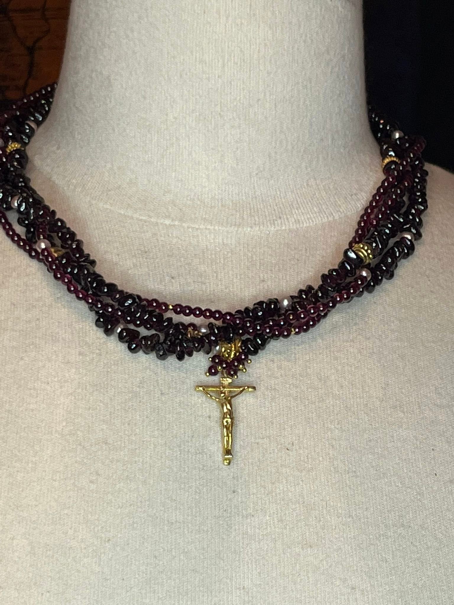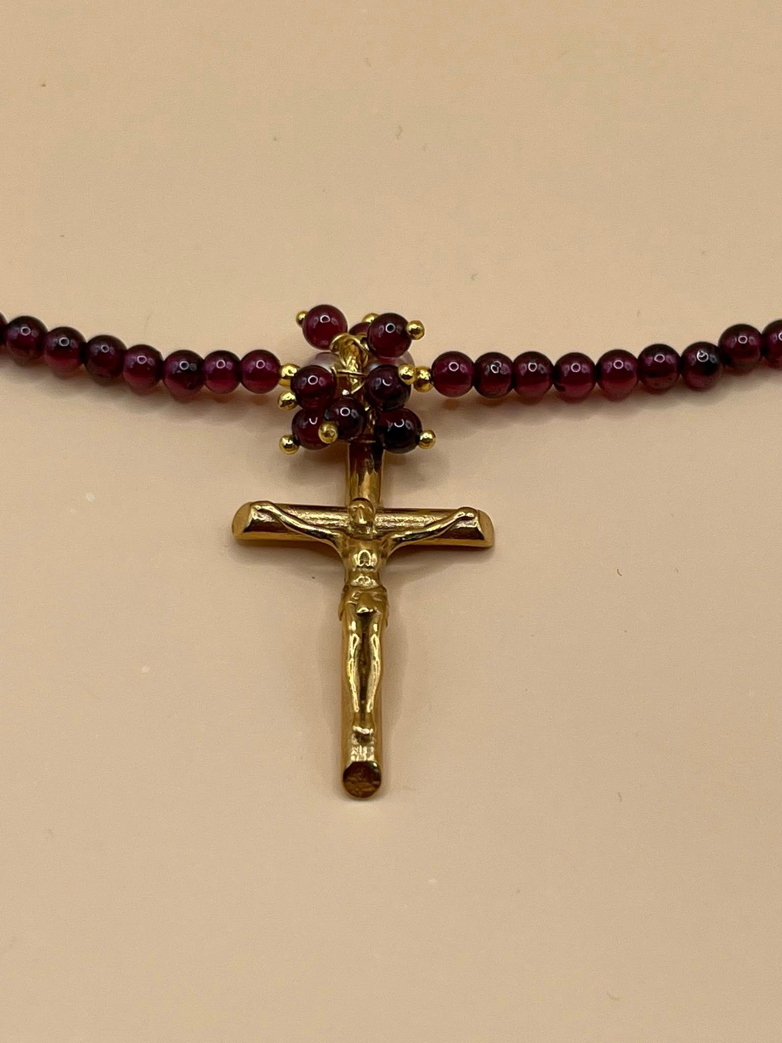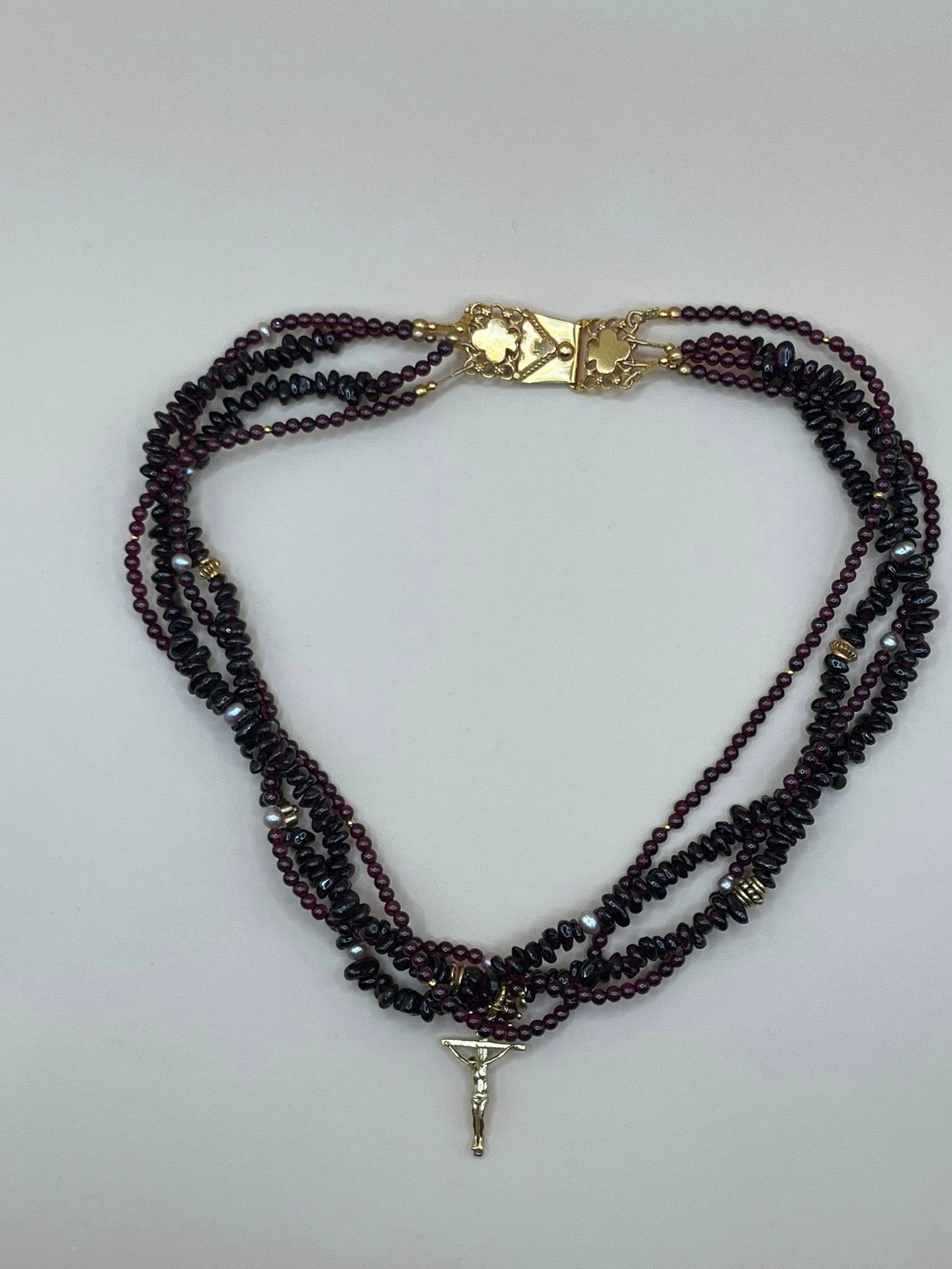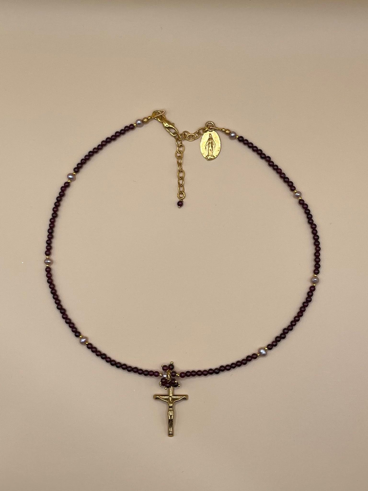 Création unique Tour de cou en grenat et perles de culture Christ et médaille de la Vierge dorés à l’or fin Longueur : 46cm (+ chaînette d’extension)