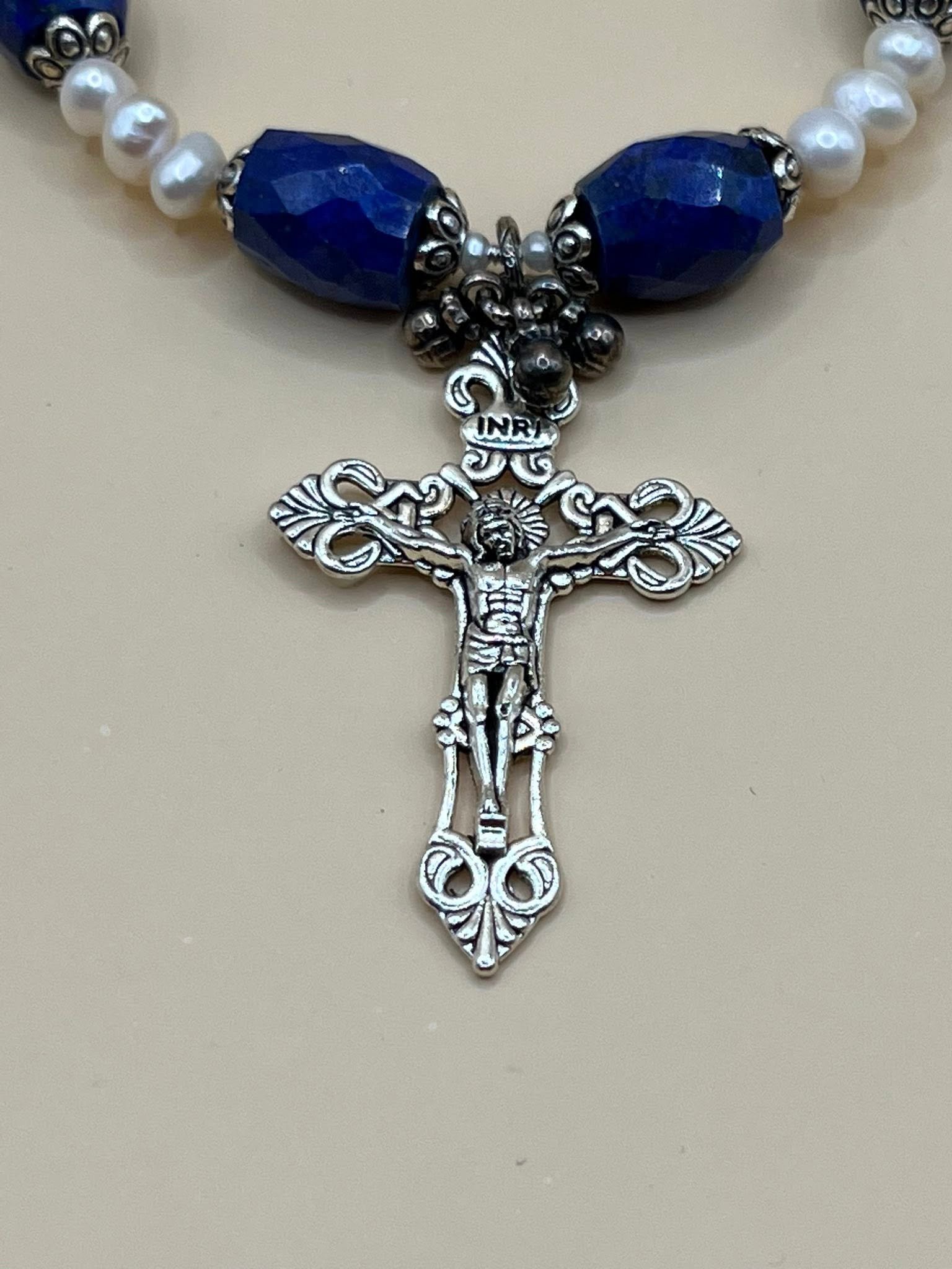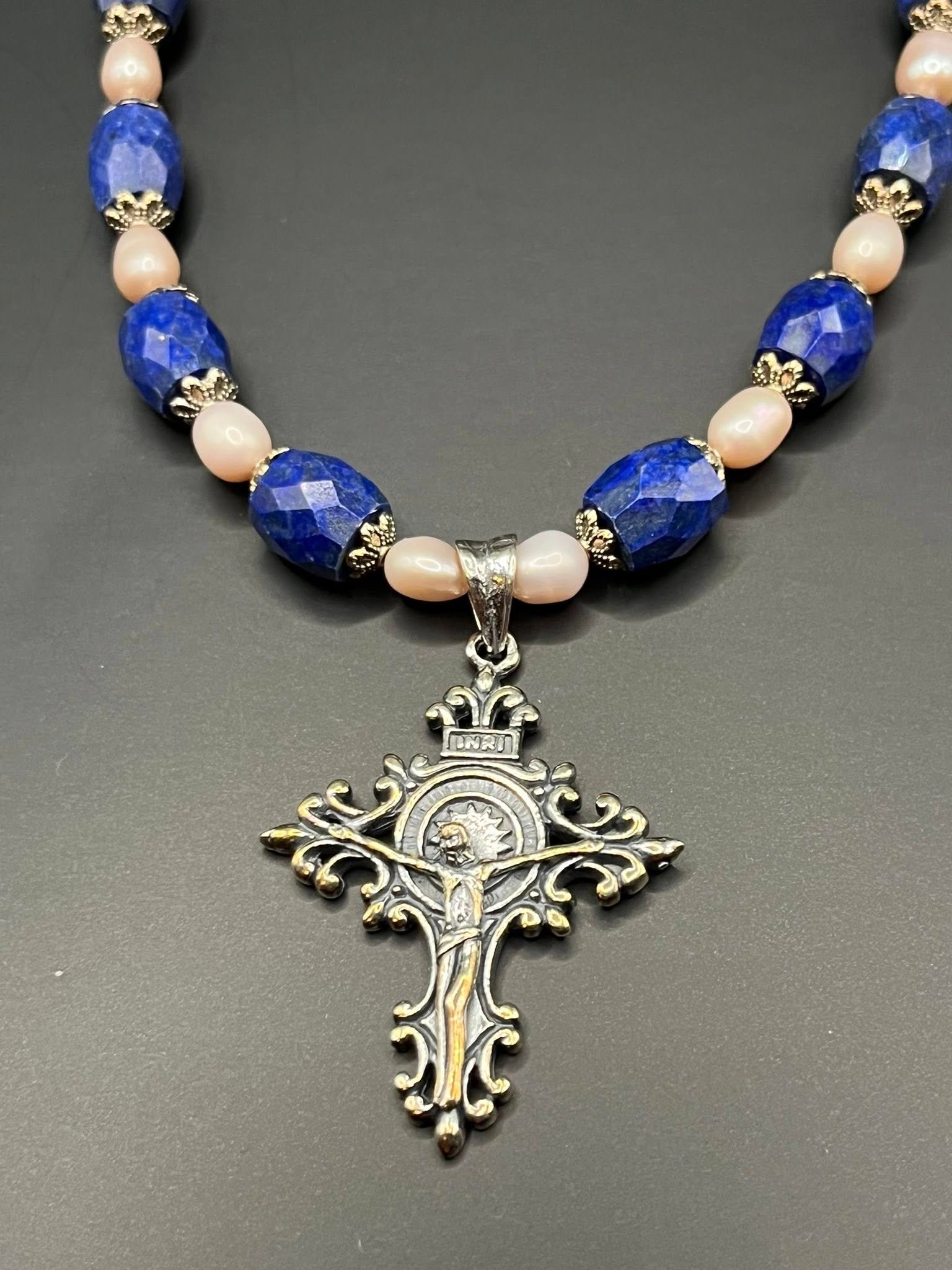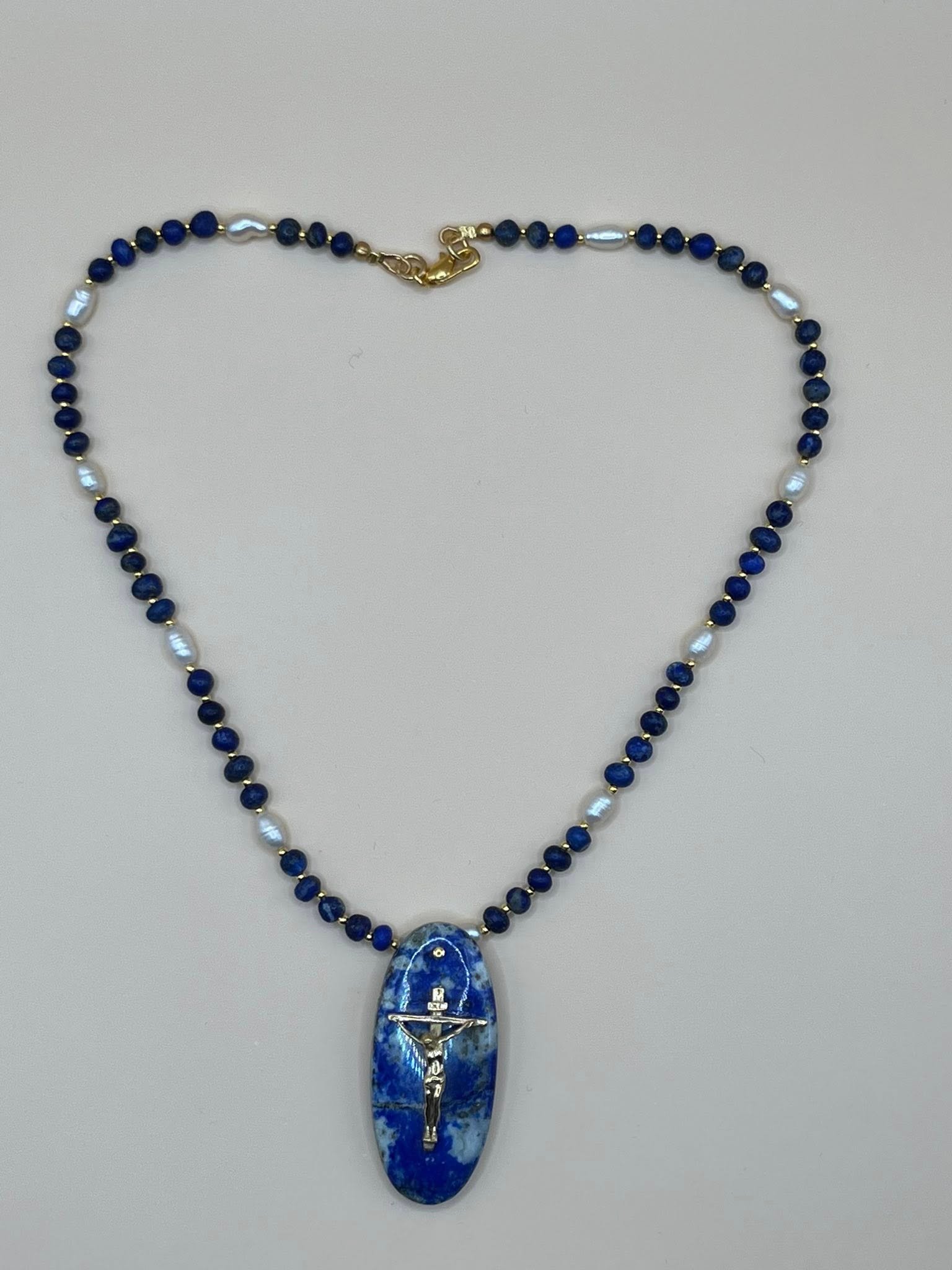 Collier Unique Tour de cou en lapiz lazuli et perle de culture Pendentif du Christ en argent 925eme Longueur : 40cm (chaînette d’extension possible sans surcoût)