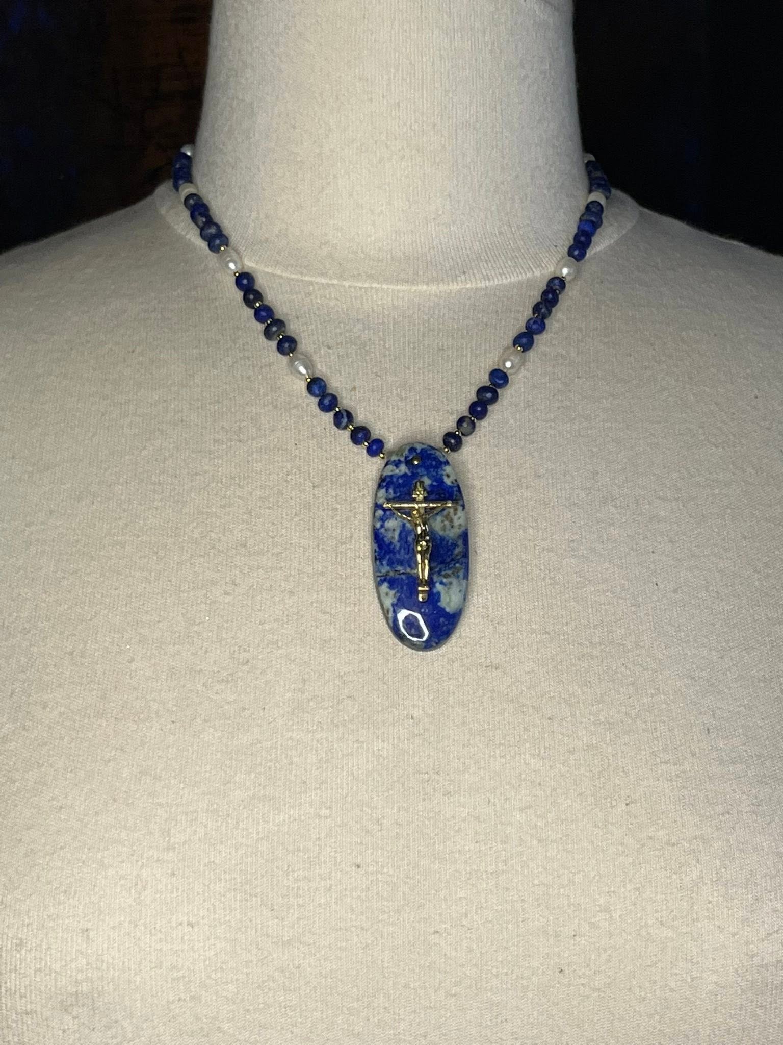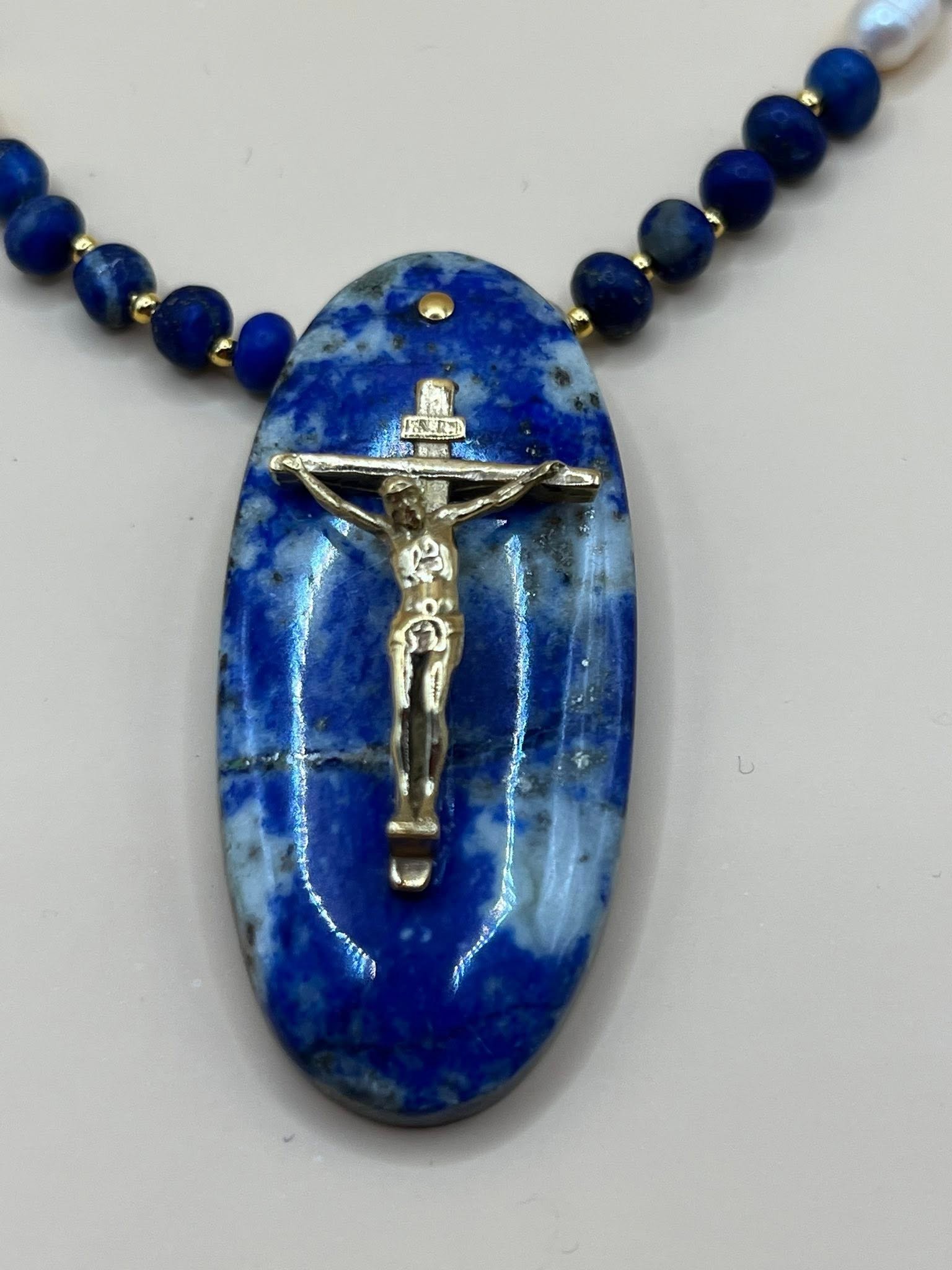 Collier unique En lapis-lazuli et perles de culture Pendentif lapis-lazuli Christ doré à l’or fin Longueur : 46cm (chaînette de rallonge possible)