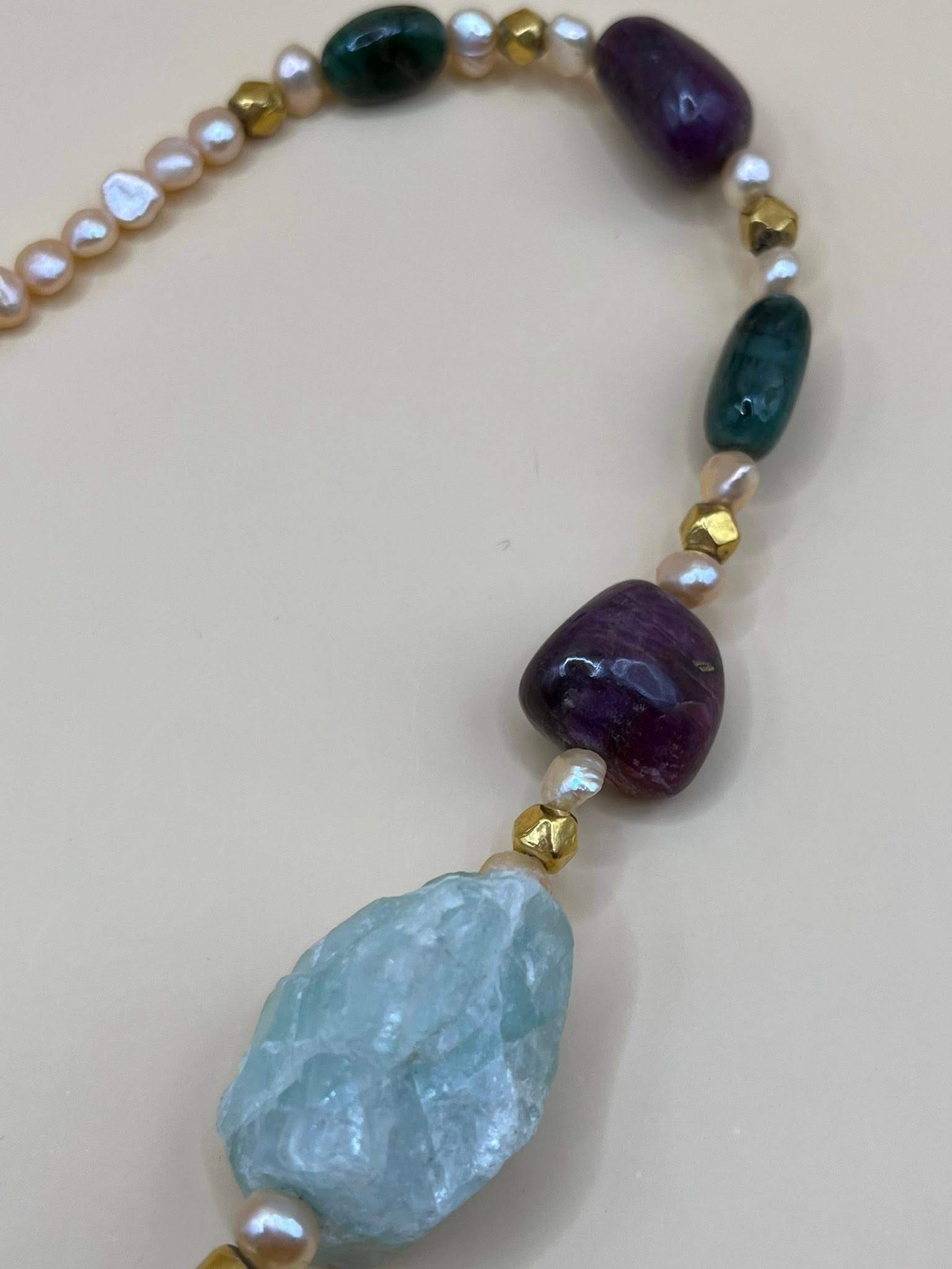 Collier exceptionnel Pierres : émeraude, rubis et calcédoine bleutée « Wax beads » recouvertes de feuille d’or Perles de culture Christ et Vierge Marie dorés à l’or fin 24 carats Longueur : 55cm