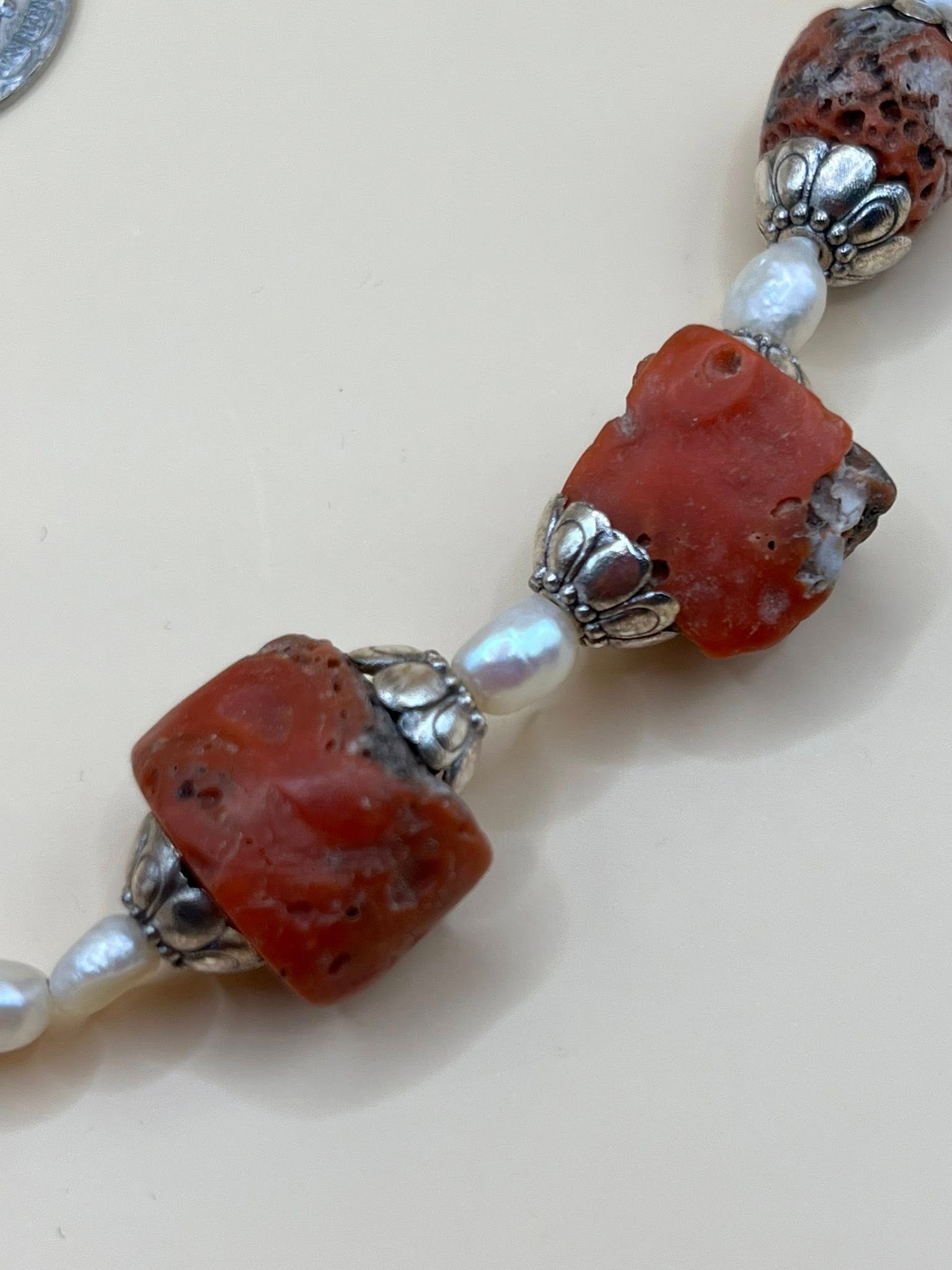 Collier unique Corail Tibétain et perles de culture Améthyste en fermoir Longueur : 55cm
