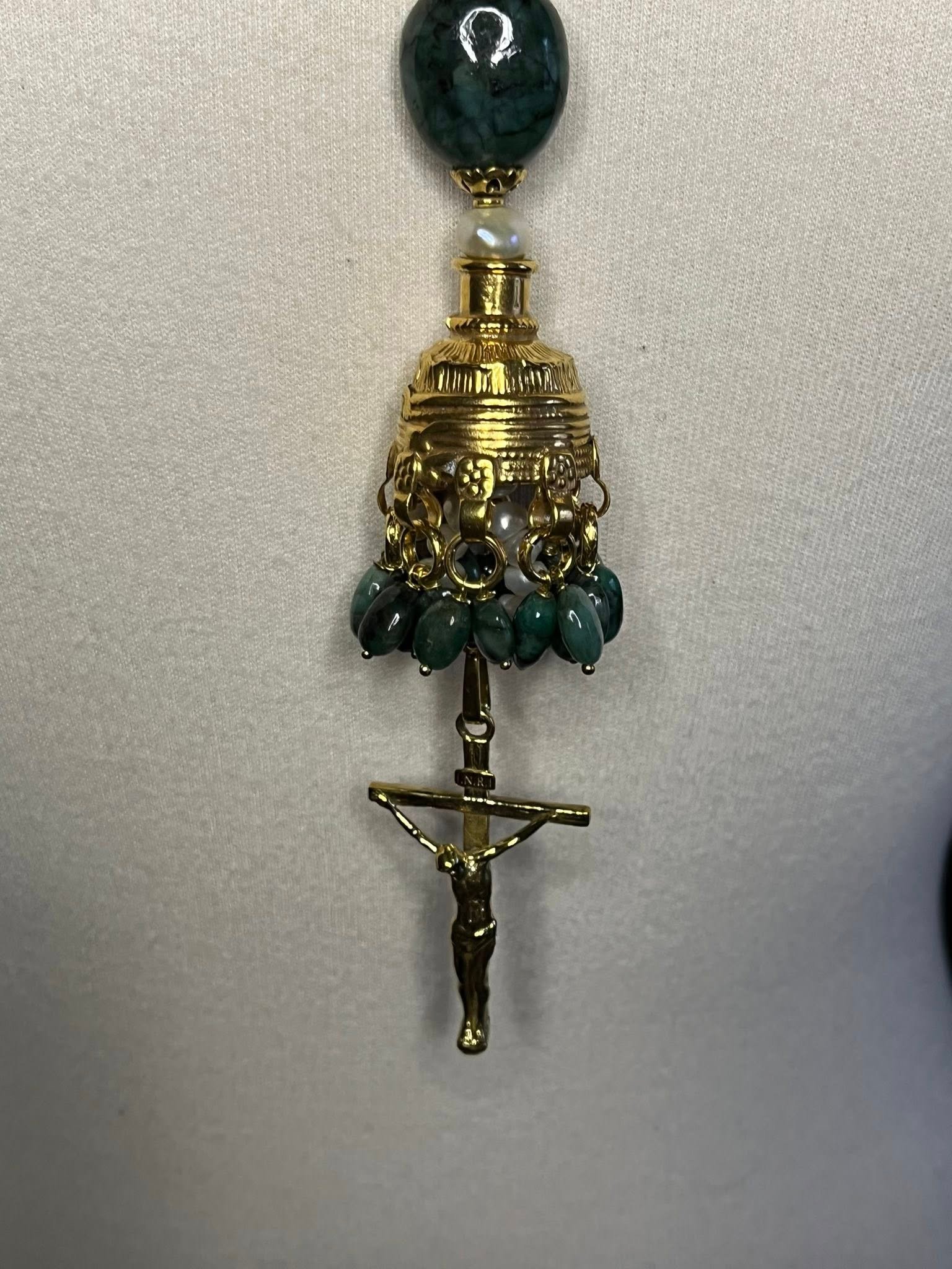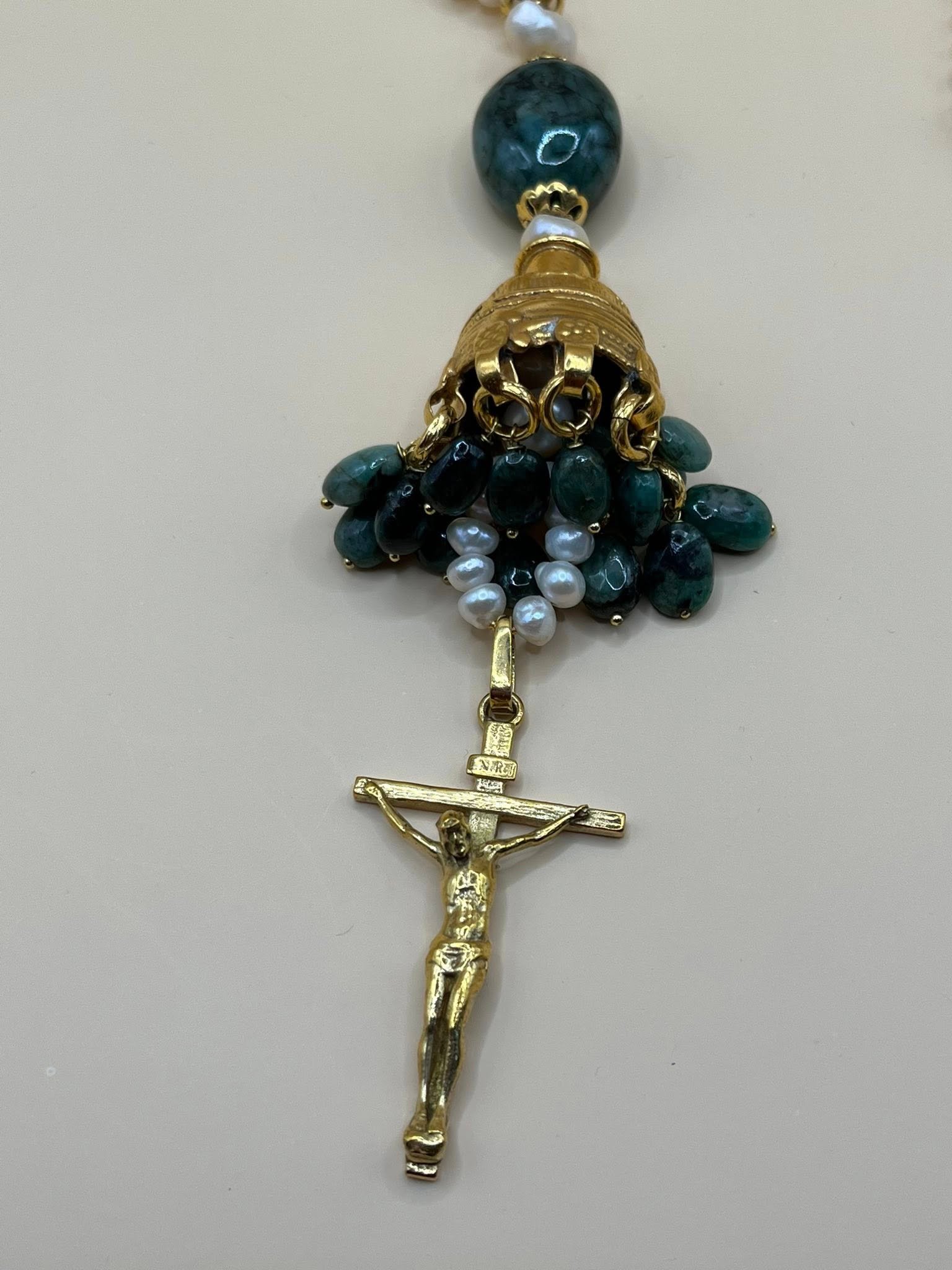 Dizainier Jade et perle de culture Ce Dizainier est créé sur des pendentifs indiens antiques dorés à l’or fin 24 carats Christ doré
