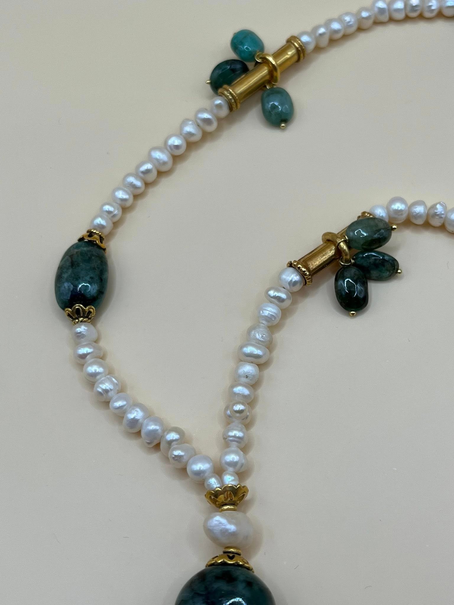 Création exceptionnelle Collier en émeraude et perles de culture Émeraude en fermoir Pendentifs et tubes antiques dorés à l’or fin 24 carats Longueur : 80cm