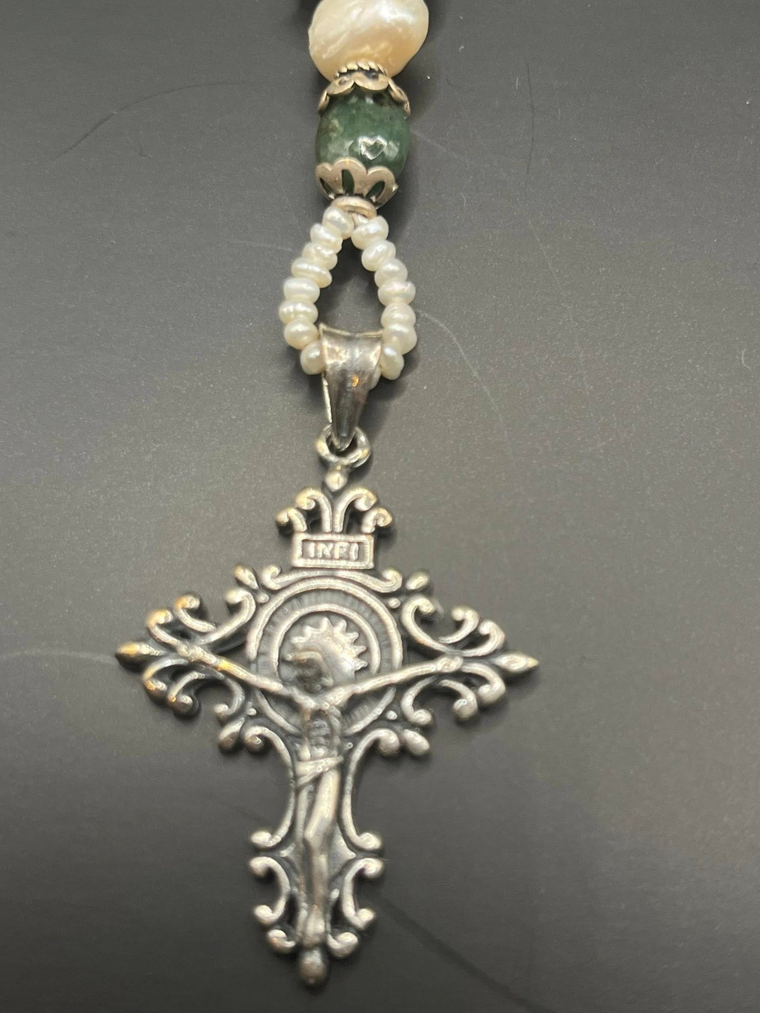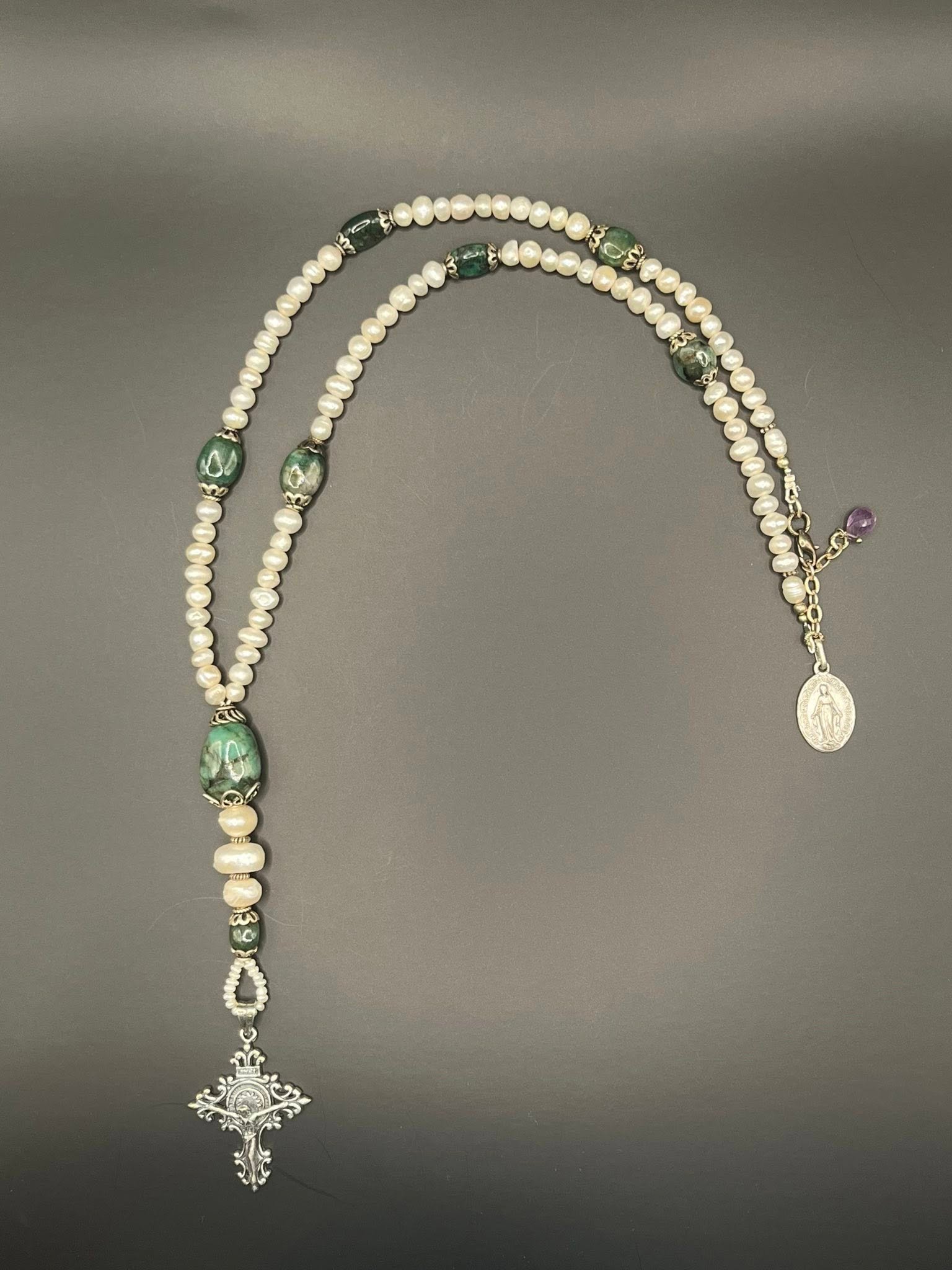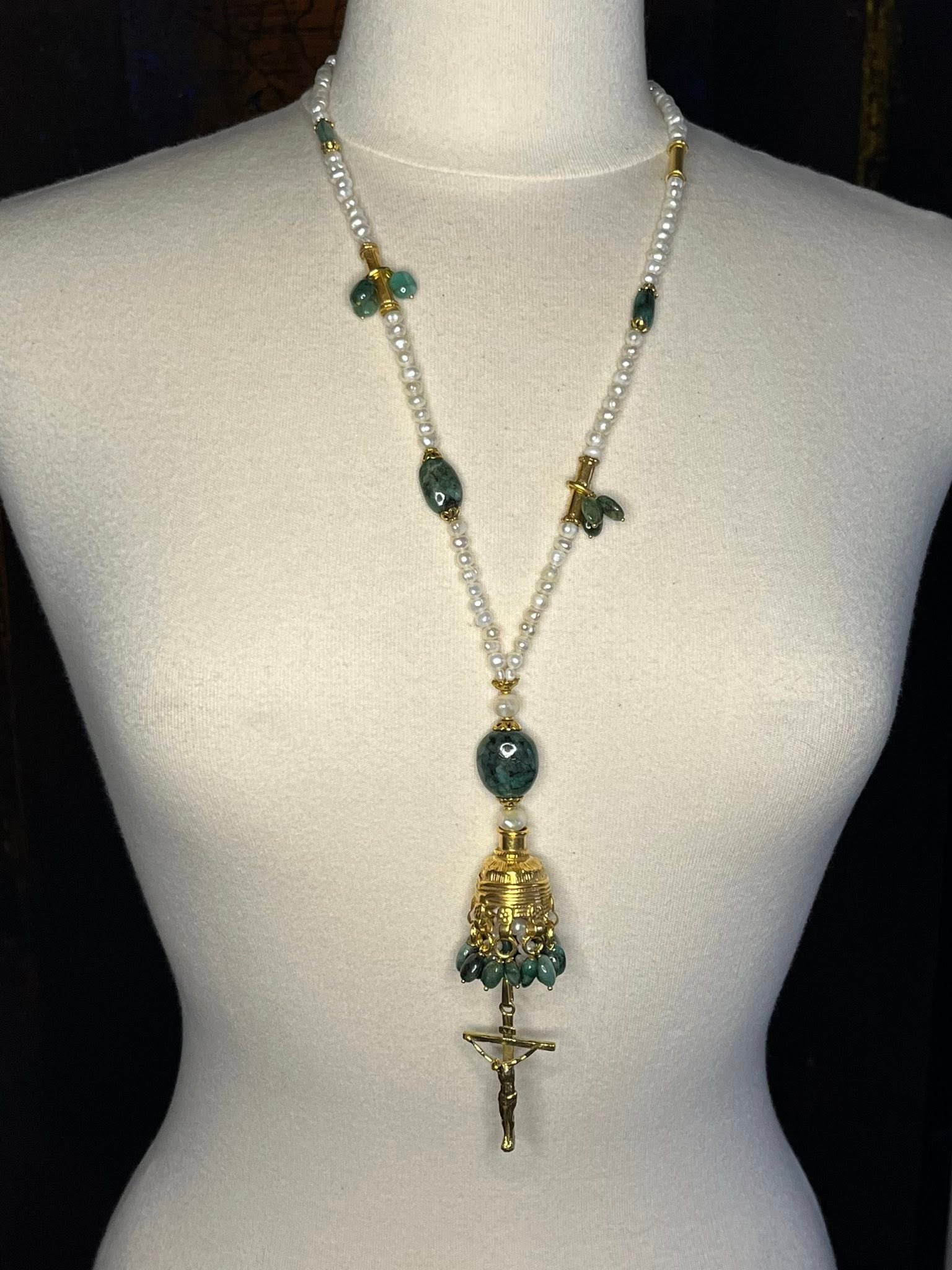 Création Unique Perle de culture, Green améthyste Christ en argent 925eme Médailles de la vierge Marie et de l’archange Mickael Tube antique indien, apprêts en argent Longueur : 130cm