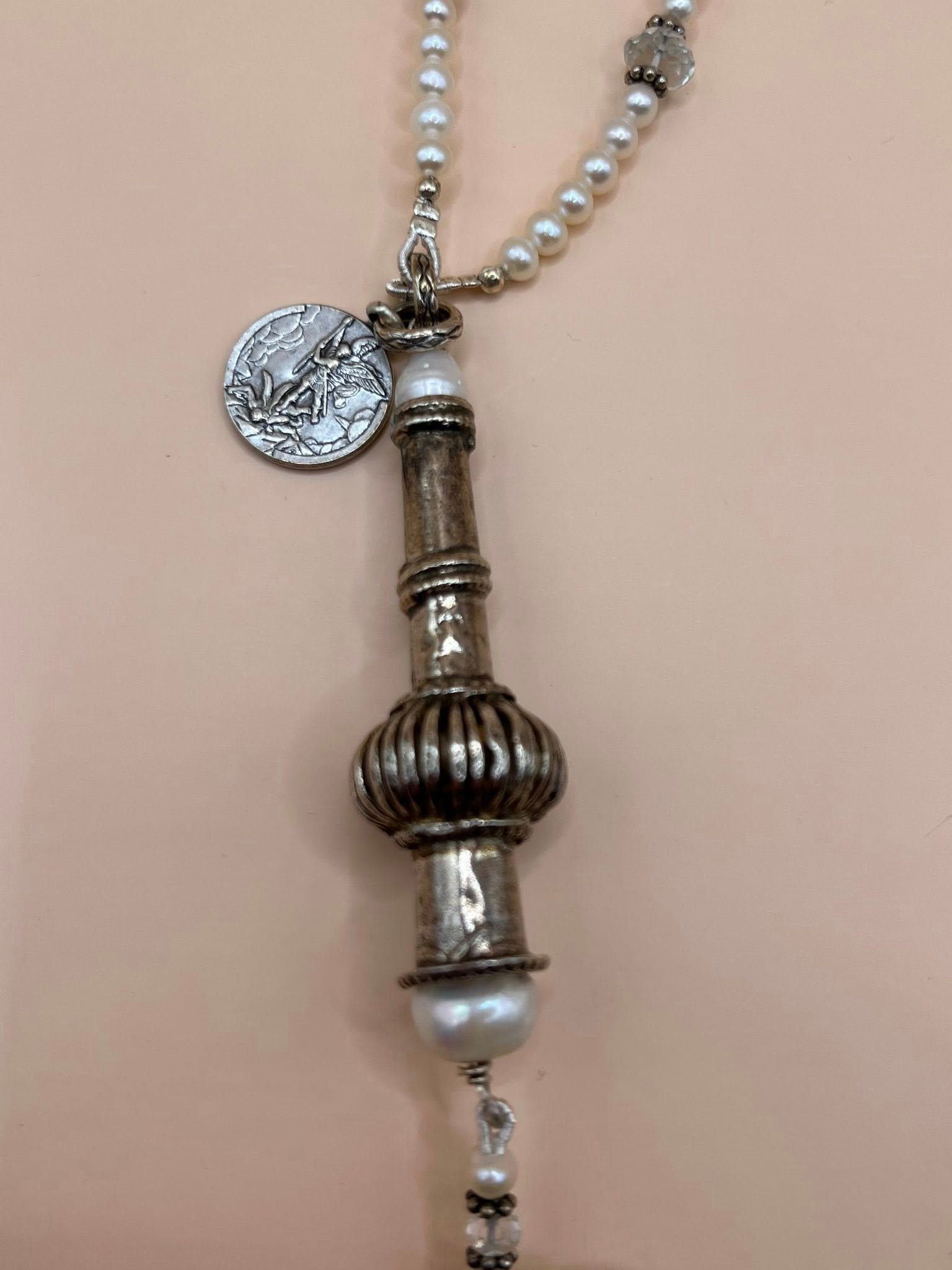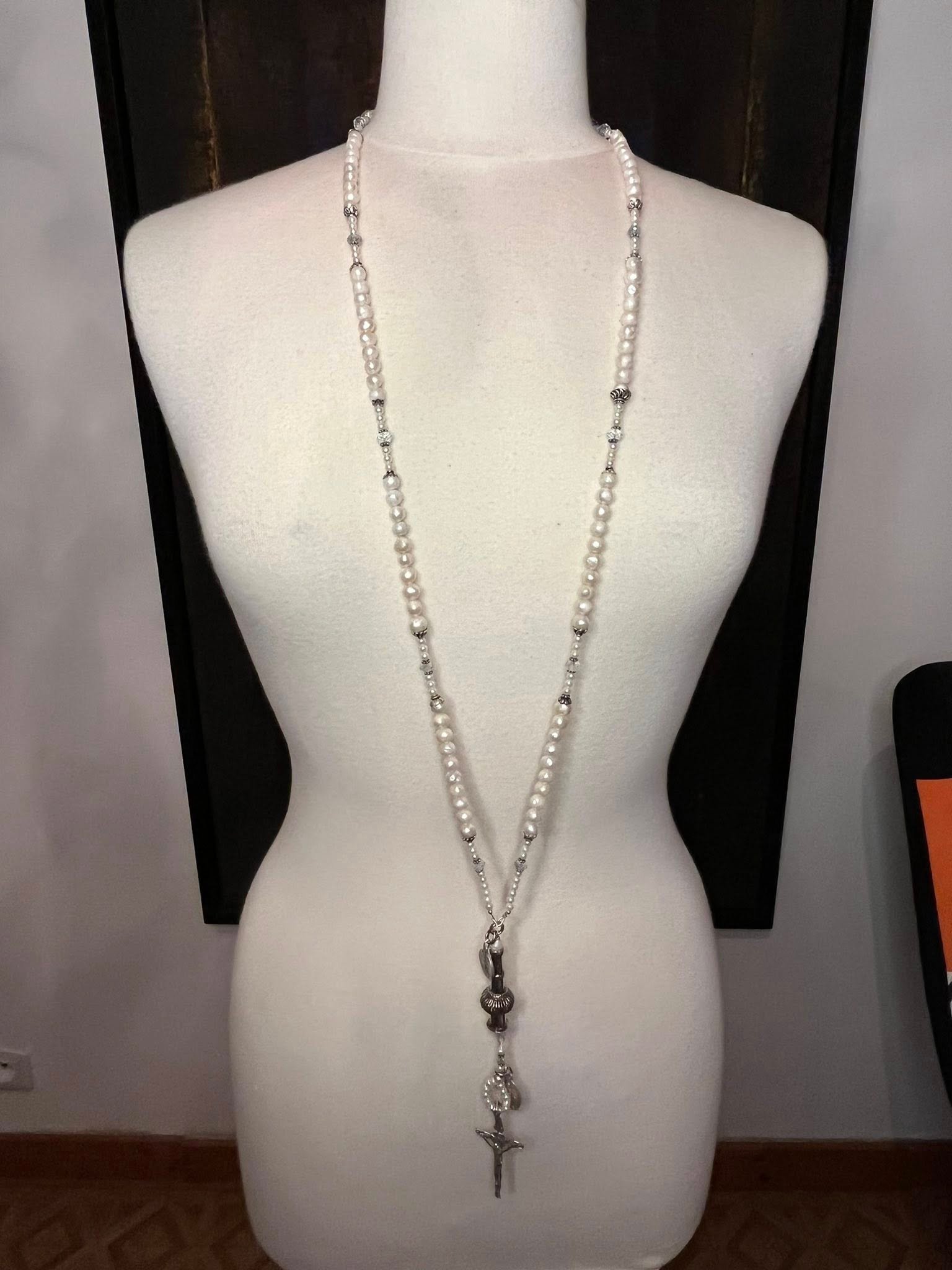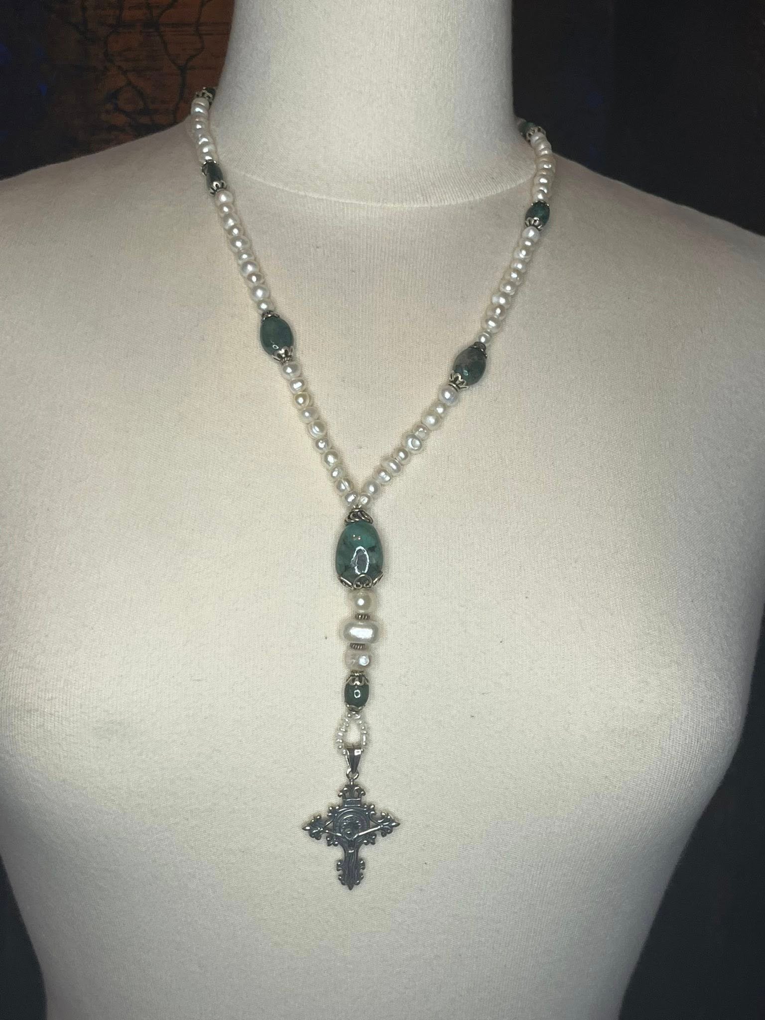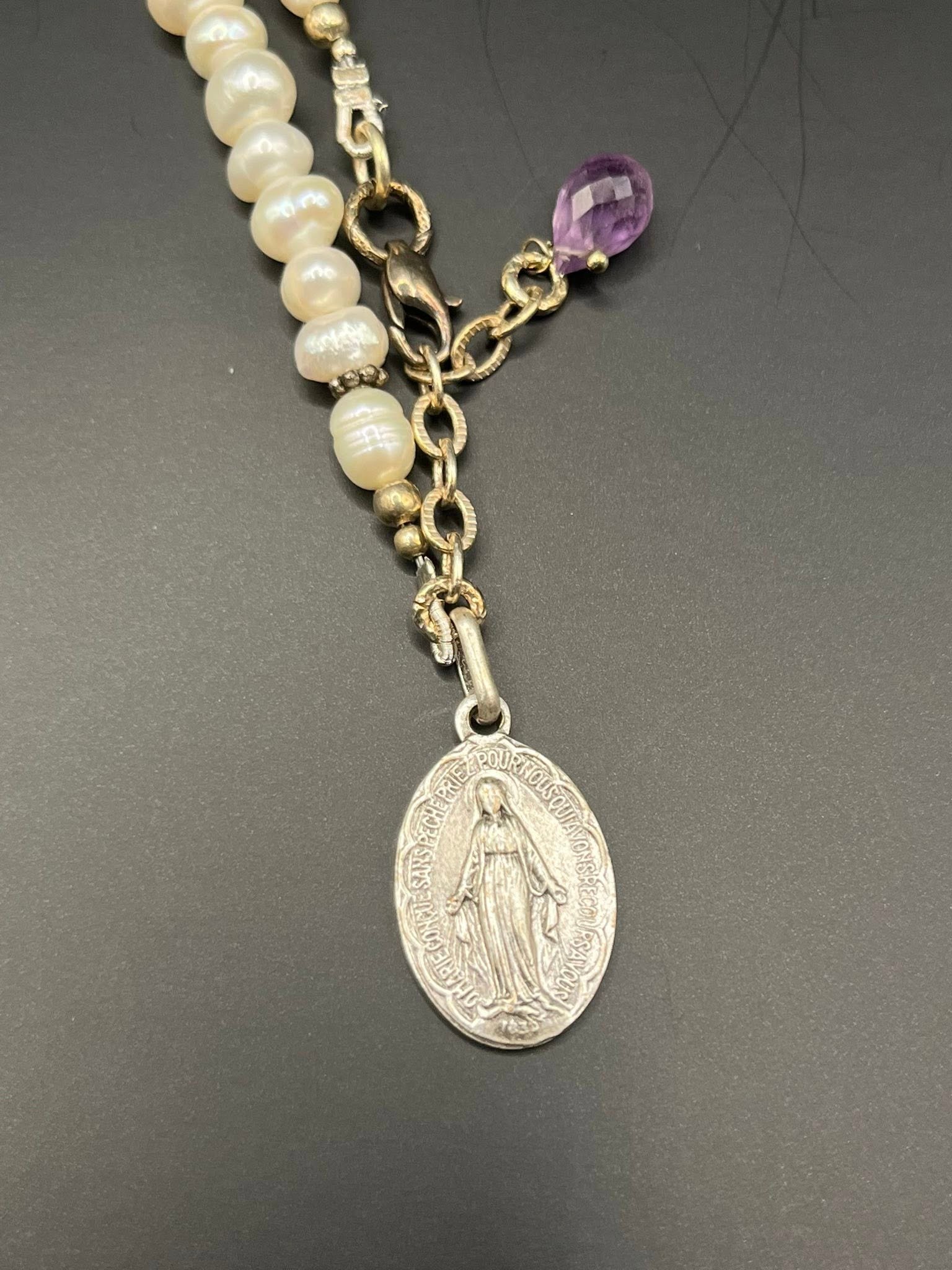 Création Unique Perle de culture, Green améthyste Christ en argent 925eme Médailles de la vierge Marie et de l’archange Mickael Tube antique indien, apprêts en argent Longueur : 130cm