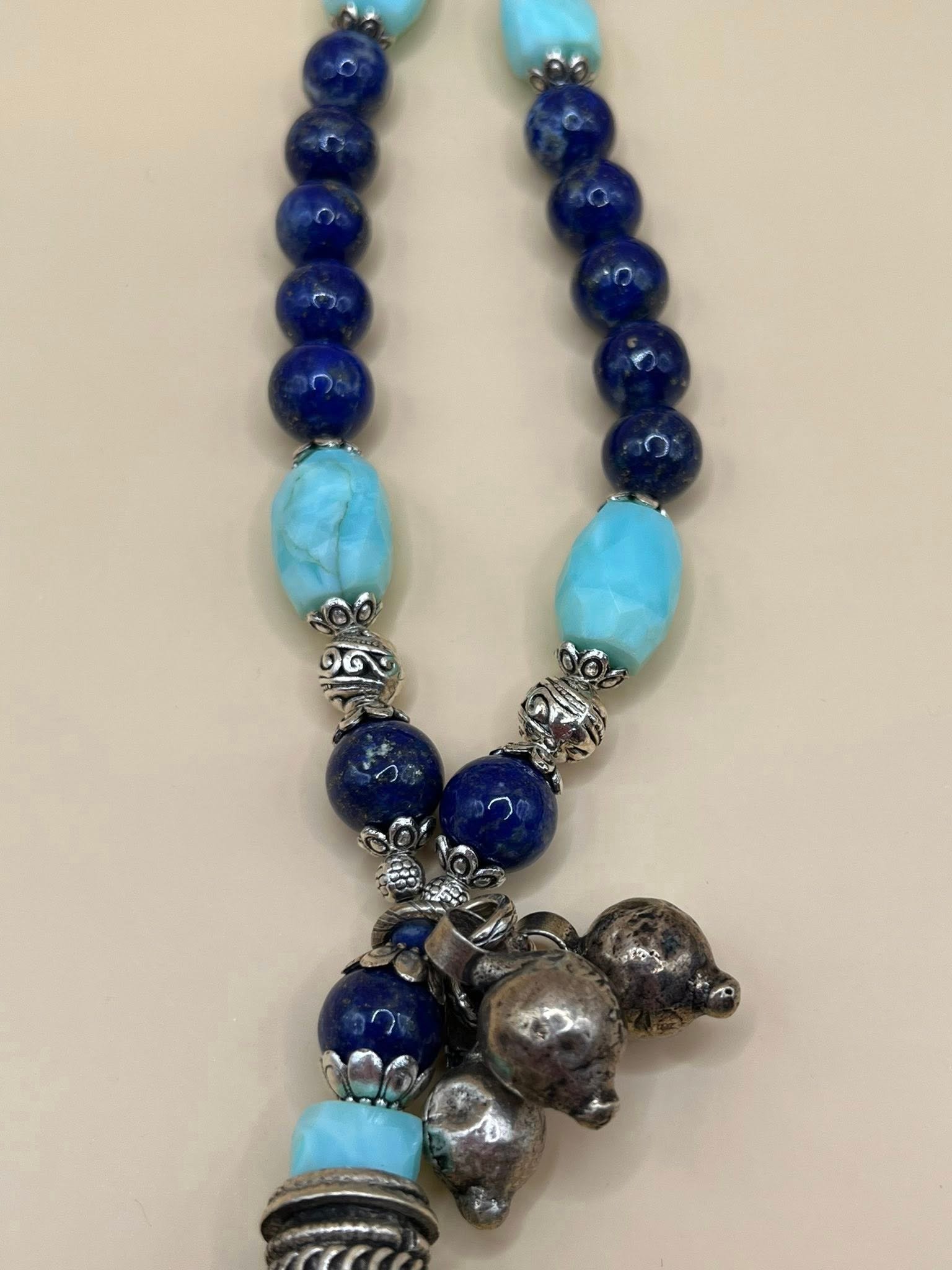 Création unique Long sautoir en lapis-lazuli et jade Améthyste en fermoir Breloques et pendentif antique Longueur : 100cm
