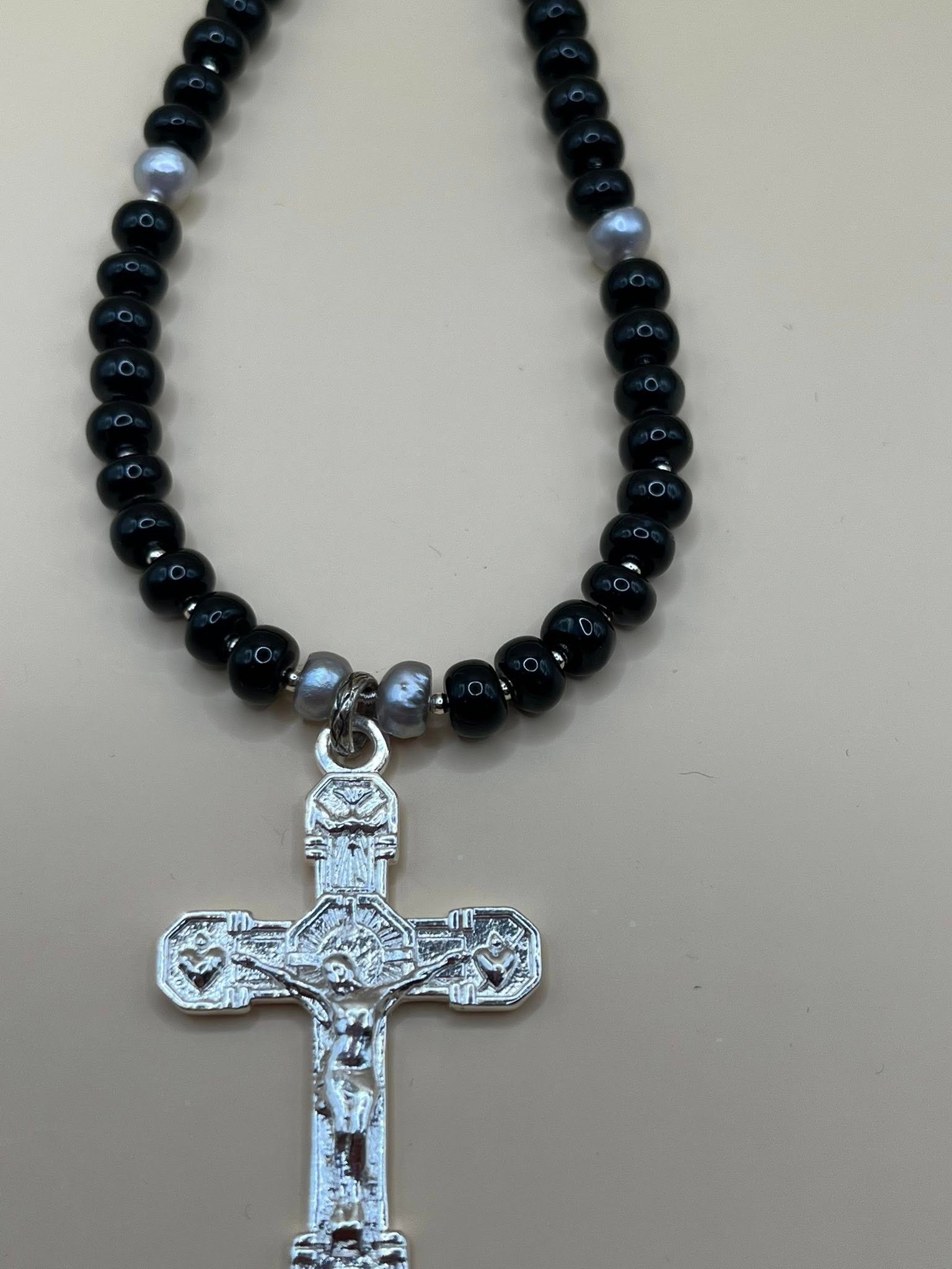 Création unique Collier long en onyx et perles de culture Croix du Christ plaquée argent Longueur : 69cm