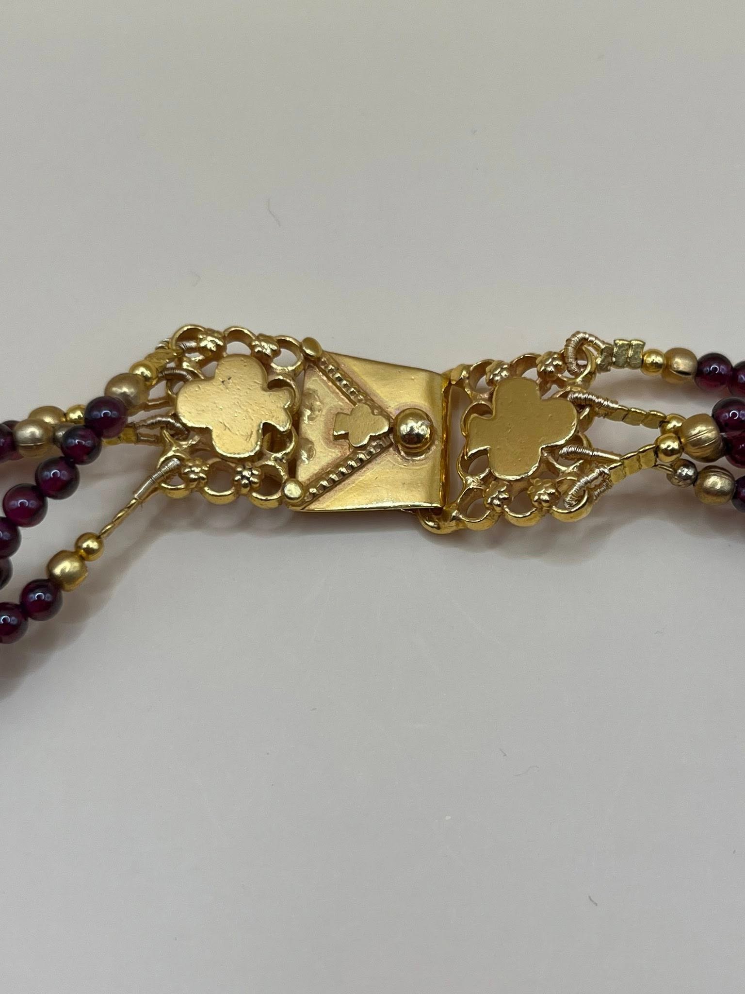 Création unique Collier 4 brins en grenat et perles de culture Fermoir en vermeil (argent plaqué or) Apprêts dorés à l’or fin 23 carats Longueur : 48cm