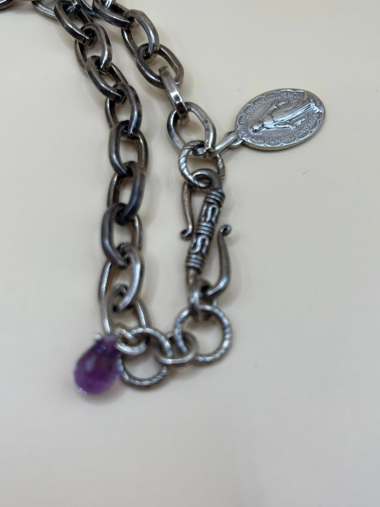 Collier unique Grappes en Quartz rutilé montées sur un pendentif ancien (Inde) Améthyste en fermoir Fermoir crochet en argent et chaîne inox Longueur : 46cm (chaînette d’extension possible)