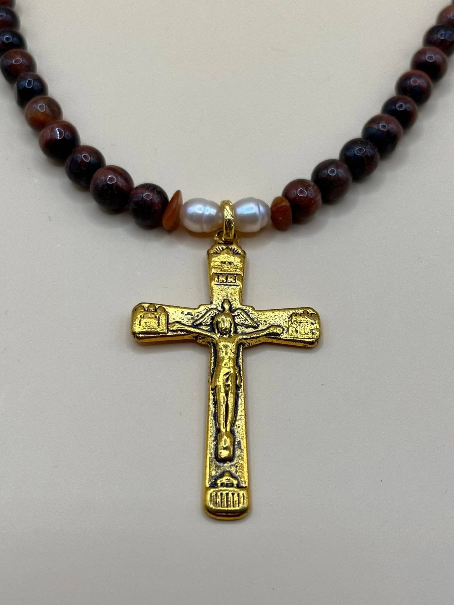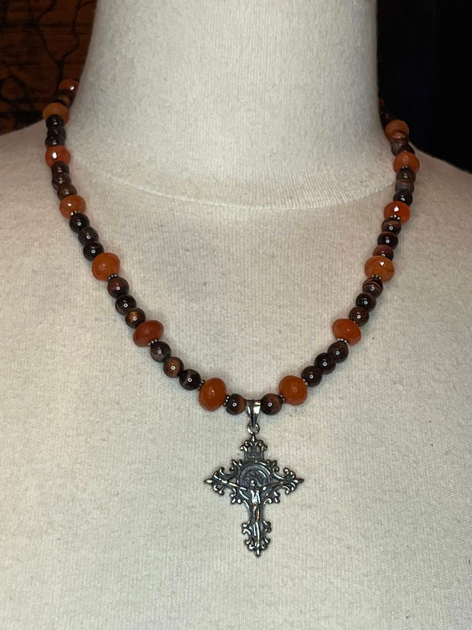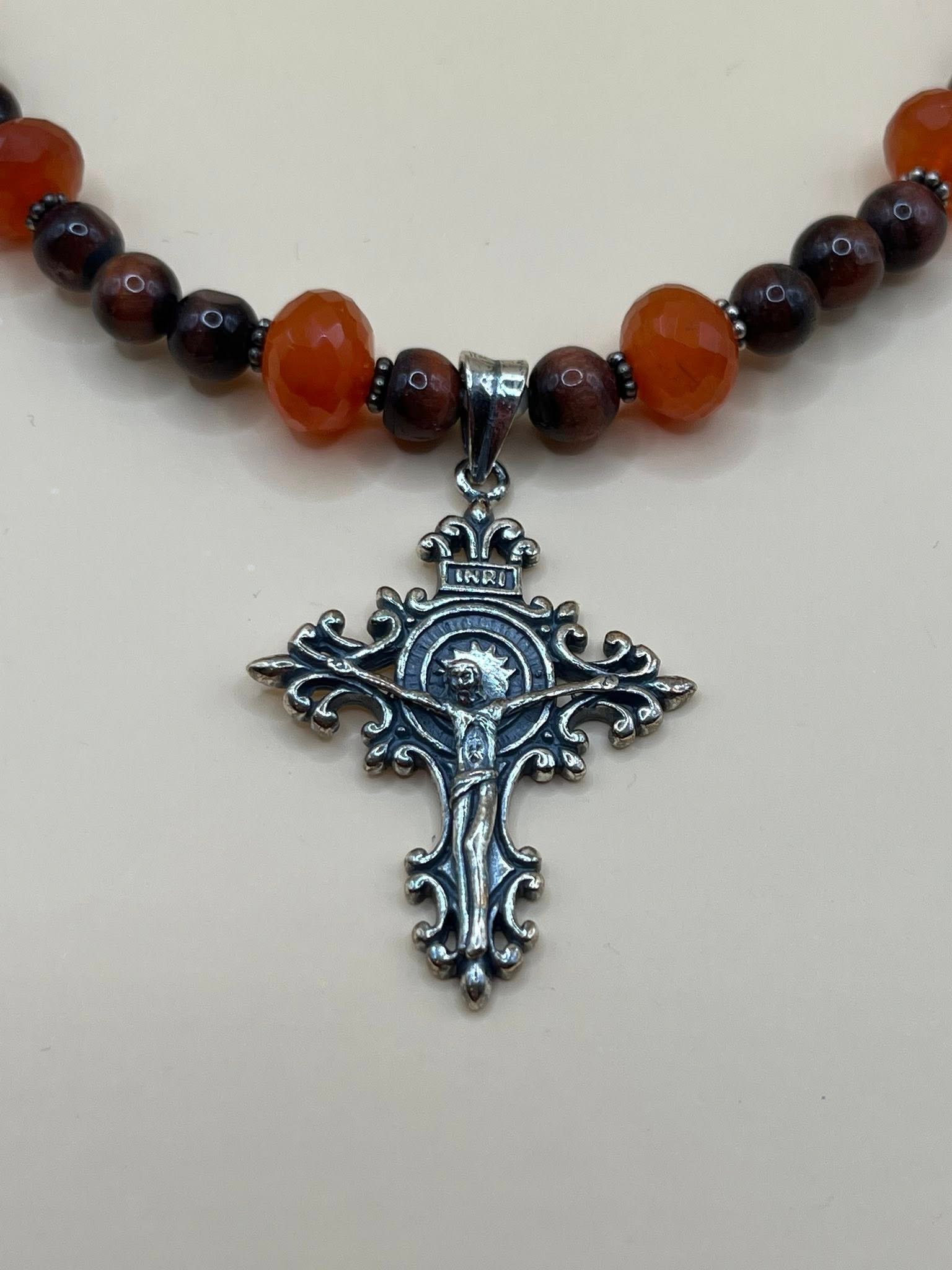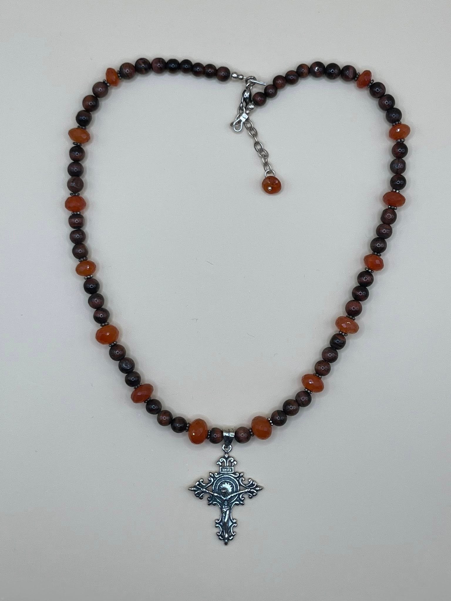 Collier unique Pierres : cornaline facettées et œil de tigre Croix du Christ en argent 925/eme Longueur : 48cm