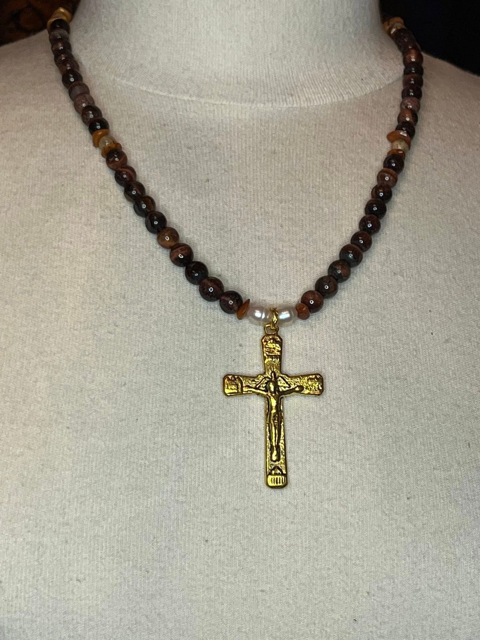 Collier Pierre œil de tigre, Ambre, Pierre naturelle et perle de culture Croix du Christ dorée Améthyste en fermoir Longueur : 51cm