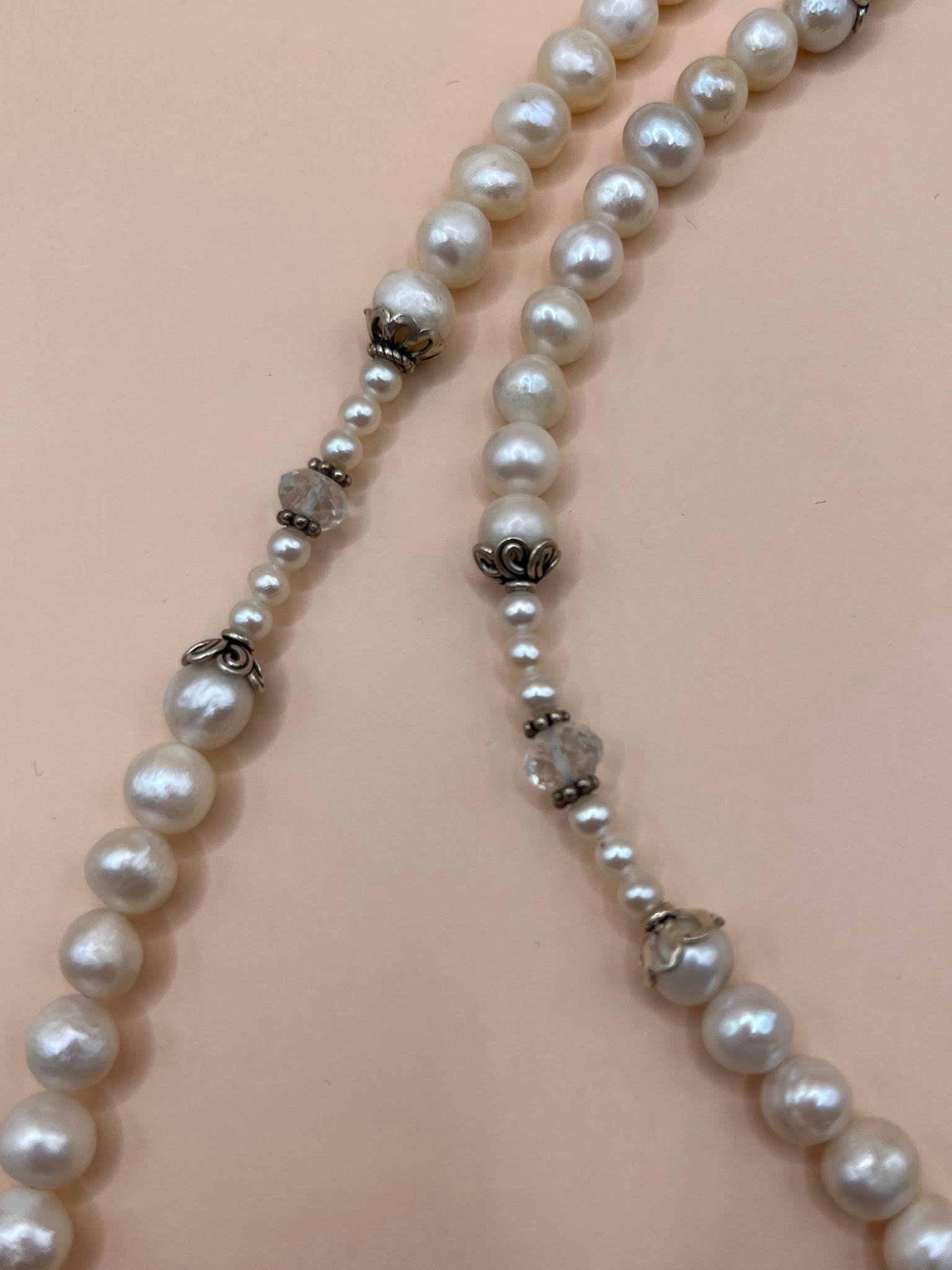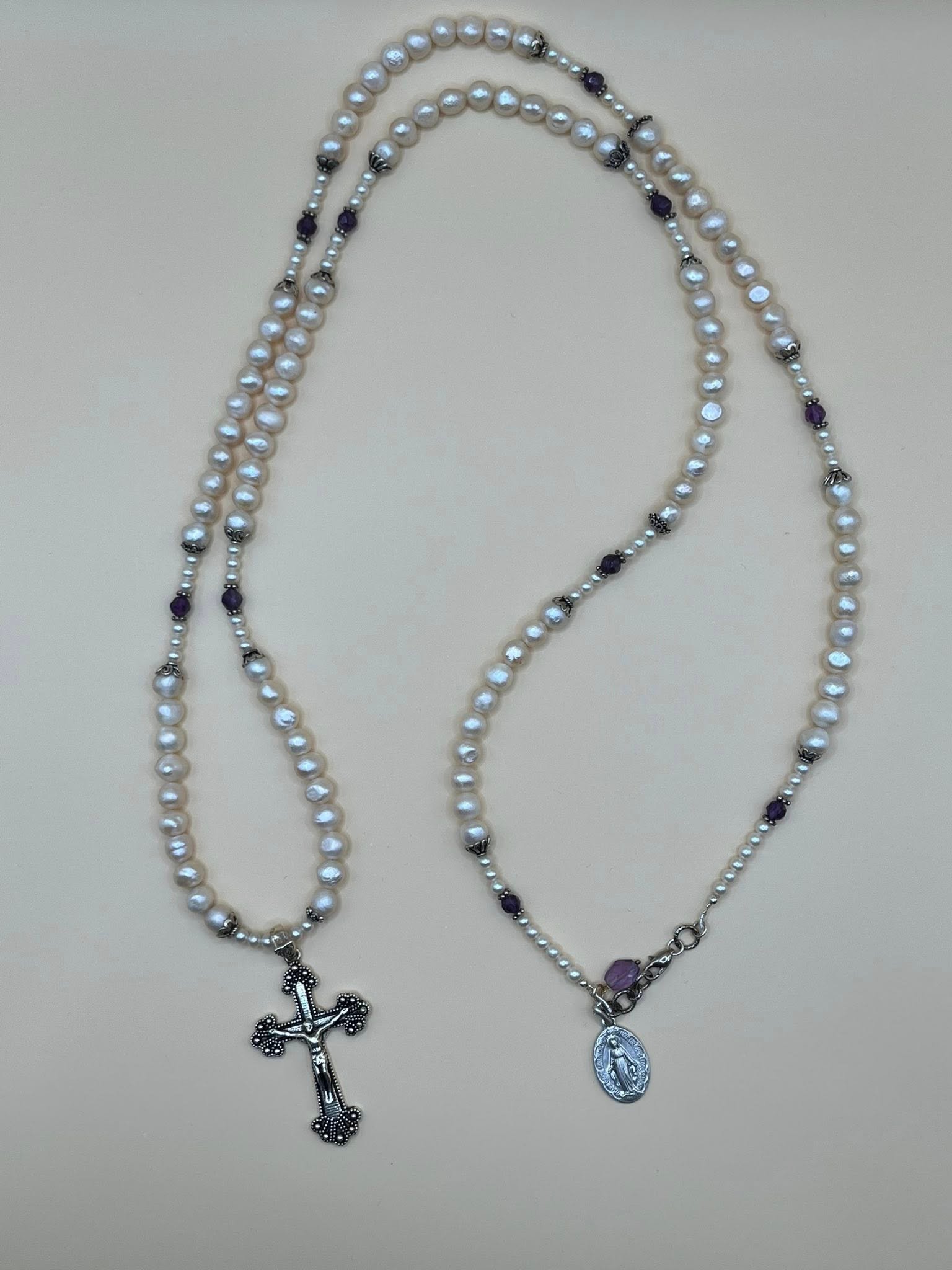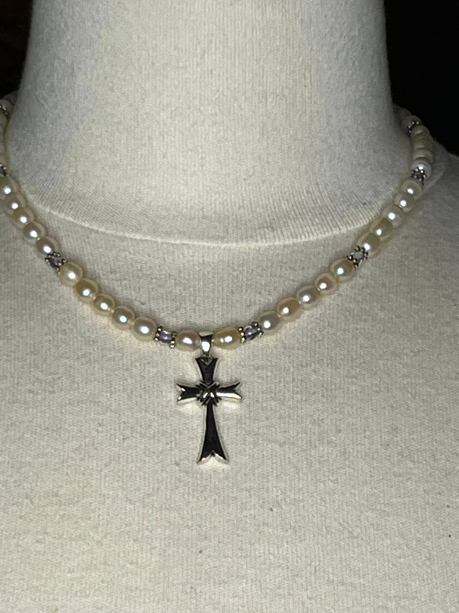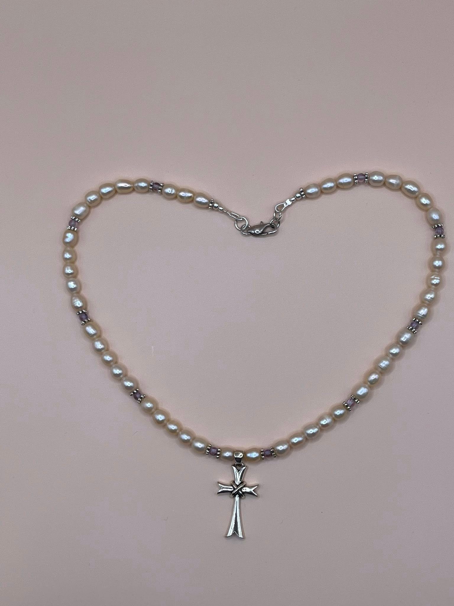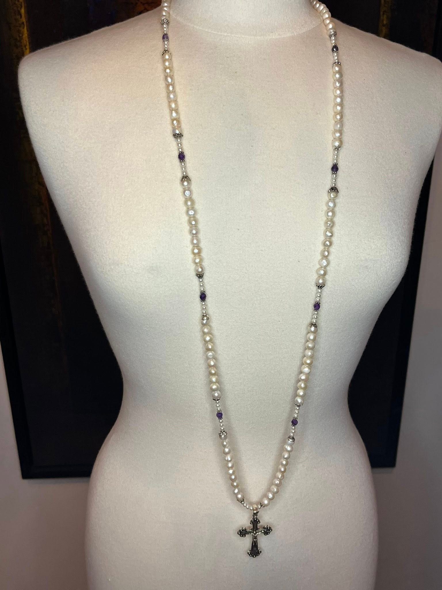 Hommage au Christ Tour de cou en perle de culture et améthyste claire Croix argentée Longueur : 43cm (chaînette d’extension possible)