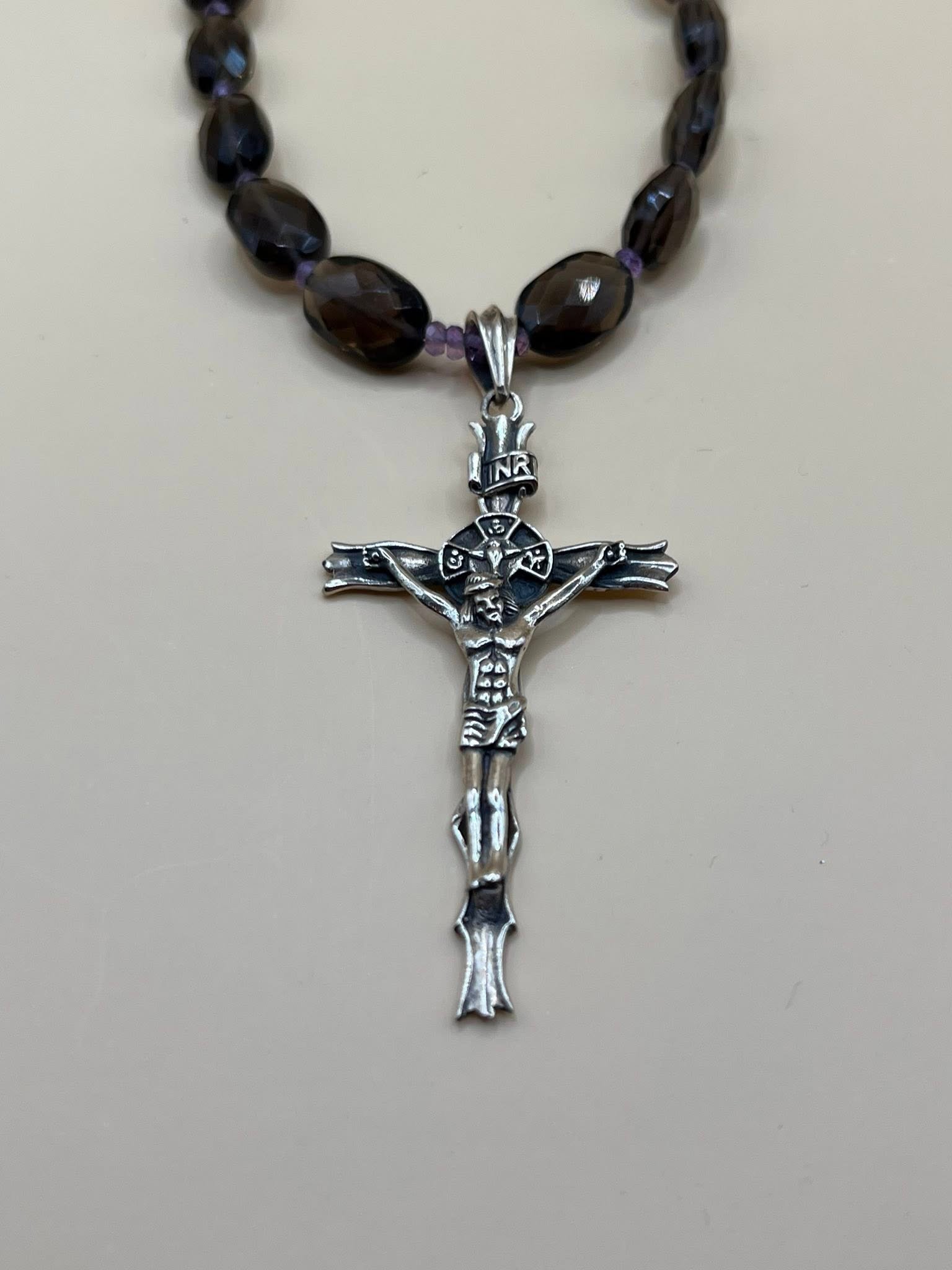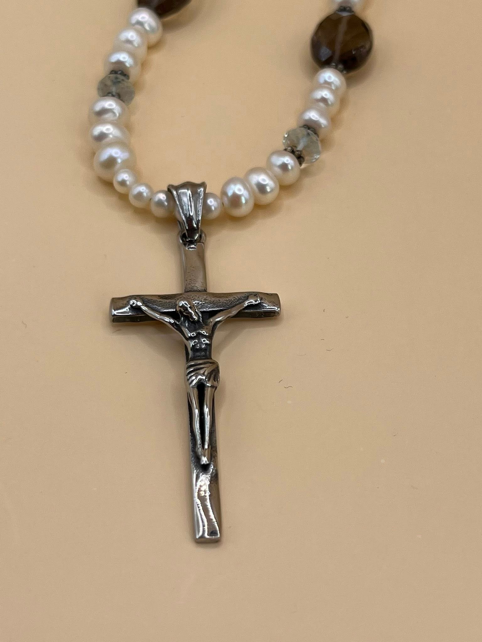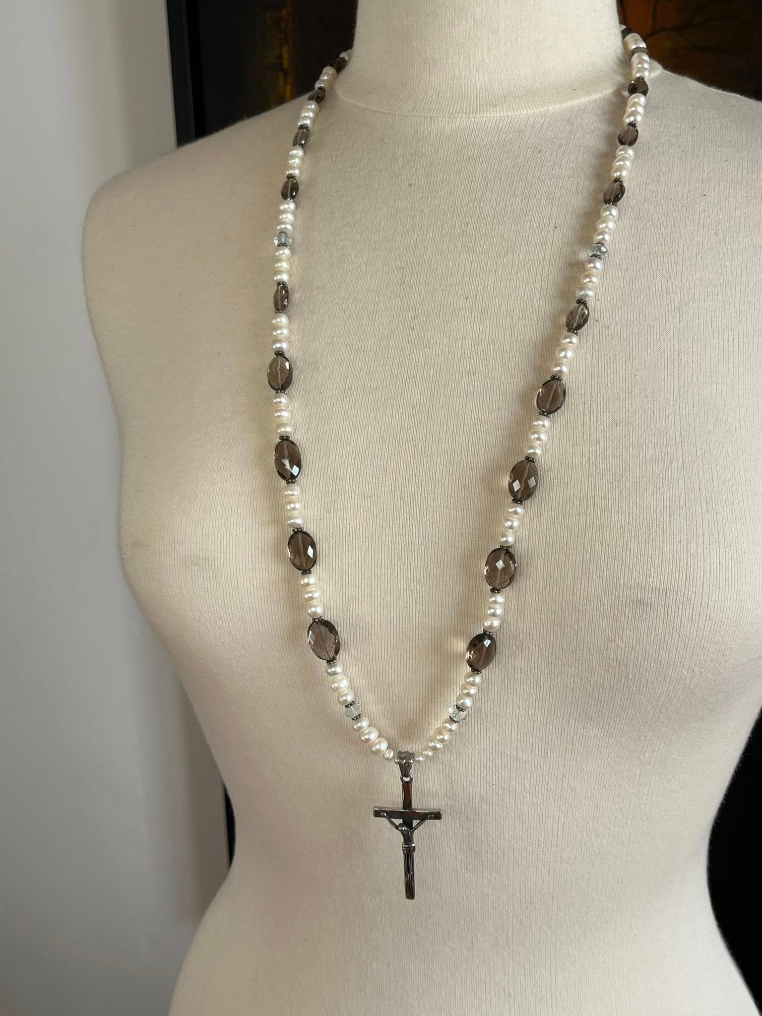 Création unique Sautoir en quartz fumé, améthyste et perle de culture Croix du Christ en Argent 925/eme Longueur : +100cm