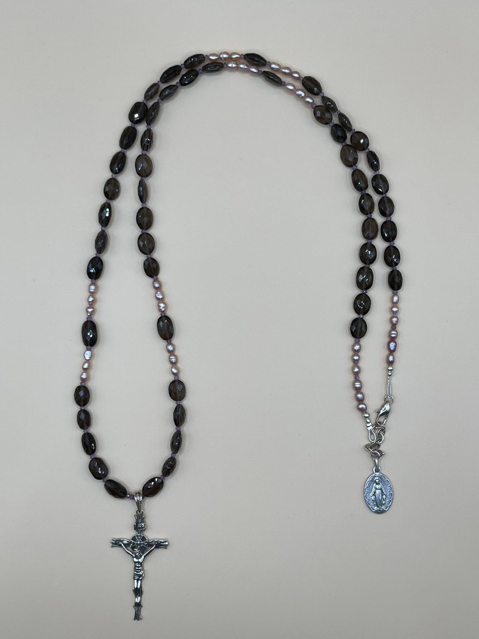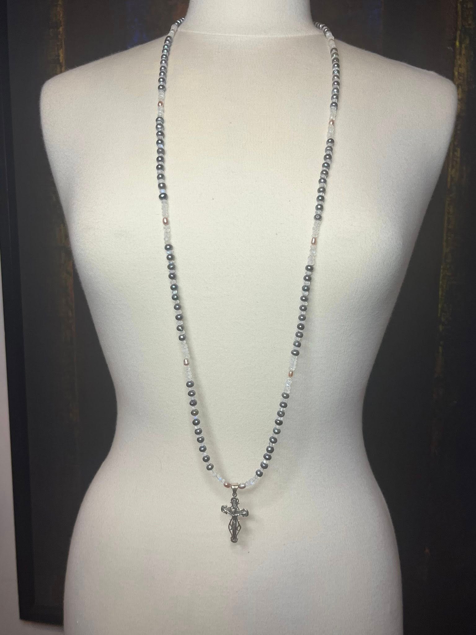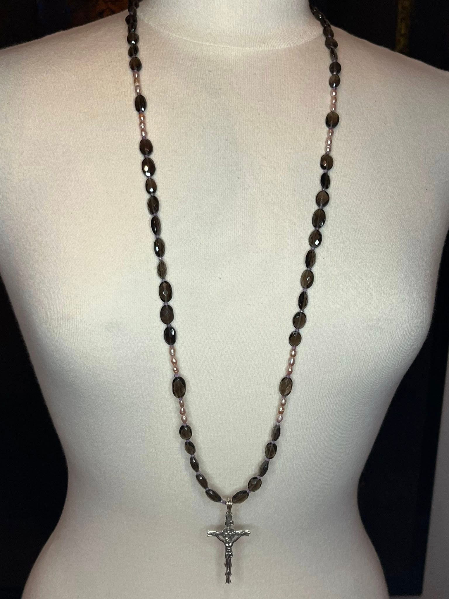 Création unique Sautoir en quartz fumé, améthyste et perle de culture Croix du Christ en Argent 925/eme Longueur : +100cm