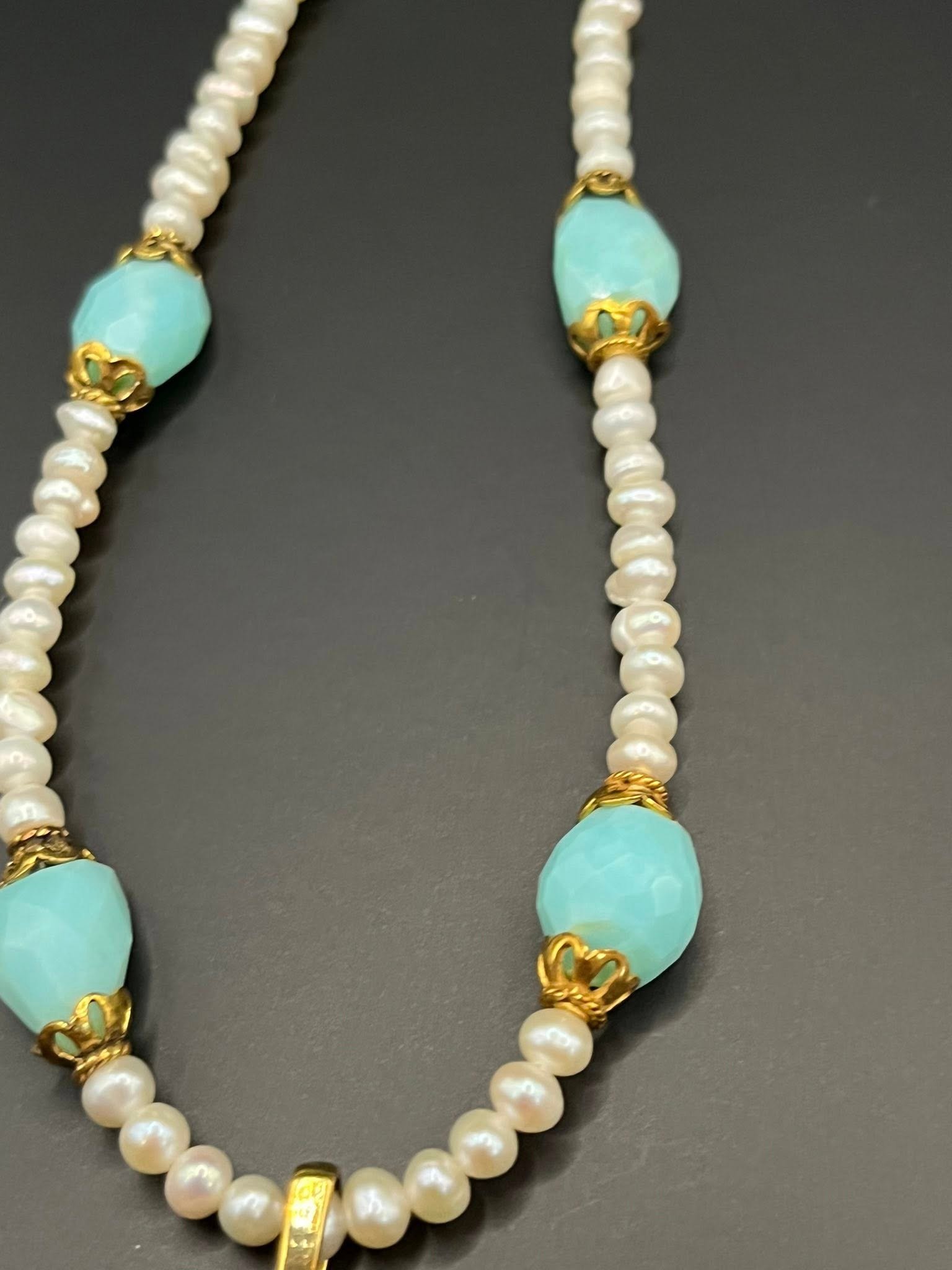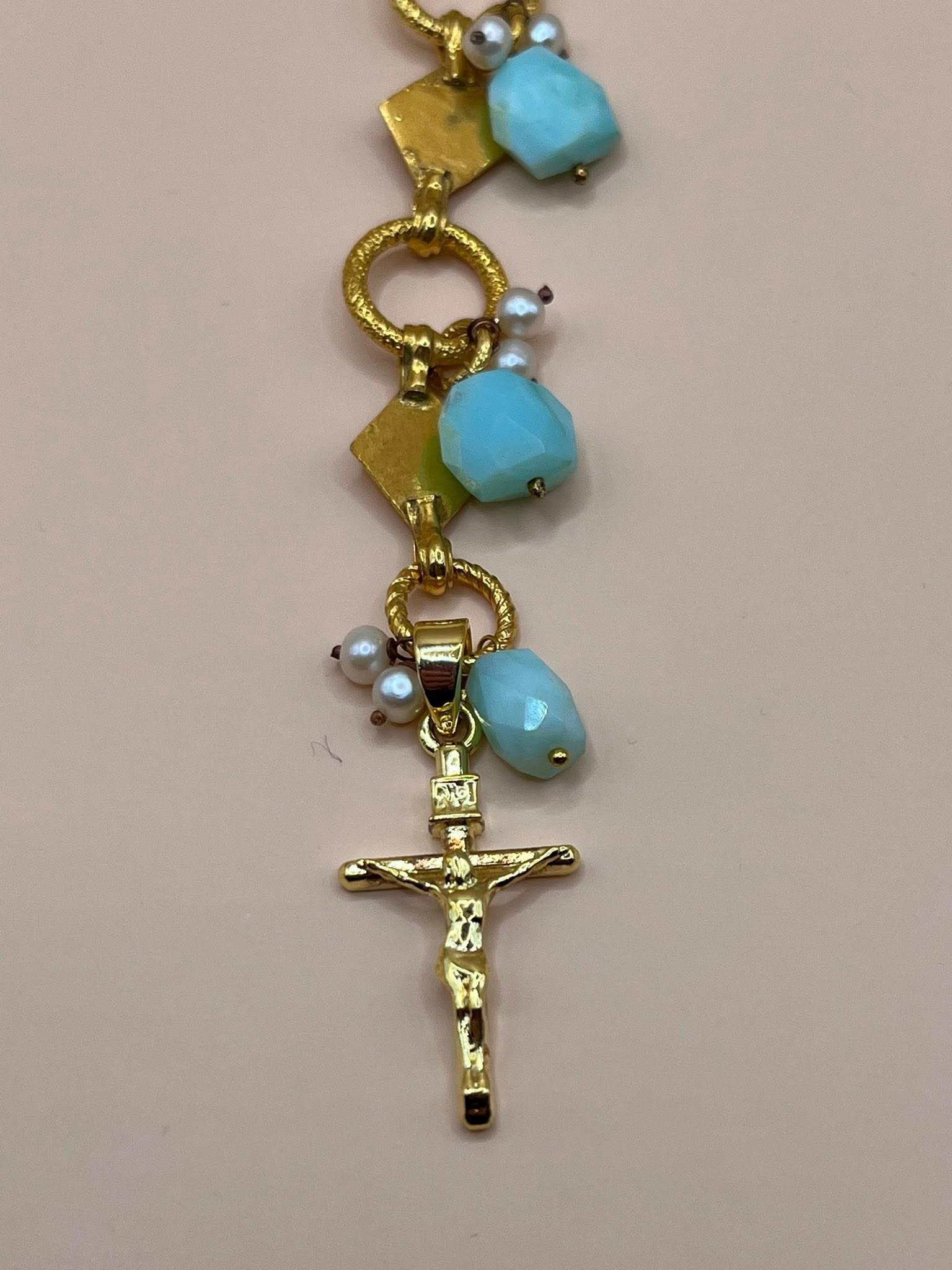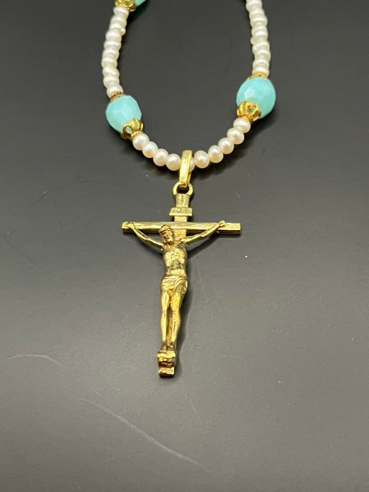 Création unique Collier hommage au Christ Pierre calcédoine facettées, perle de culture Apprêts anciens dorés à l’or fin Cornaline en fermoir et Croix du Christ dorée Longueur : 51cm + chaînette d’extension