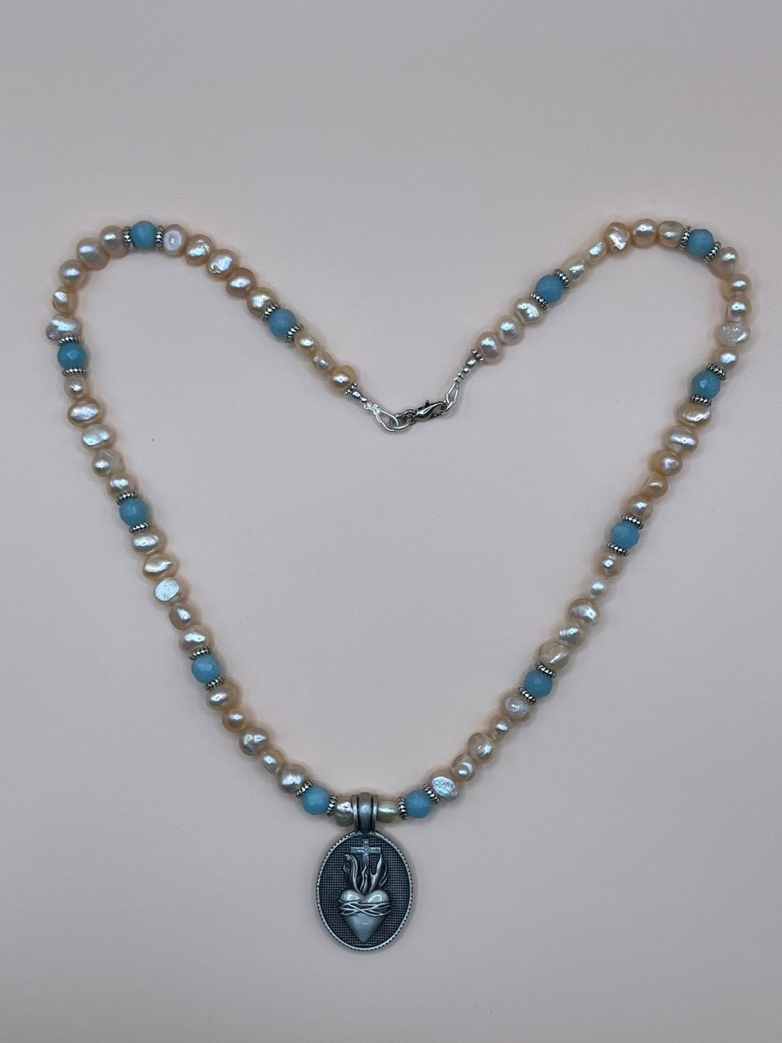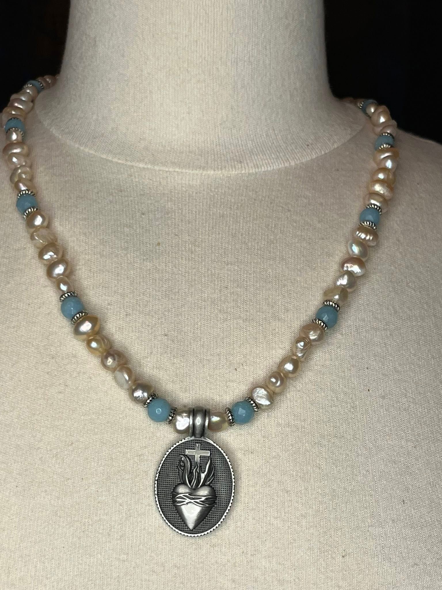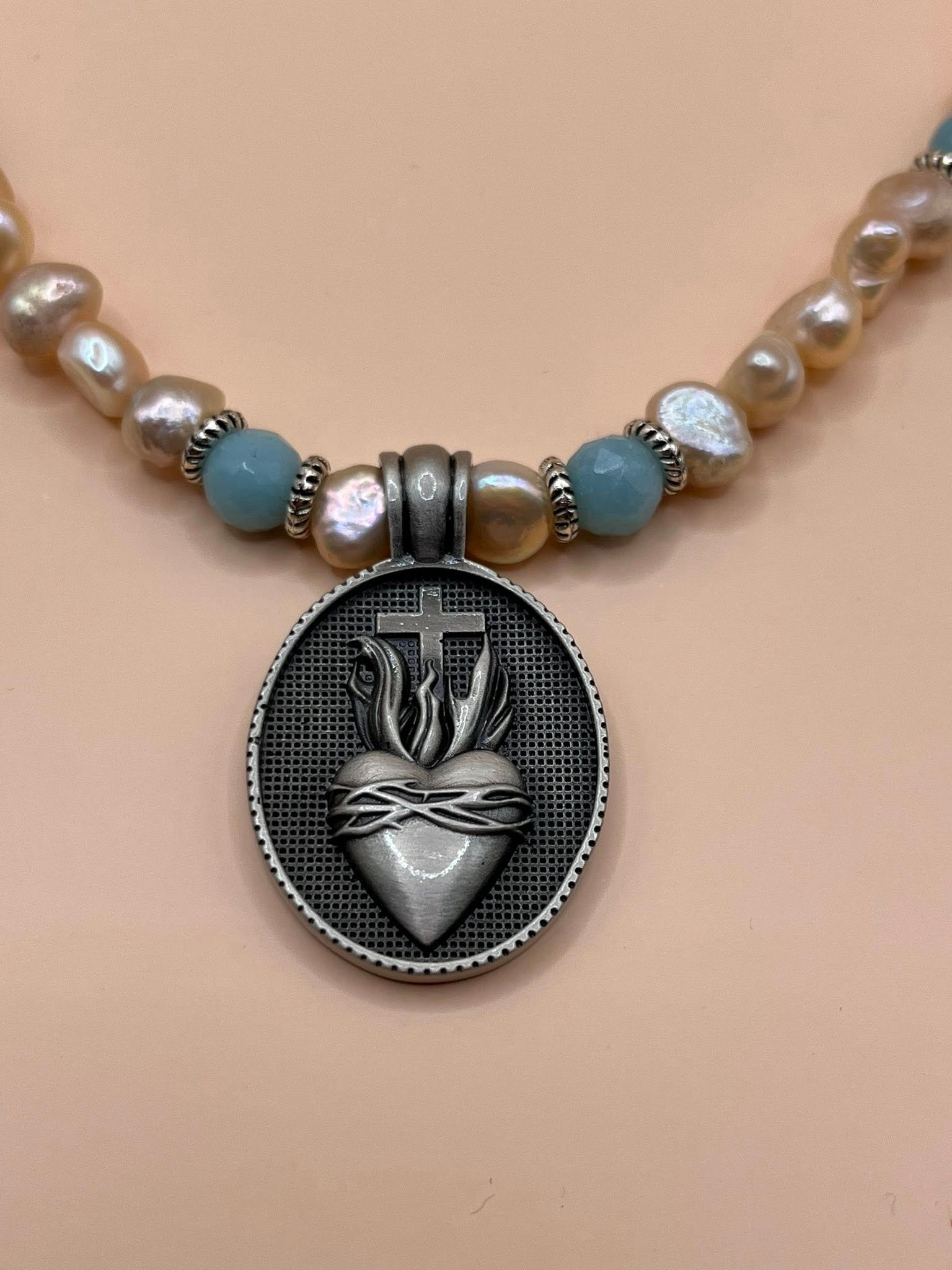 Collier Sacré Coeur Perles de culture saumon, aventurine Médaillon Sacré Coeur inox Au choix médaille sur fermoir Vierge Marie ou Archange Mickael Longueur : 56cm (chaînette d’extension possible)