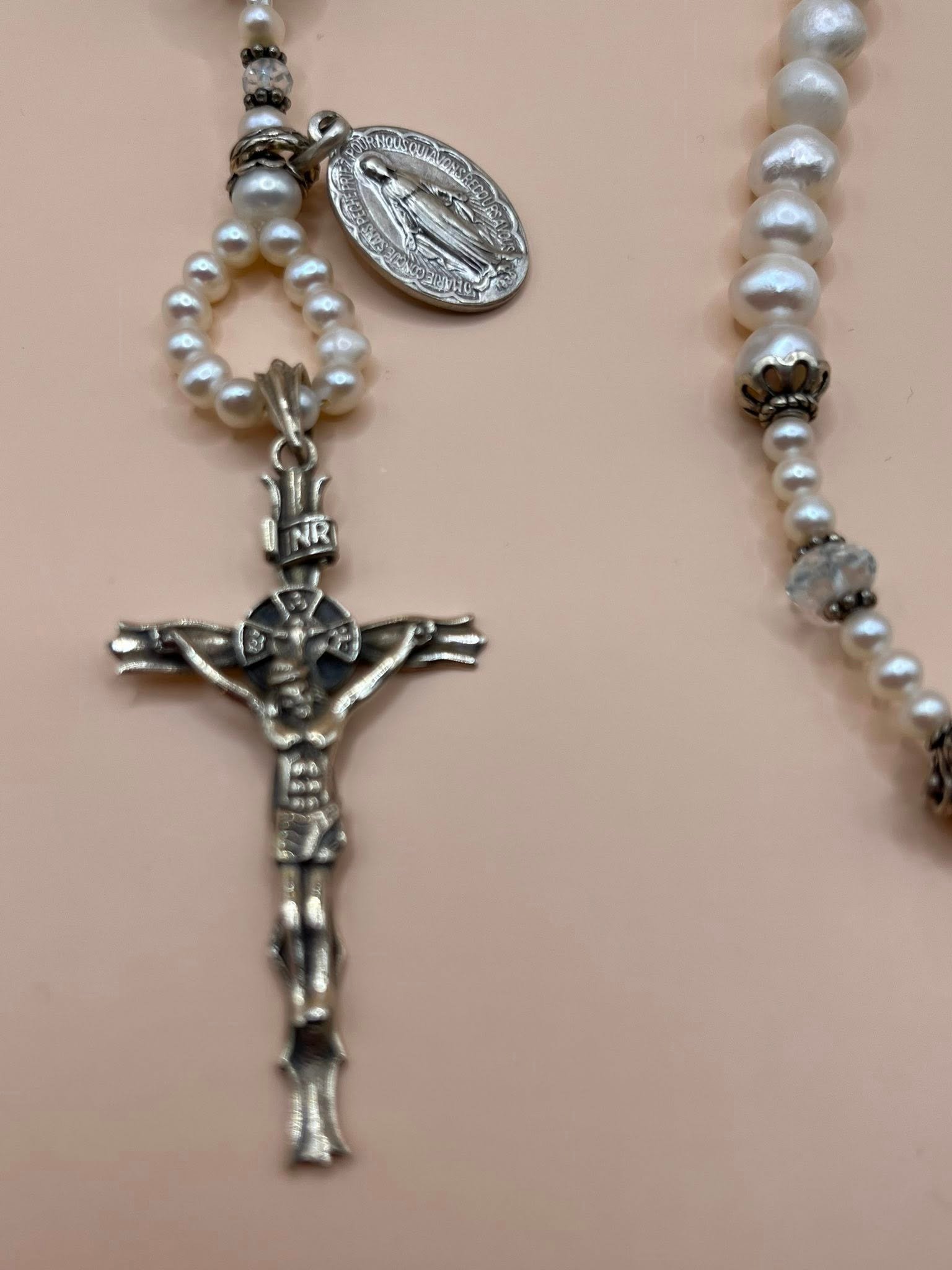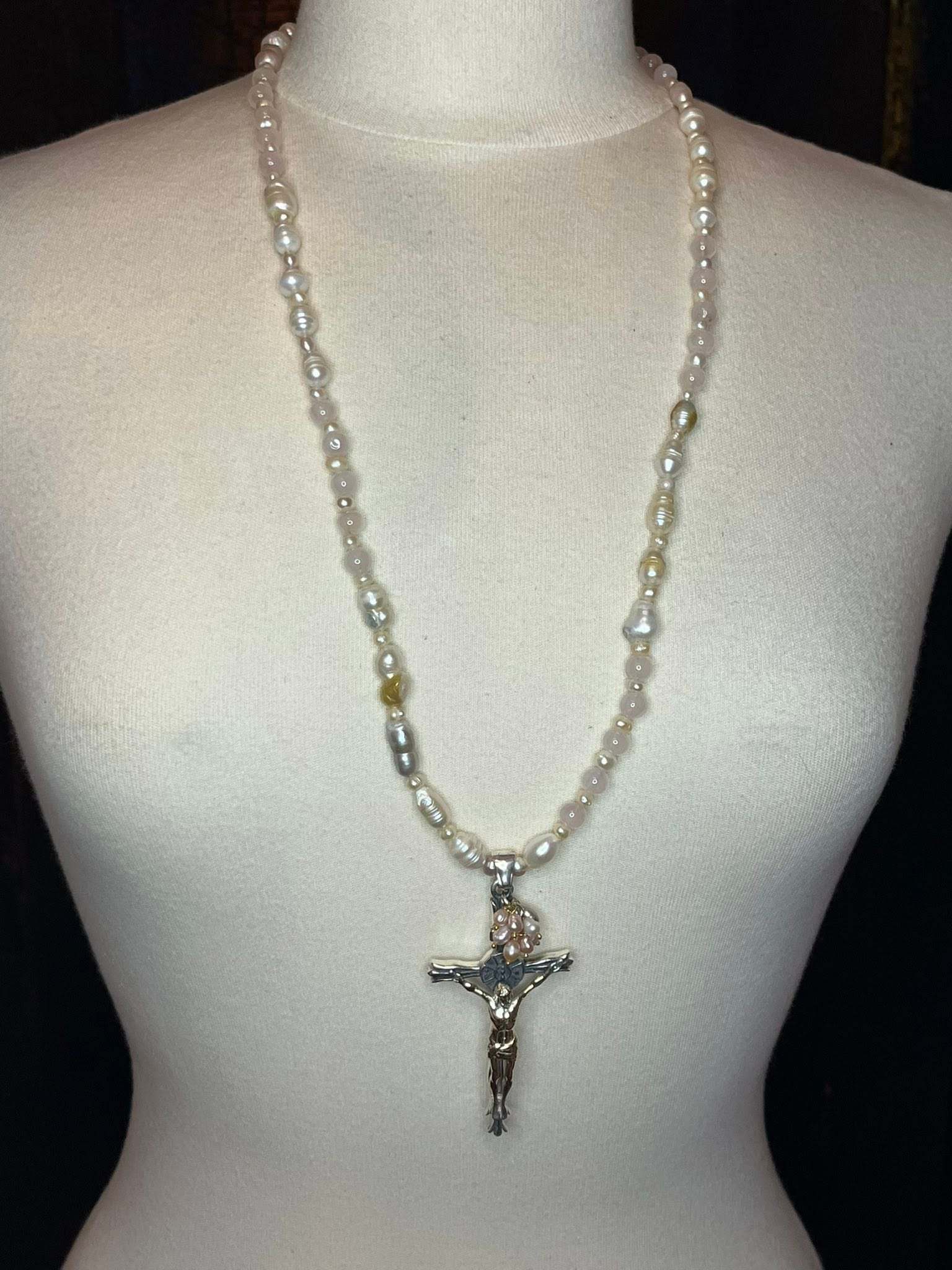 Création unique Hommage à Jésus Christ Long collier de perle de culture baroque et quartz rose Pendentif doré et médaille de la Vierge Marie Longueur : 80cm (possibilité d’ajouter une chaînette de finition)
