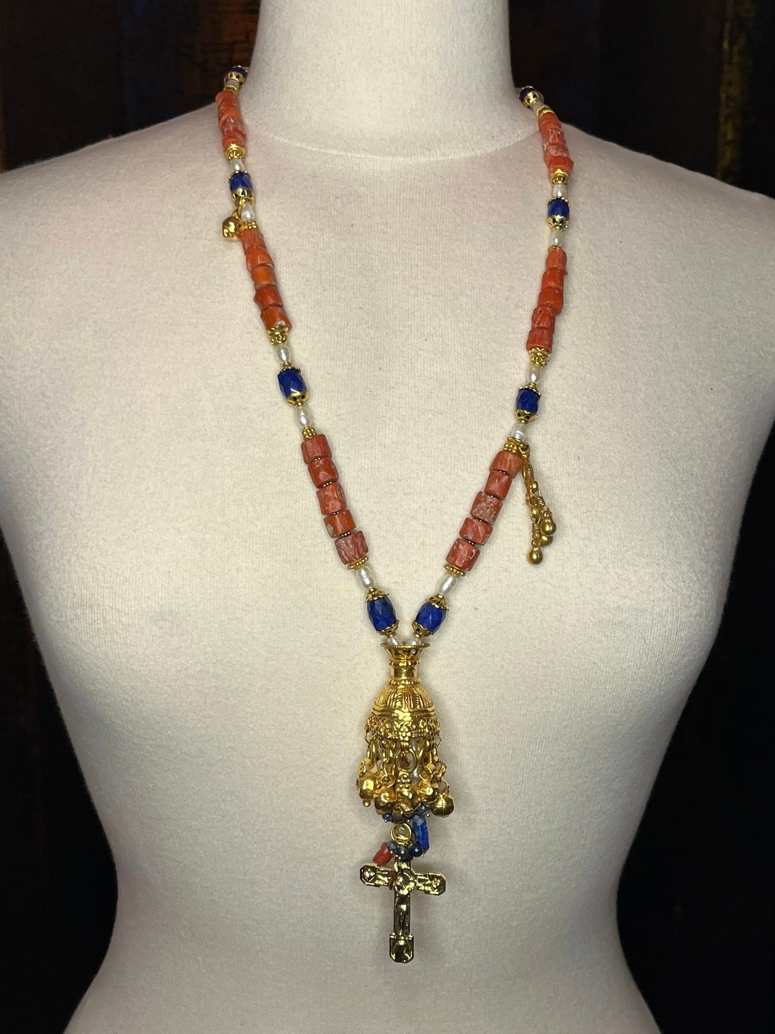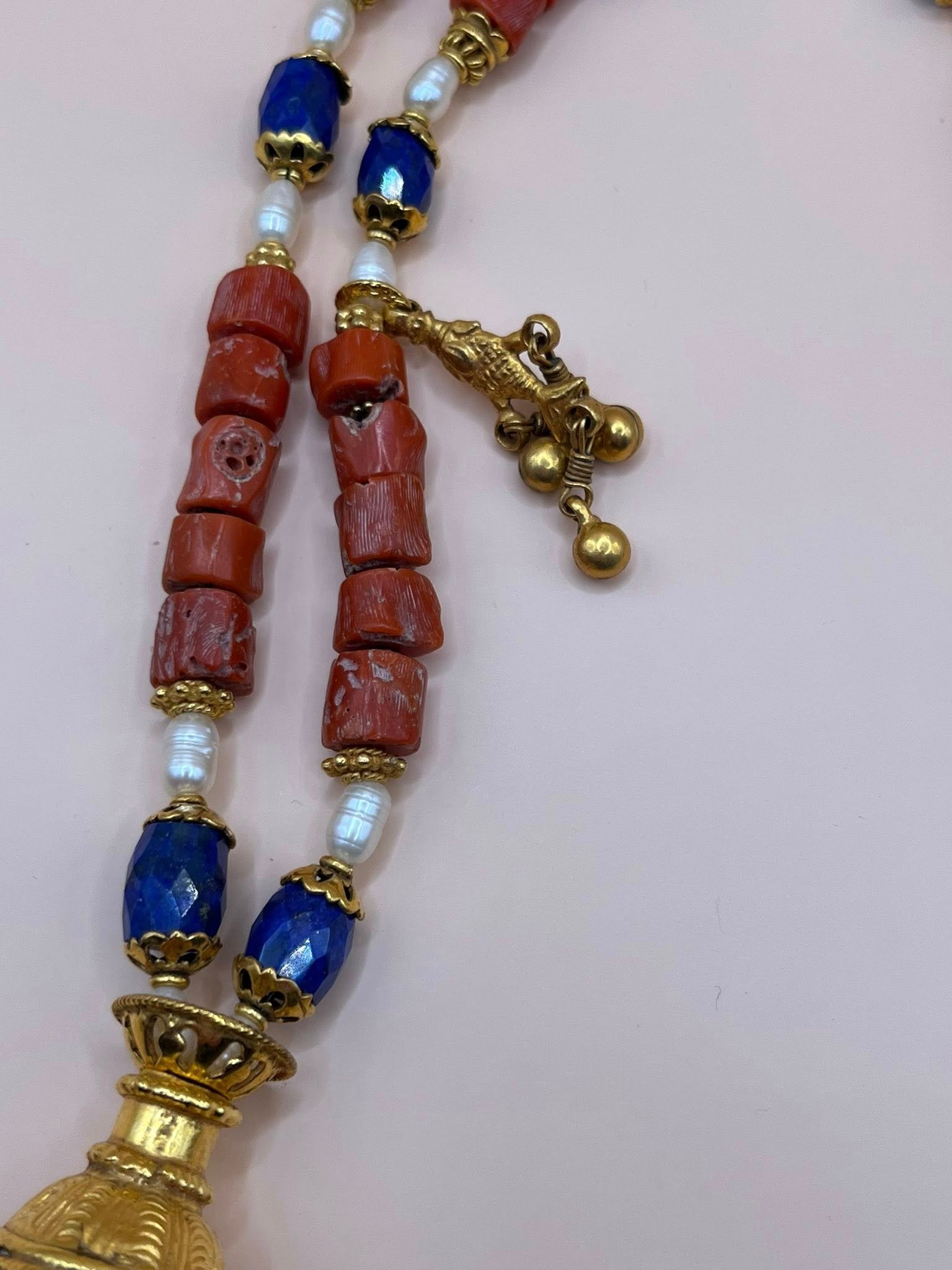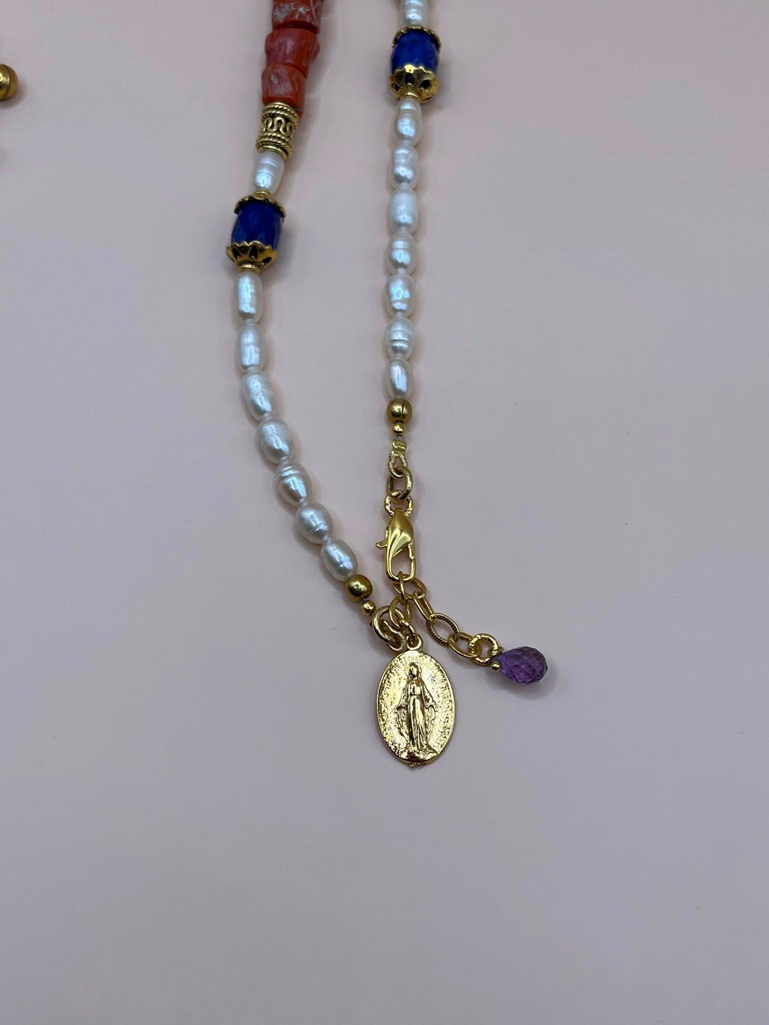 Collier unique Corail Tibétain fossilisé fantaisie, lapiz lazuli, perle de culture Briolette améthyste en fermoir Pendentifs antiques et Vierge Marie dorés à l’or fin 24 carats Longueur : 78cm