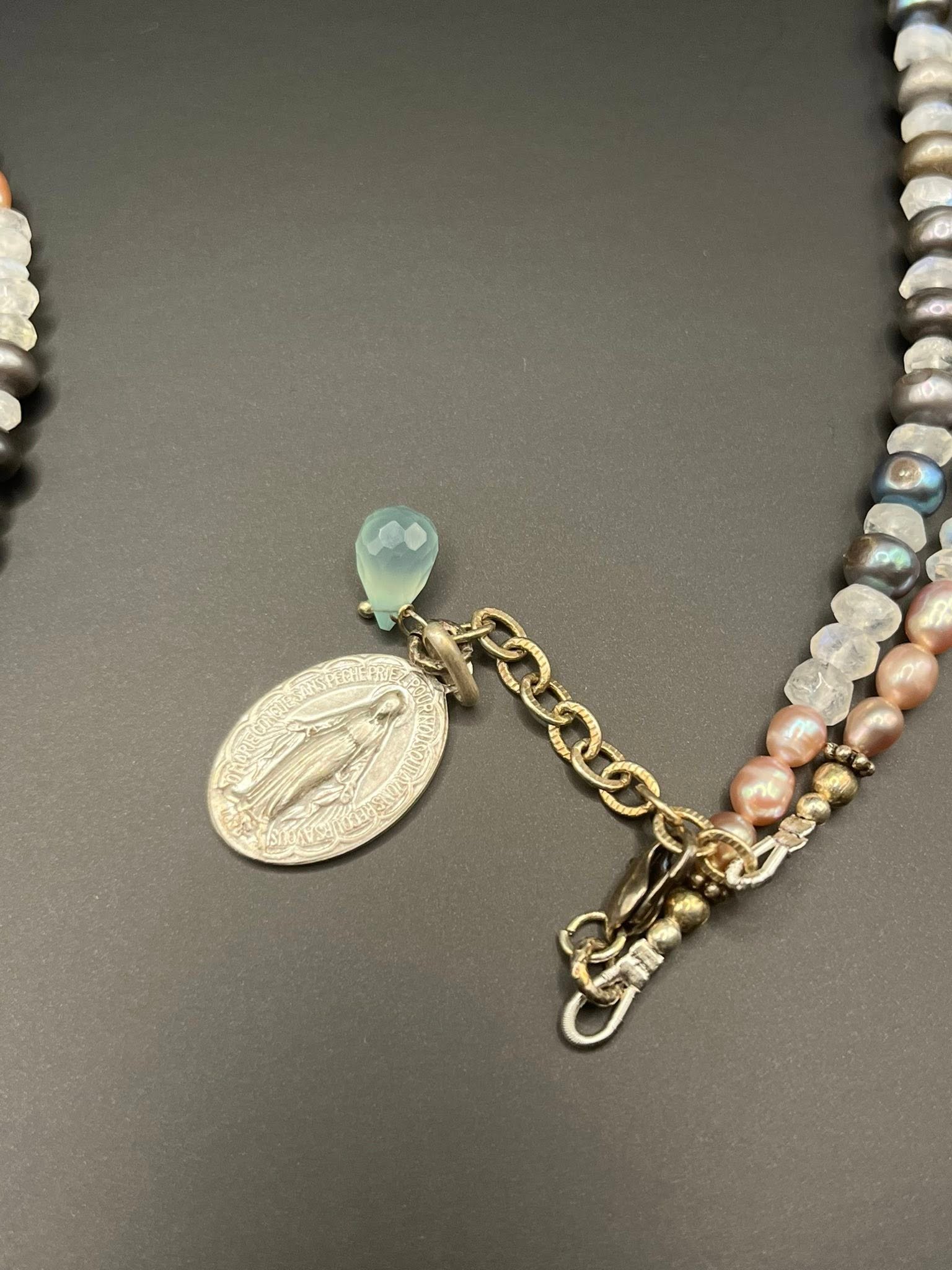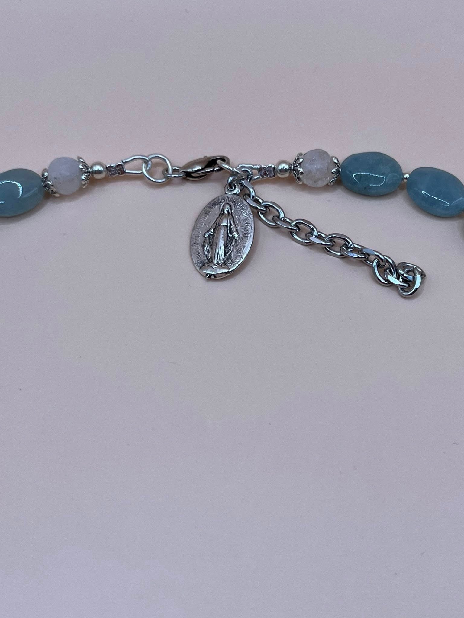 Collier unique Aigue Marine, Pierre de lune, perle de culture Christ en argent 925/eme Medaillle Vierge Marie en fermoir plaquée argent Longueur : 42cm + chaînette