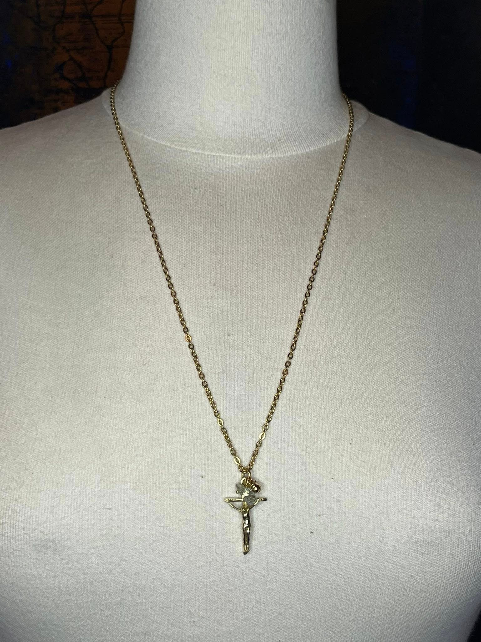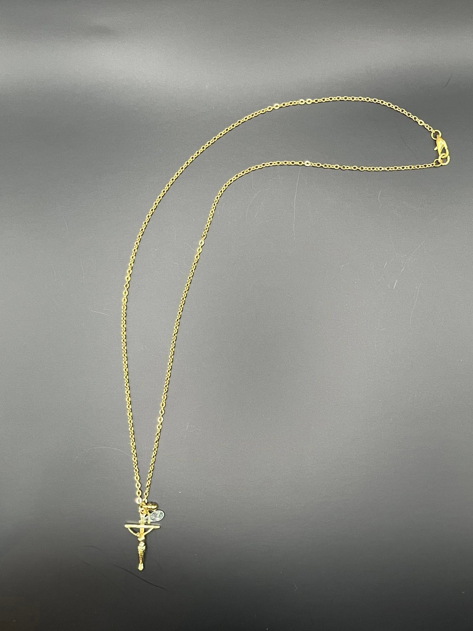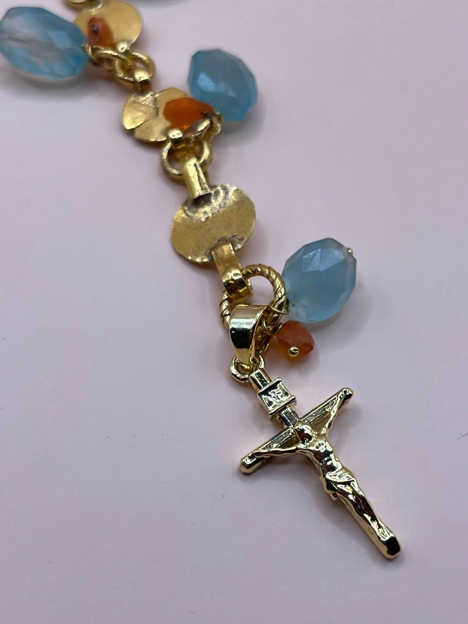 Long Collier hommage au Christ Briolette d’aigue Marine, clochette dorée à l’or fin Croix du Christ dorée Longueur : 62cm