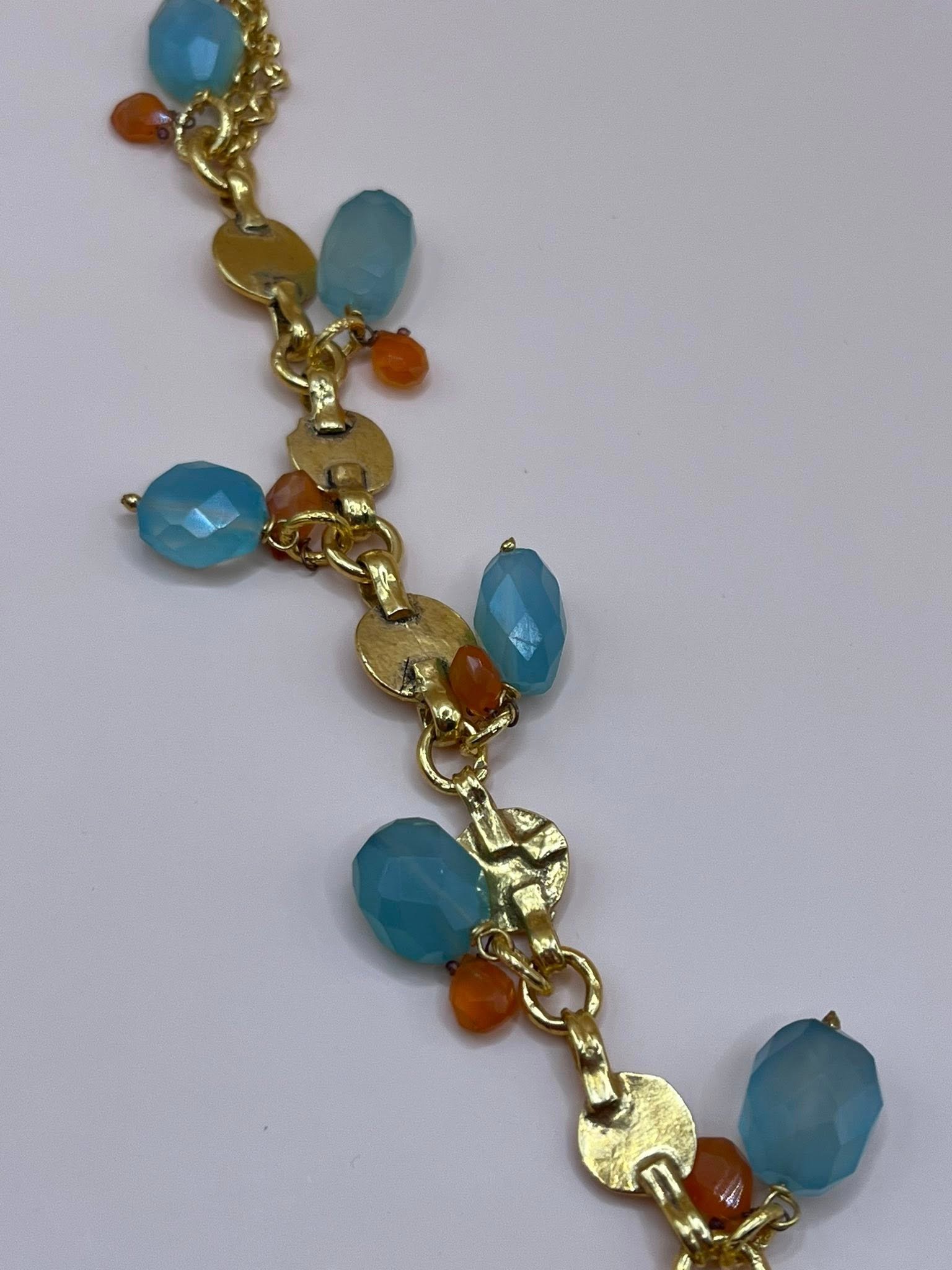 Création unique Un Dizainier est un chapelet d’une taille moins importante qu’un chapelet traditionnel. Celui-ci est unique par ses composants : breloques antiques indiennes (XIXème) dorées à l’or fin 24 carats, calcédoine facettée bleue, briolettes de cornaline et Christ doré. Longueur : 32cm