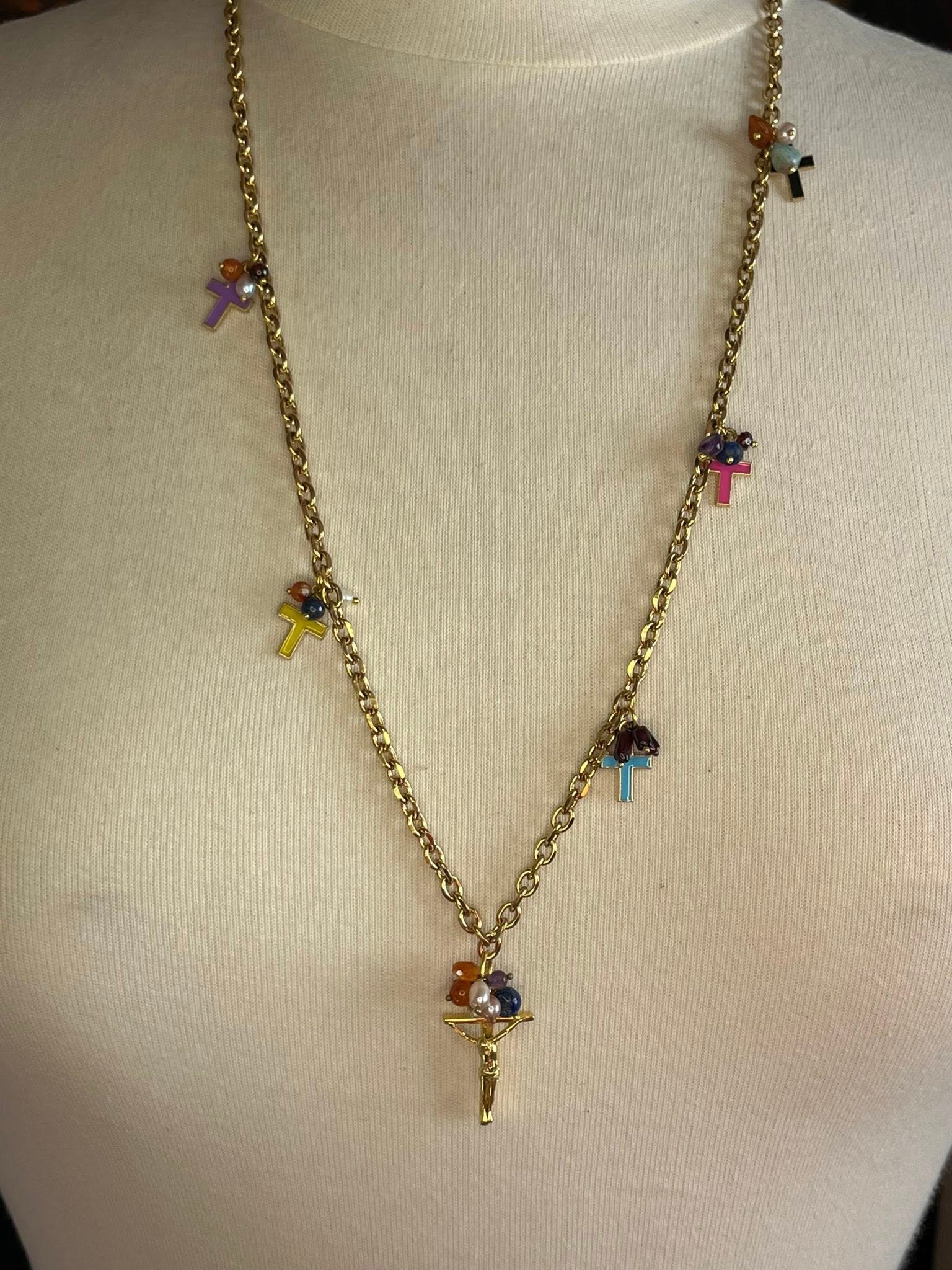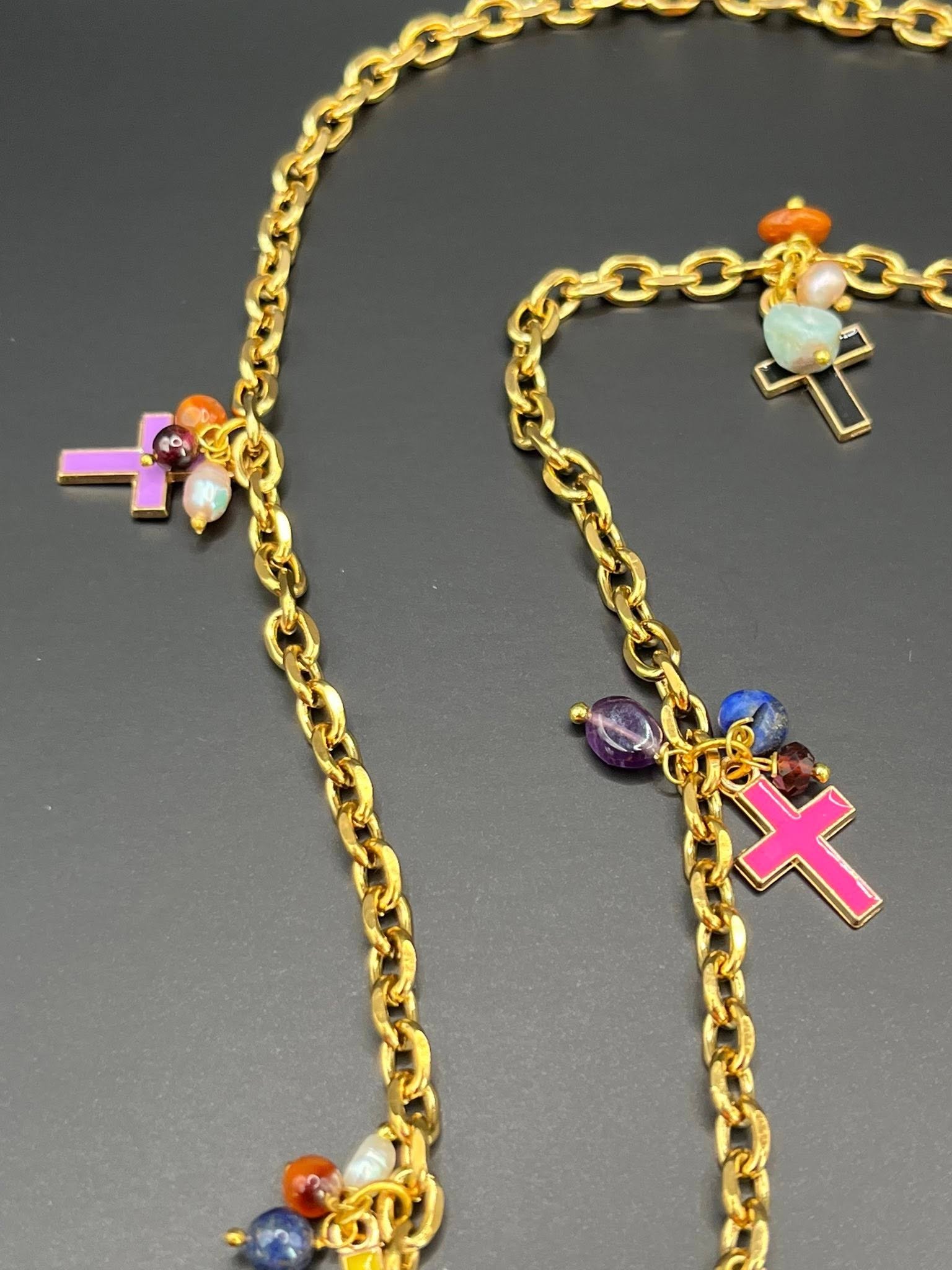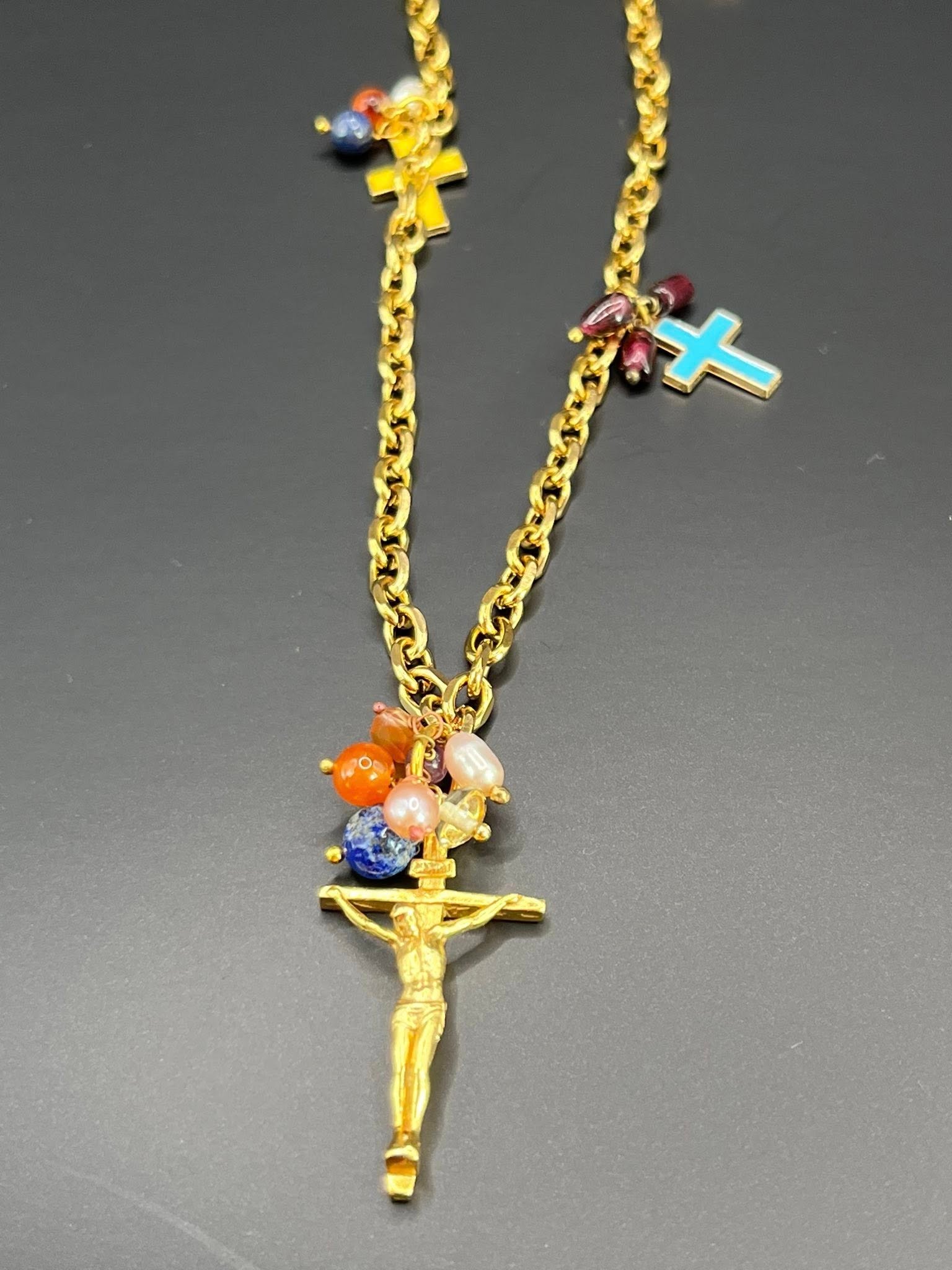 Sautoir Hommage au Christ Croix du Christ dorée, petites croix émaillées Breloques de cornaline, lapiz lazuli, grenat, perle de culture Longueur : 68cm