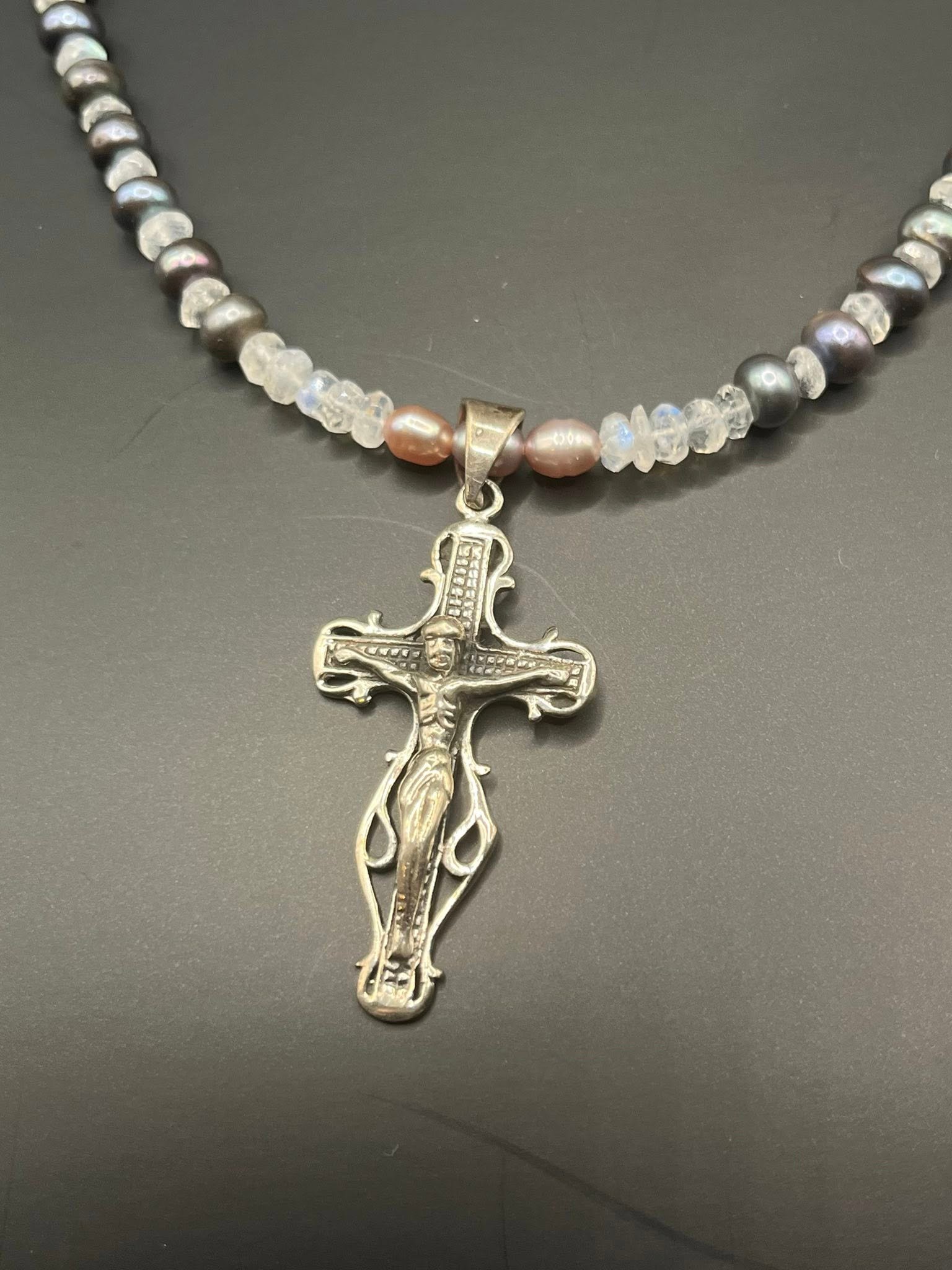 Long sautoir Collier en perles de culture nacrée et pierre de lune Briolette de calcédoine en fermoir Croix du Christ en argent 925eme Longueur : 106cm