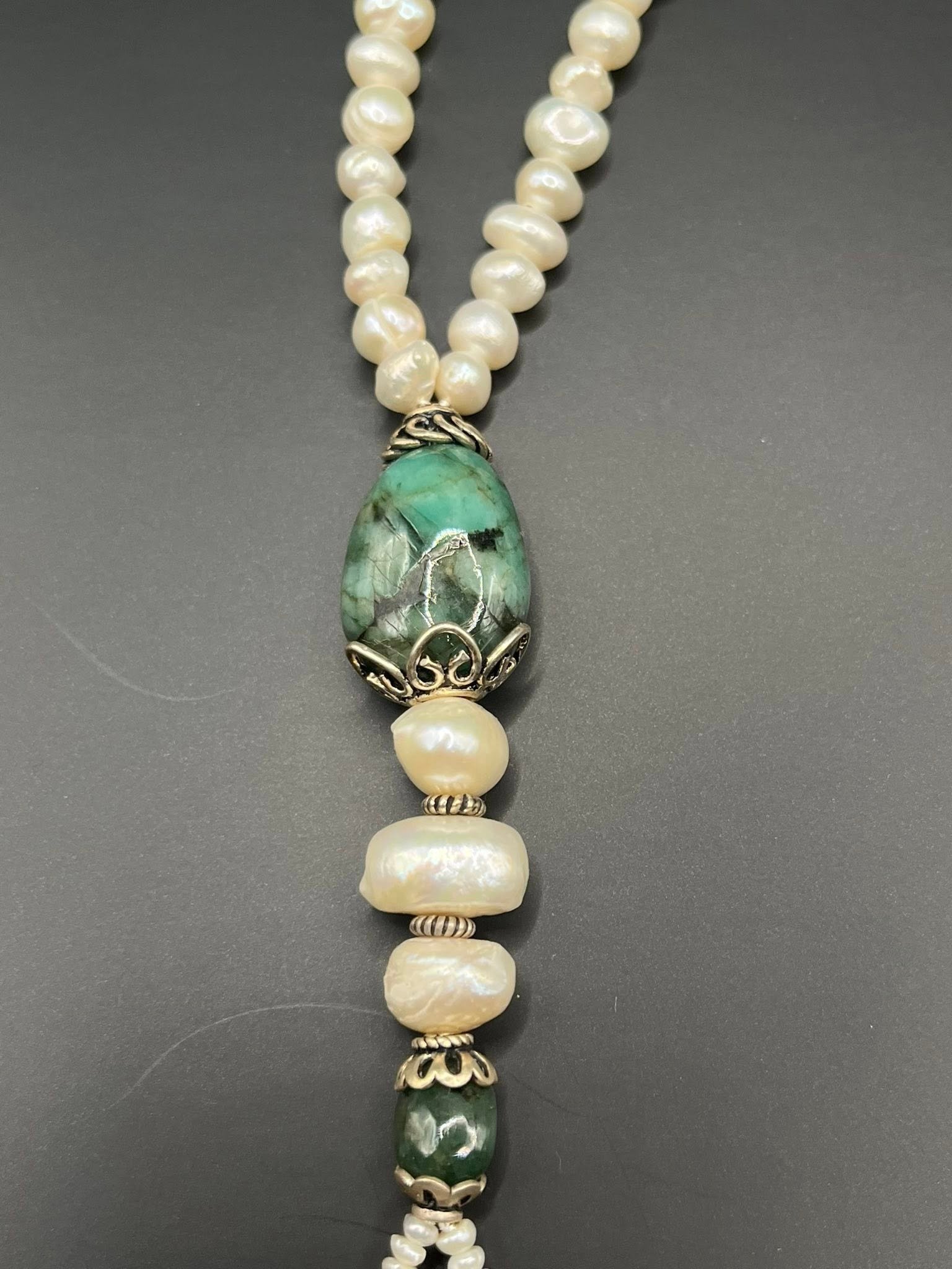Collier Unique Émeraude et perle de culture Croix du Christ en argent 925eme Briolette d’améthyste en fermoir Longueur : 57cm environ