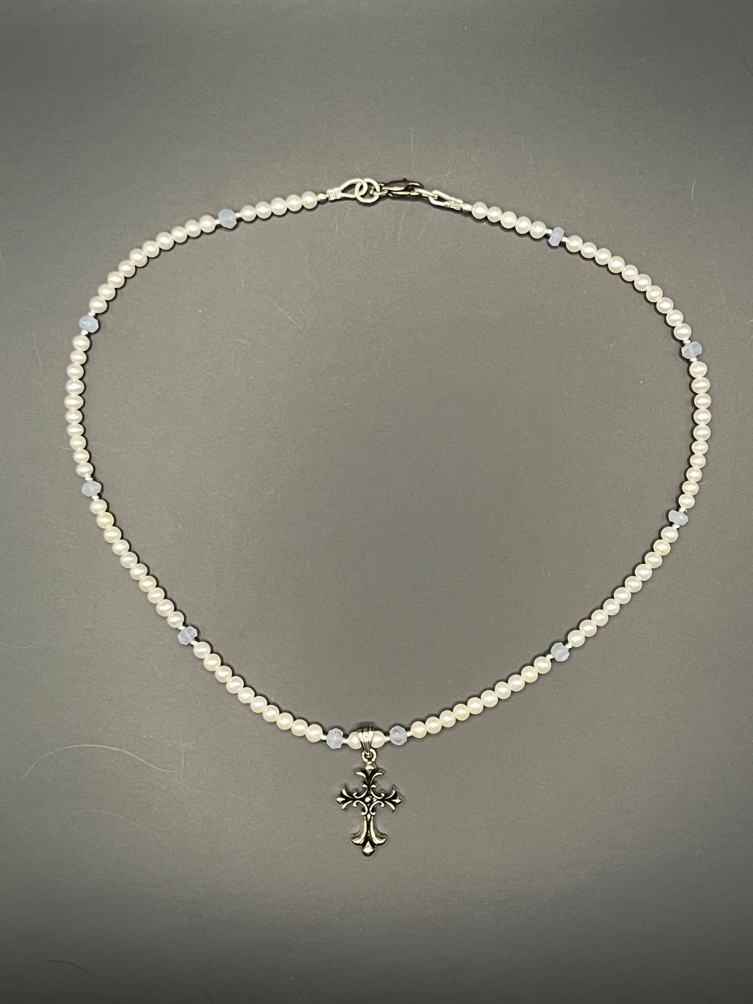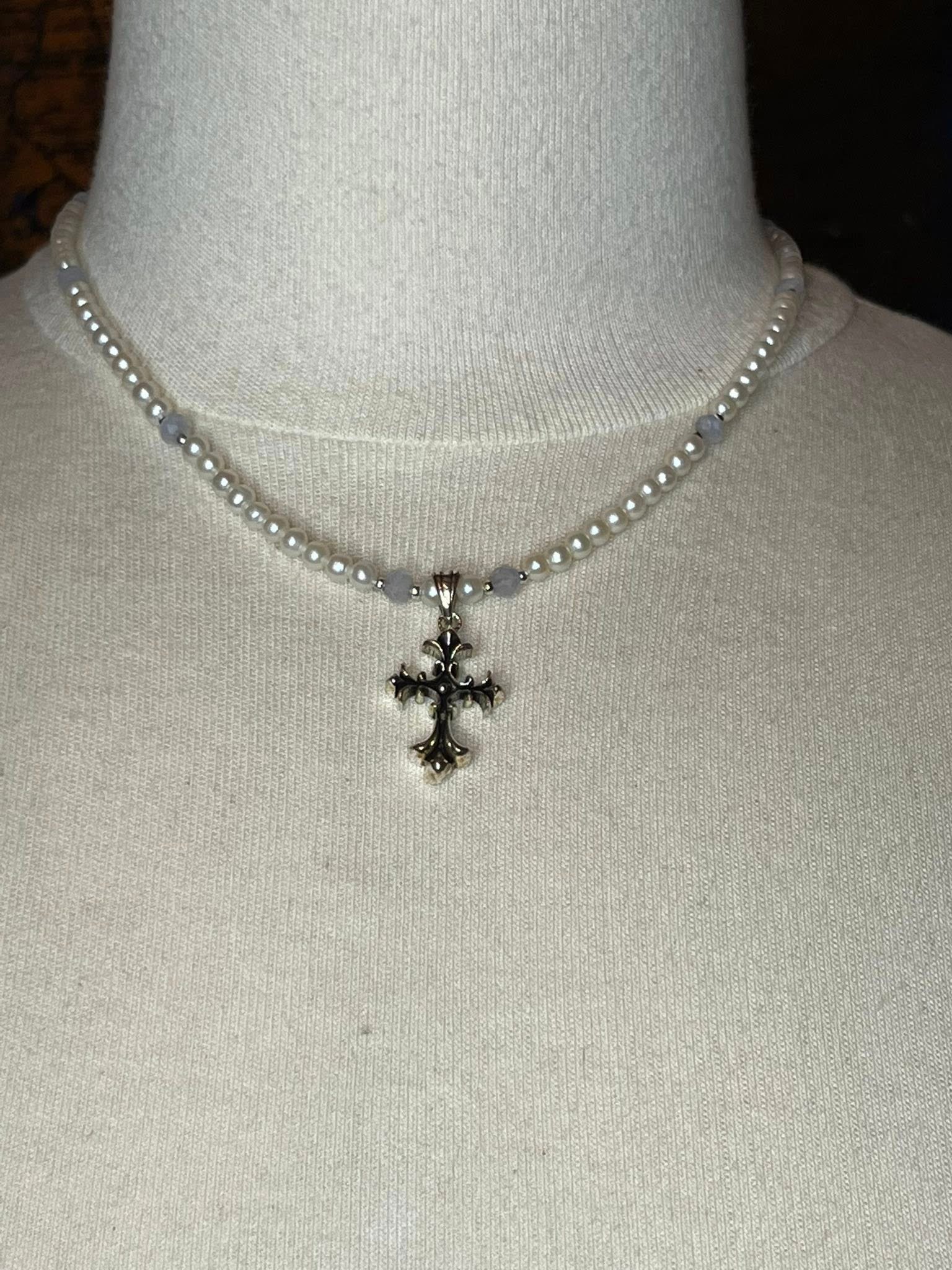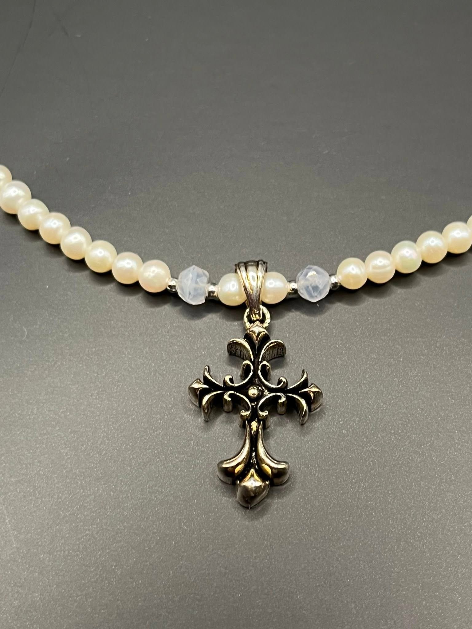Charmant collier Tour de cou en perle de culture haut de gamme et bouton facetté de calcédoine Croix du Christ argentée Longueur : 42cm (chaînette d’extension possible sans supplément)
