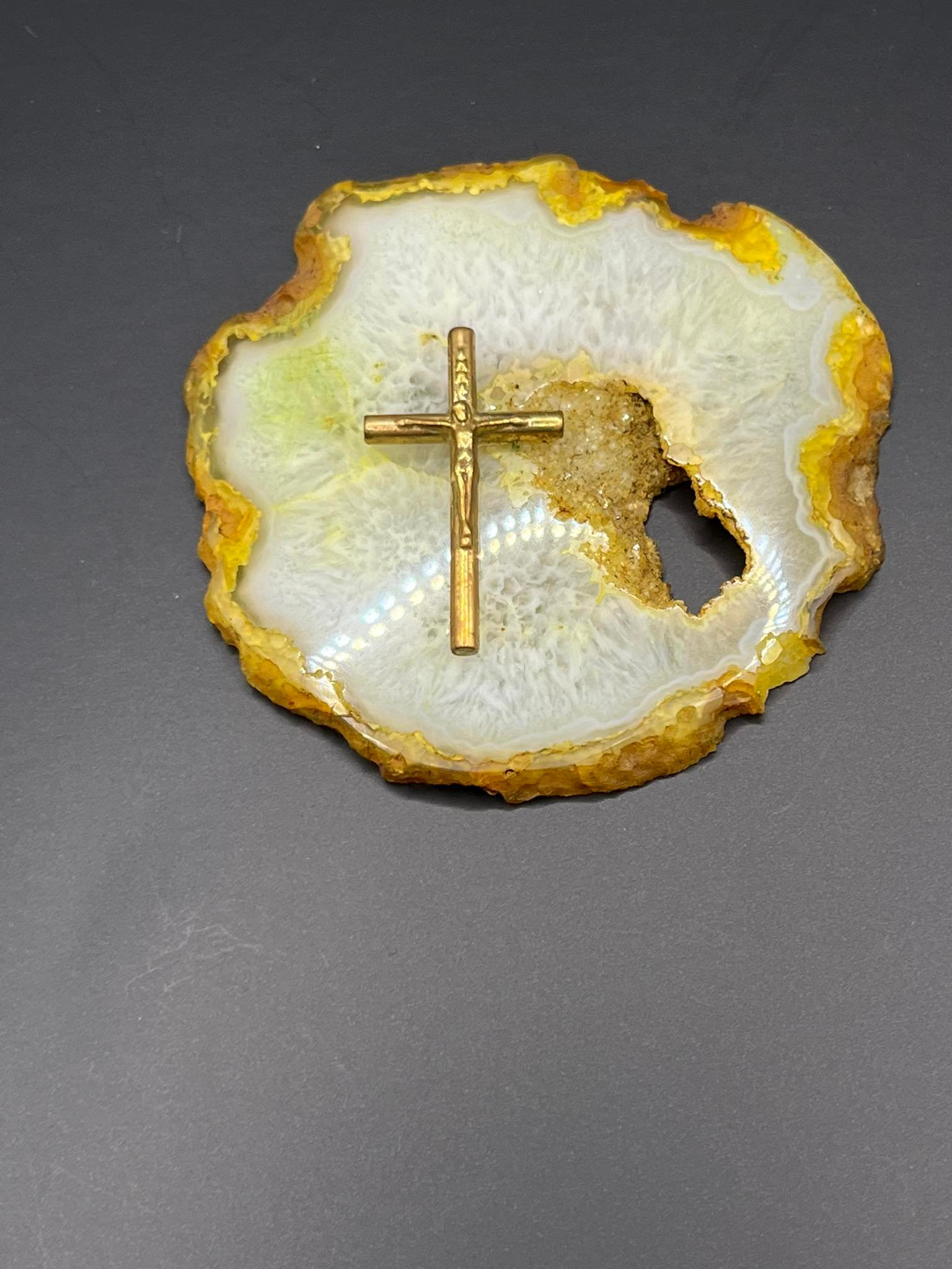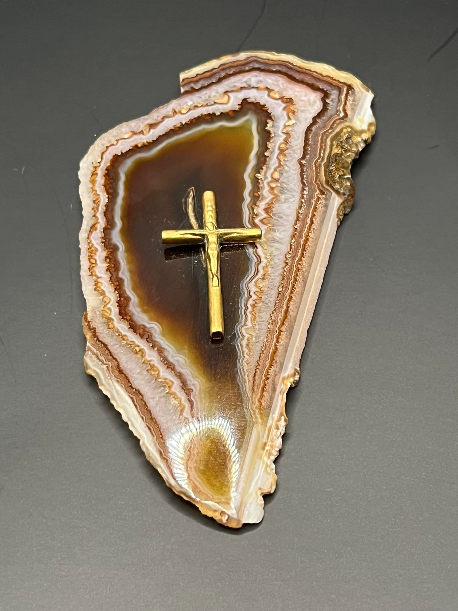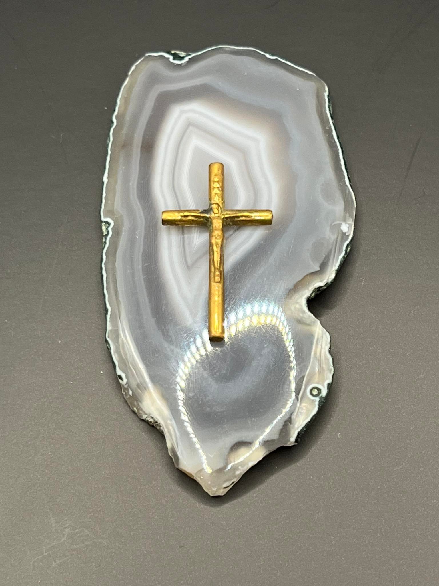 Presse Papier en Hommage au Christ Plaque de calcédoine avec la croix du Christ dorée Dimensions : 9cm x 5cm