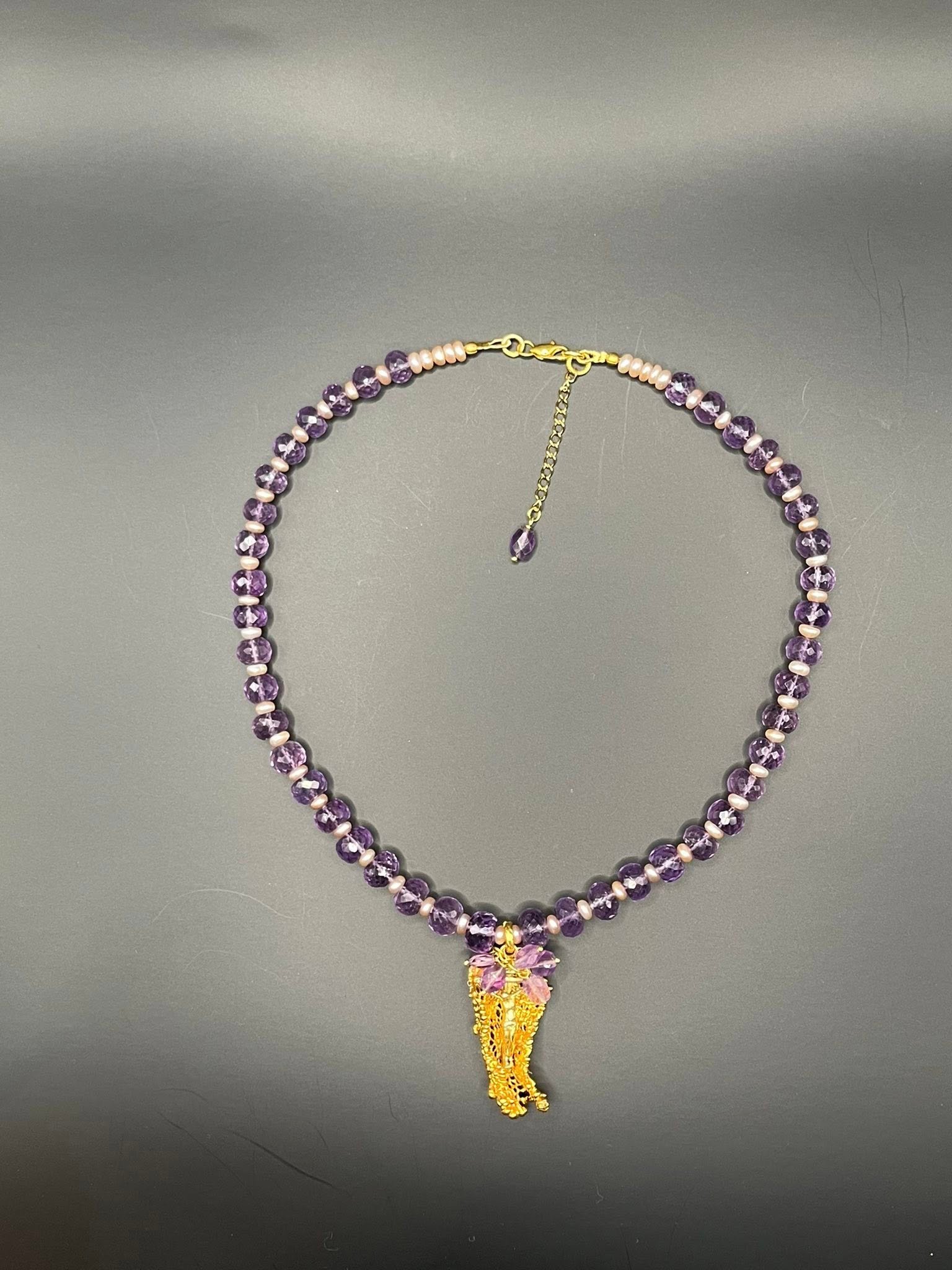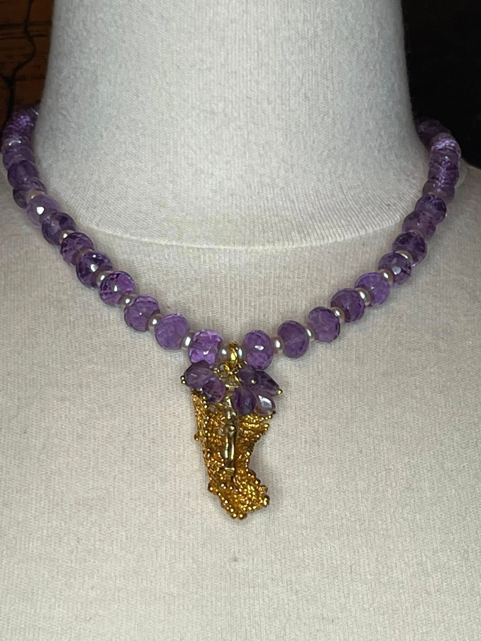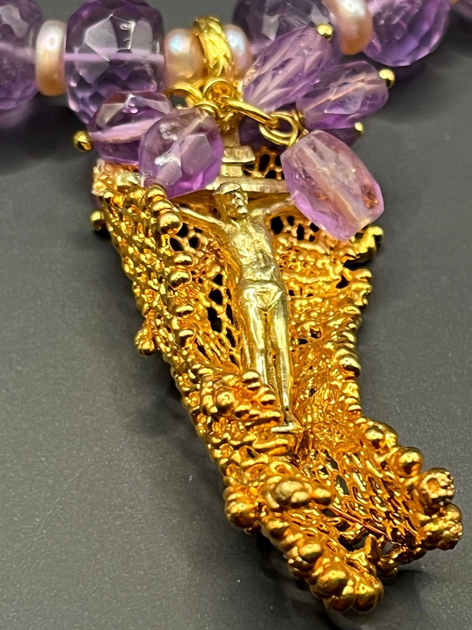 Sublime tour de cou en améthyste facettée et perle de culture Pendentif réalisé dans de la dentelle dorée à l’or fin 24 carats dans laquelle est enchâssée une croix du Christ Grappe d’améthyste facettées Longueur : 42cm + chaînette d’extension