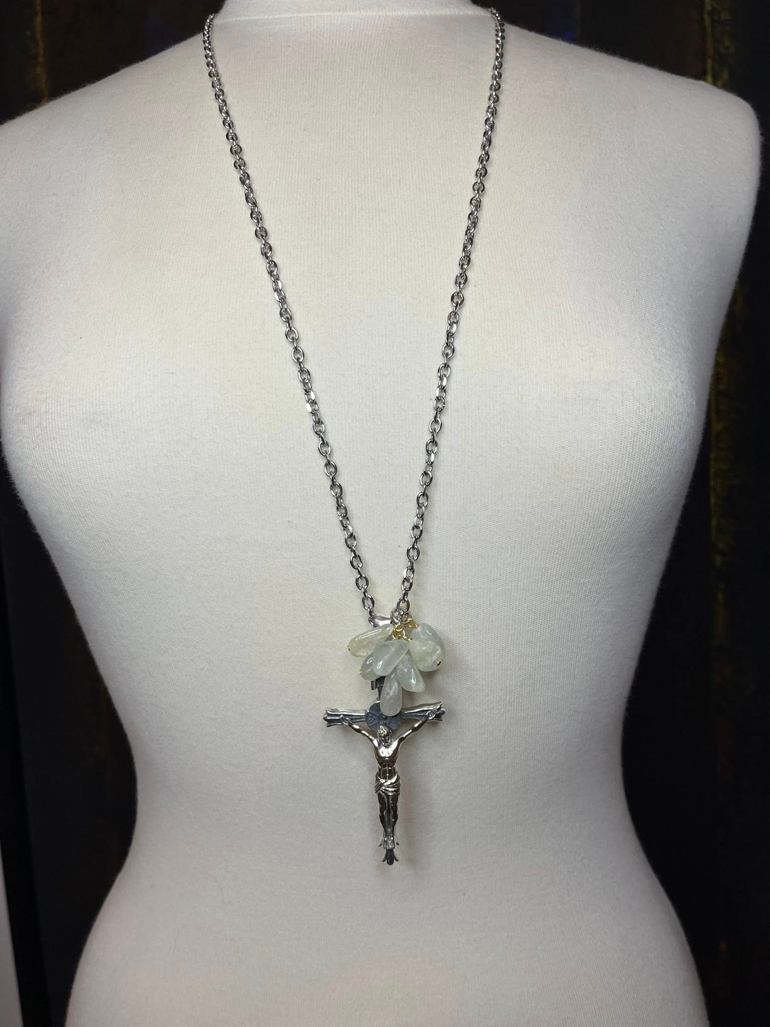 Bijou unique Sautoir de perles de culture, Crystal fumé et green améthyste Croix du Christ en inox Longueur : 80cm
